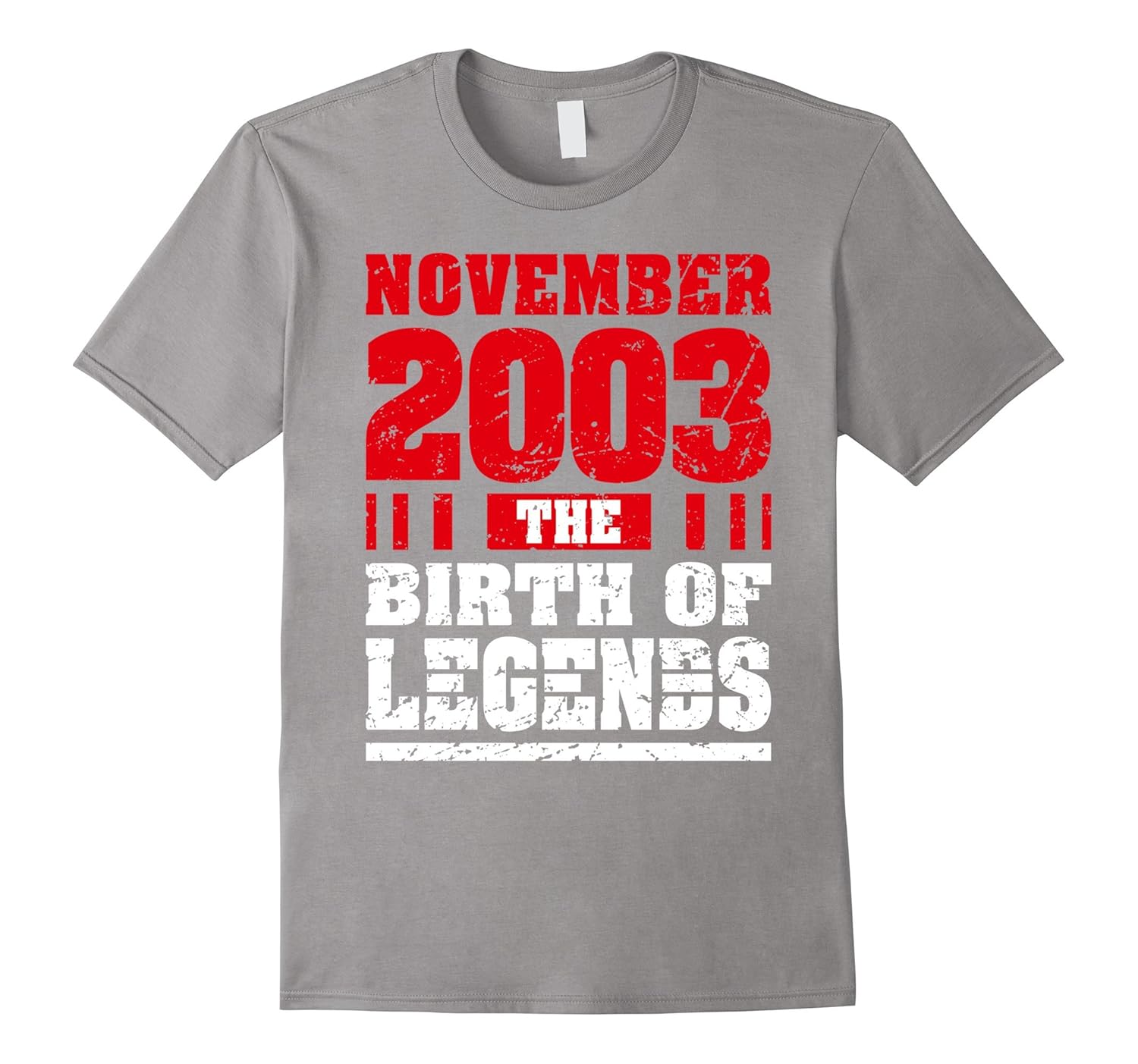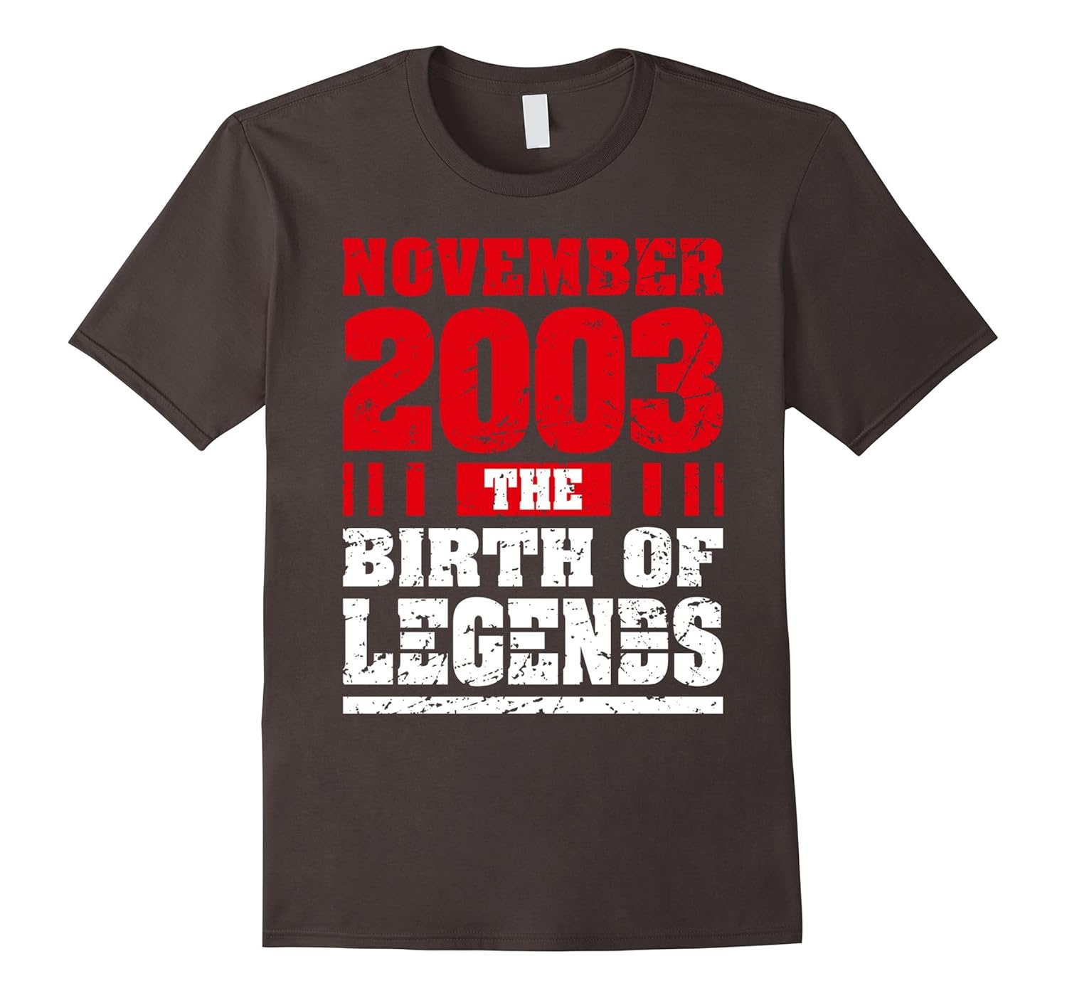 Solid colors: 100% Cotton; Heather Grey: 90% Cotton, 10% Polyester; All Other Heathers: 65% Cotton, 35% Polyester, Imported, Machine wash cold with like colors, dry low heat, Look for a cute gift for your 14-year-old boy or girl who is 14 years of being awesome and is teenager totally awesome since November 2003 also as well aged then this cool and also one of the best vintage t-shirts for teens born in November 03 . Cool addition present for birthday for him and for her age of 14 established November 2003 The Birth of Legends T Shirt with an awesome distressed graphics as for teenage boys and for girls born in 2003 in November for sons and daughters b-day. Lightweight, Classic fit, Double-needle sleeve and bottom hem