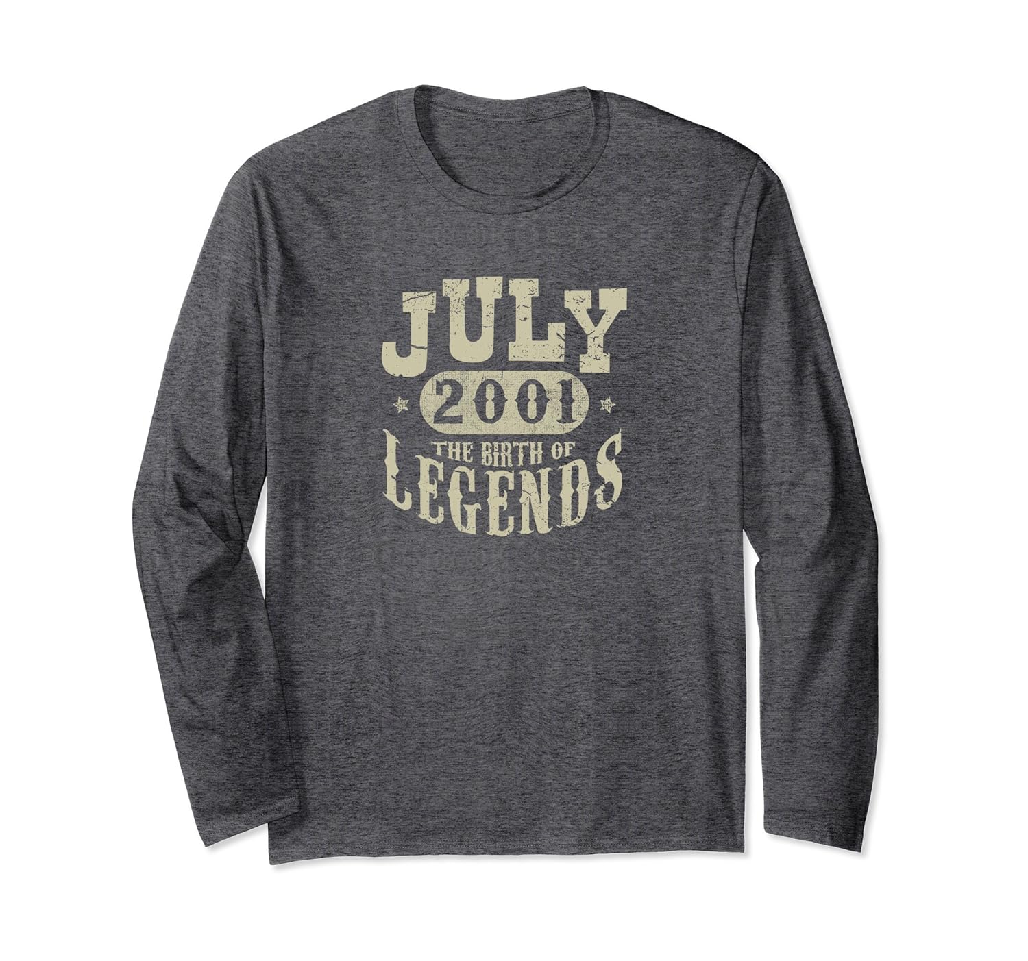 Solid colors: 100% Cotton; Heather Grey: 90% Cotton, 10% Polyester; All Other Heathers: 50% Cotton, 50% Polyester; Imported; Machine wash cold with like colors, dry low heat; 17 yrs old, July 2001 The Birth of Legends, Vintage faded effect light colored text design. Simple graphics bday gift idea for your friends, yourself, people you love and legend persons who are born in the month of July b-day Long sleeve shirt.; Lightweight, Classic fit, Double-needle sleeve and bottom hem