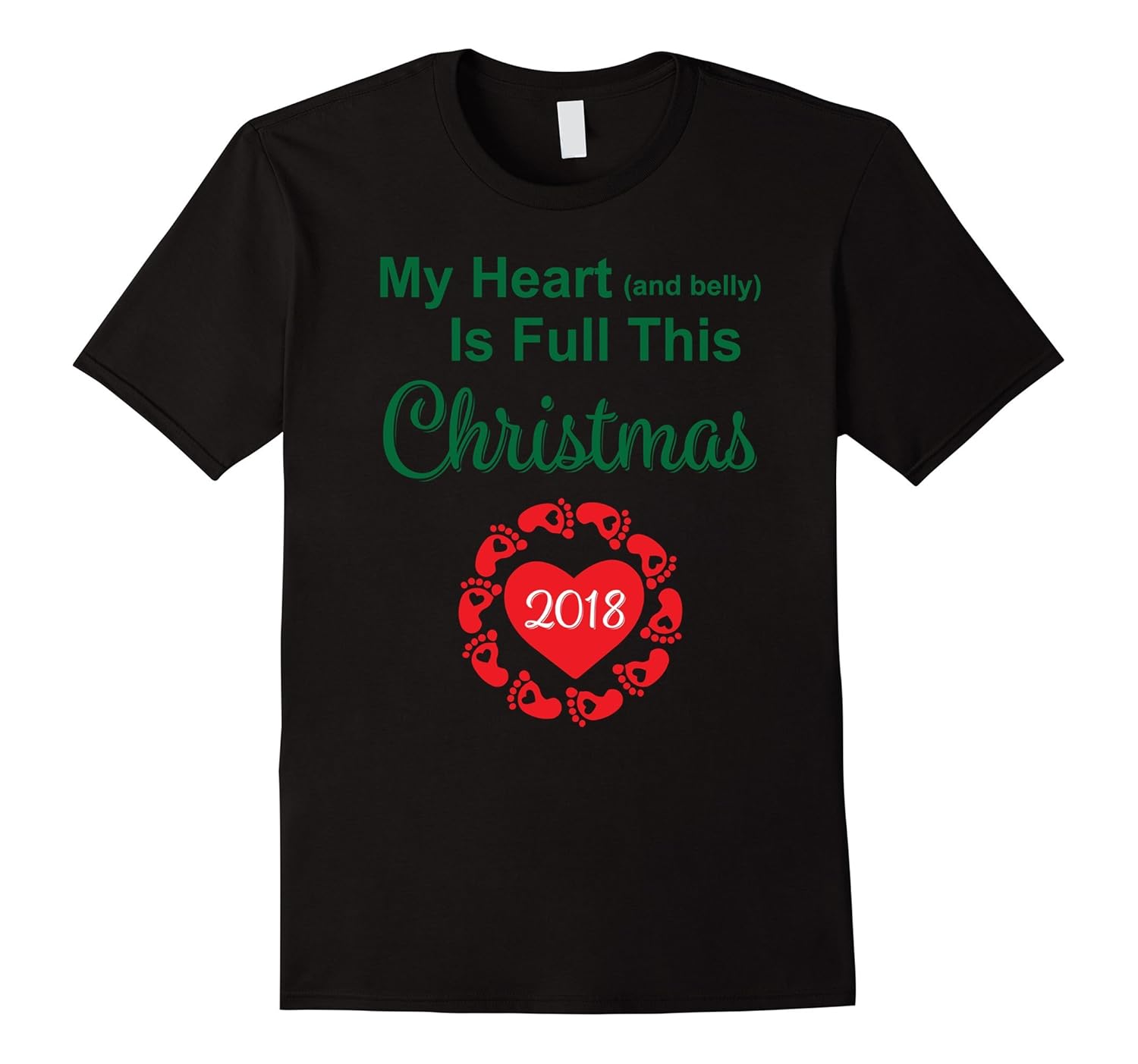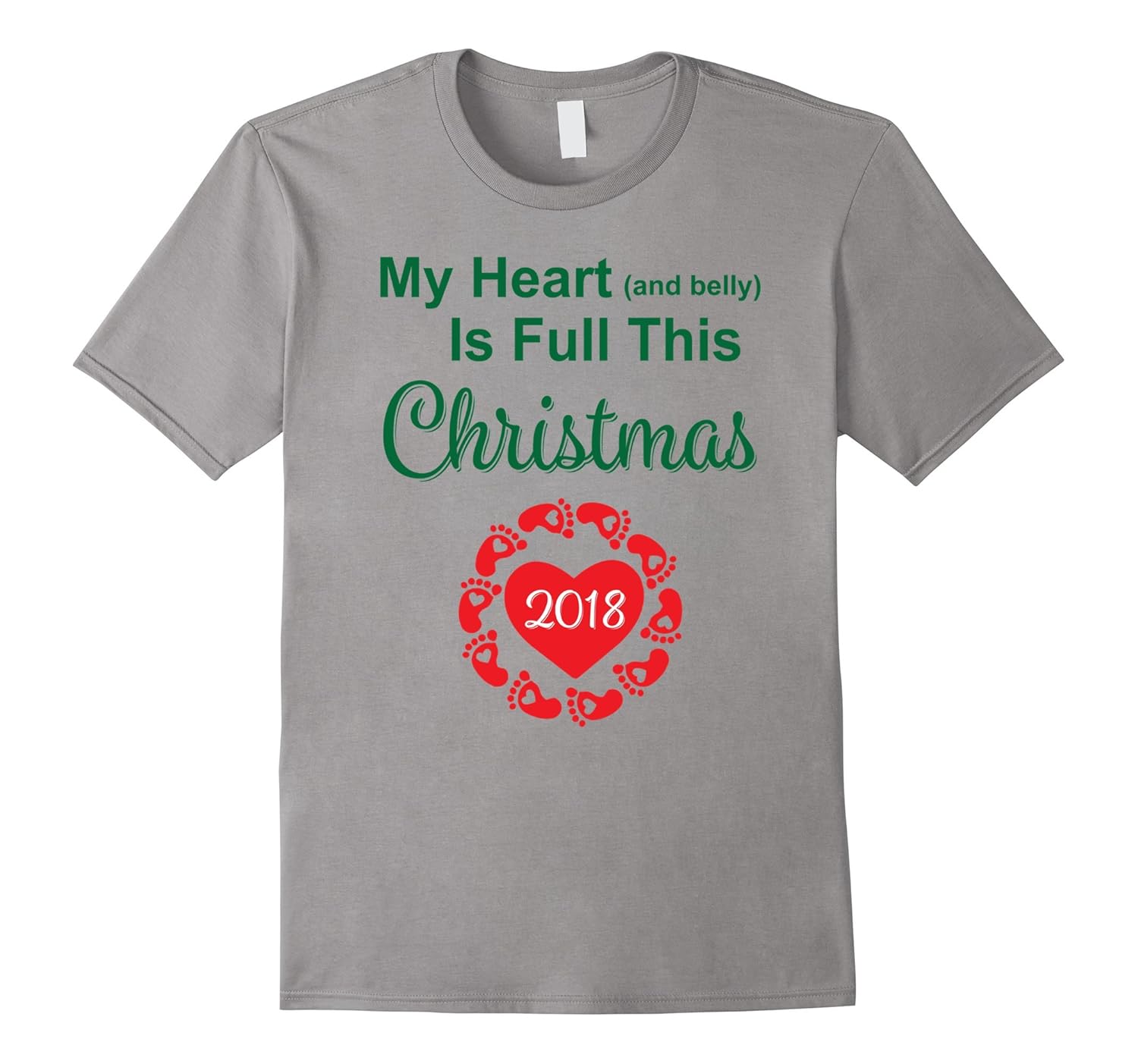 Solid colors: 100% Cotton; Heather Grey: 90% Cotton, 10% Polyester; All Other Heathers: 65% Cotton, 35% Polyester; Imported; Machine wash cold with like colors, dry low heat; Cute 2017 Christmas pregnancy shirt with baby footprints for the new mom to be. Cute way to reveal you are pregnant and expecting a baby in 2018.; My heart (and belly) is full this Christmas 2018. Perfect tshirt for a Christmas pregnancy announcement. Unique keepsake gift for your child too.; Lightweight, Classic fit, Double-needle sleeve and bottom hem