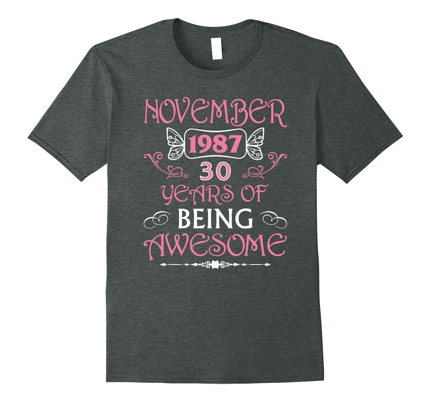 Solid colors: 100% Cotton; Heather Grey: 90% Cotton, 10% Polyester; All Other Heathers: 65% Cotton, 35% Polyester, Imported, Machine wash cold with like colors, dry low heat, 30th Birthday Gift TShirt. November 1987, 30 Years Of Being Awesome Birthday Shirt for Women and Man. Makes a nice gift for her or him. Perfect gift idea for Wife, Husband, Aunt, Uncle, Girlfriend, Friend who already becoming a Legend. Super cute design. Makes a great 30th bday gift tee for anyone born in 1987 or anyone turning 30 years old. Great for a Birthday party, Christmas, Anniversary, or any occasion year around. Best November Birthday gift for 30th b-day for women and men. Runs small so size up. Lightweight, Classic fit, Double-needle sleeve and bottom hem