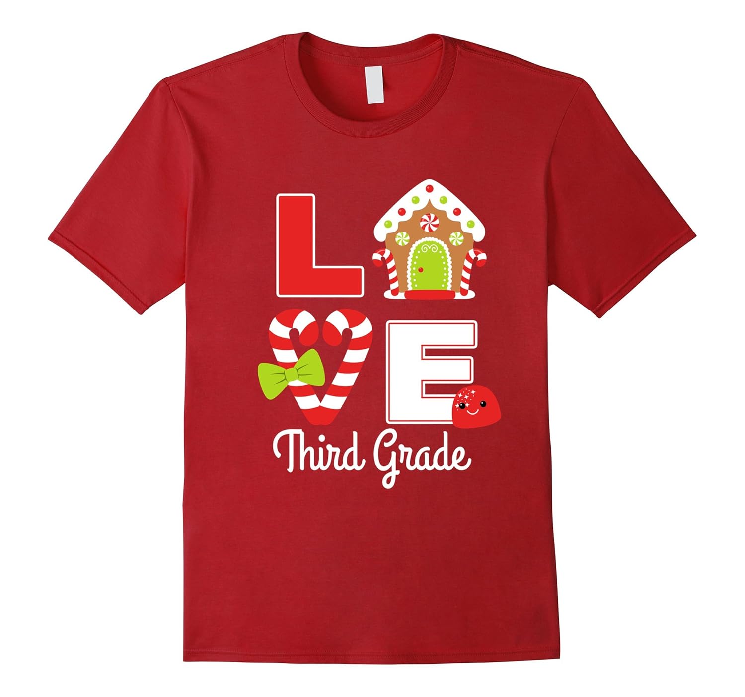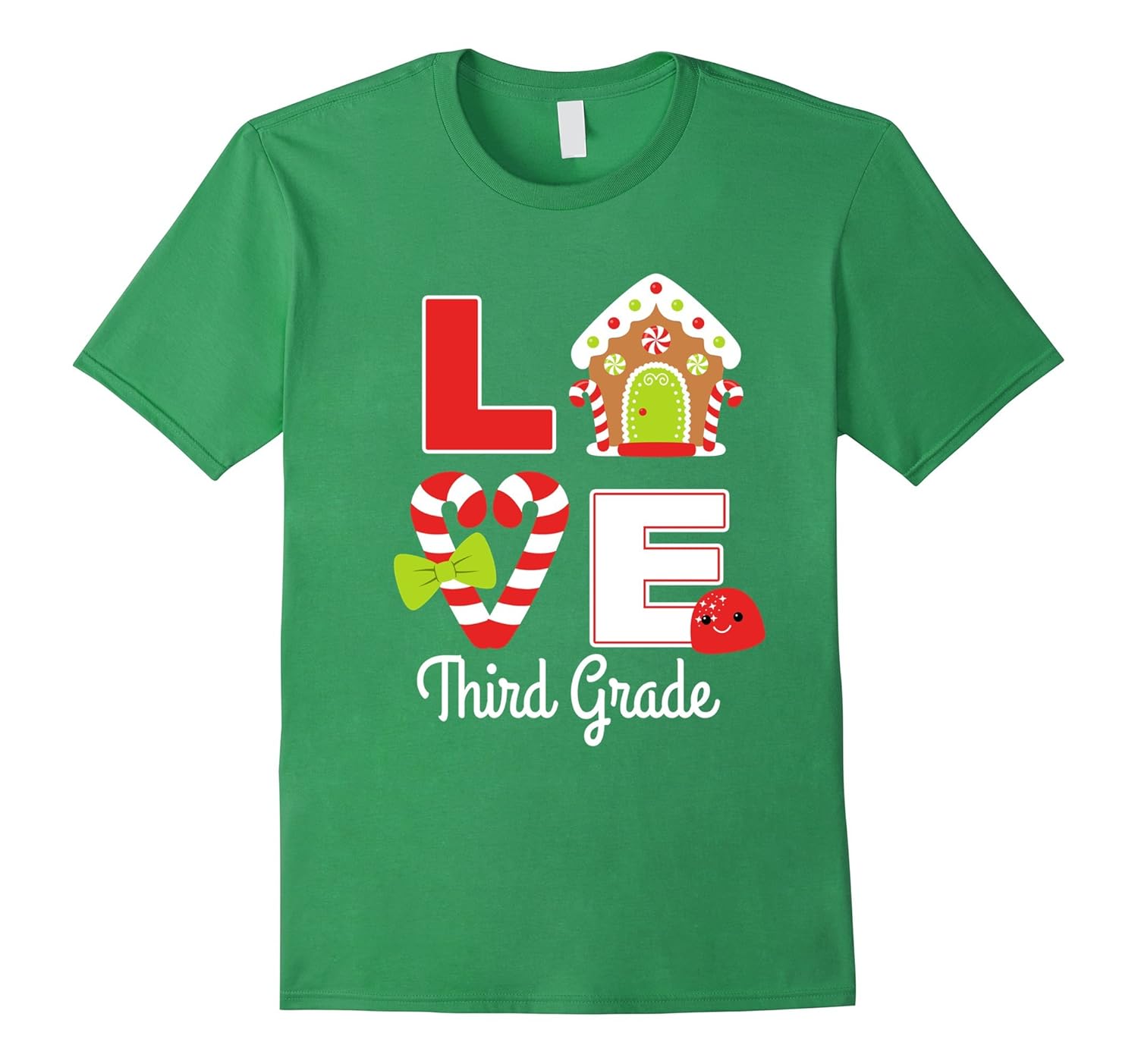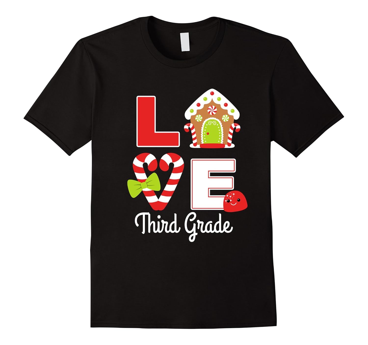 Solid colors: 100% Cotton; Heather Grey: 90% Cotton, 10% Polyester; All Other Heathers: 65% Cotton, 35% Polyester; Imported; Machine wash cold with like colors, dry low heat; Funny and cute teacher teaching shirt of cookie house, candy cane with ribbon bow and gumdrop emoji saying love third grade is a cool gift idea for little girls, 3rd grade tribe, team, counselor, assistant, kindergarten teacher, mom, TA, school principal.; Adorable Xmas present along with sweater, ornament, classroom tree light for Christmas holiday, back to school season, Thanksgiving, ugly costume challenge, graduation, birthday party. Stocking stuffer for tk, pre-k, preschool or 1st grade teacher, staff.; Lightweight, Classic fit, Double-needle sleeve and bottom hem