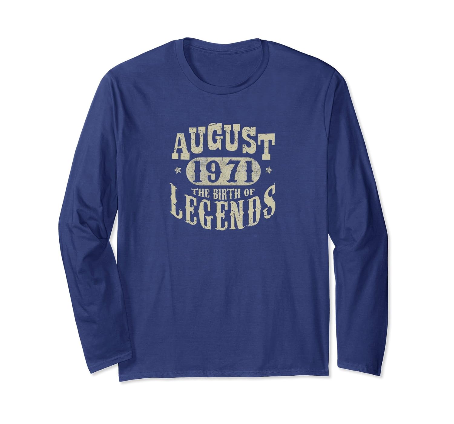 Solid colors: 100% Cotton; Heather Grey: 90% Cotton, 10% Polyester; All Other Heathers: 50% Cotton, 50% Polyester; Imported; Machine wash cold with like colors, dry low heat; 47 yrs old, August 1971 The Birth of Legends, Vintage faded effect light colored text design. Simple graphics bday gift idea for your friends, yourself, people you love and legend persons who are born in the month of August b-day Long sleeve shirt.; Lightweight, Classic fit, Double-needle sleeve and bottom hem