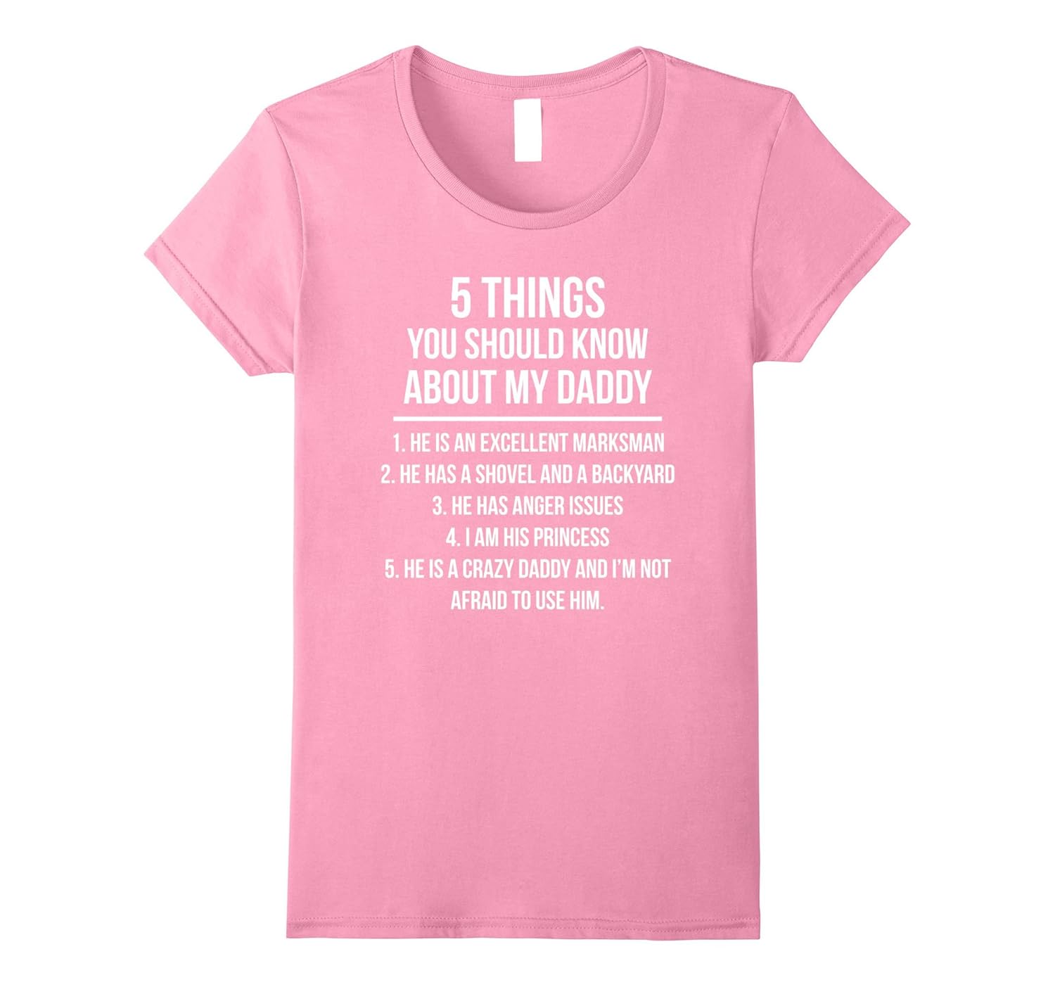 Solid colors: 100% Cotton; Heather Grey: 90% Cotton, 10% Polyester; All Other Heathers: 65% Cotton, 35% Polyester, Imported, Machine wash cold with like colors, dry low heat, 1. He is an excellent marksman 2. He has a shovel and a backyard 3. He has anger issues 4. I am his princess 5. He is a crazy daddy and im not afraid to use him. Daughter shirt for a protective father of a princess. Awesome funny humor, sarcastic gift tee shirt comes in men, women, adult and; kids sizes. Friends family t-shirt with creative quotes sayings is perfect for birthdays, anniversaries, vacations and; any gift giving occasion. Please order a size up for a loose fit, Lightweight, Classic fit, Double-needle sleeve and bottom hem