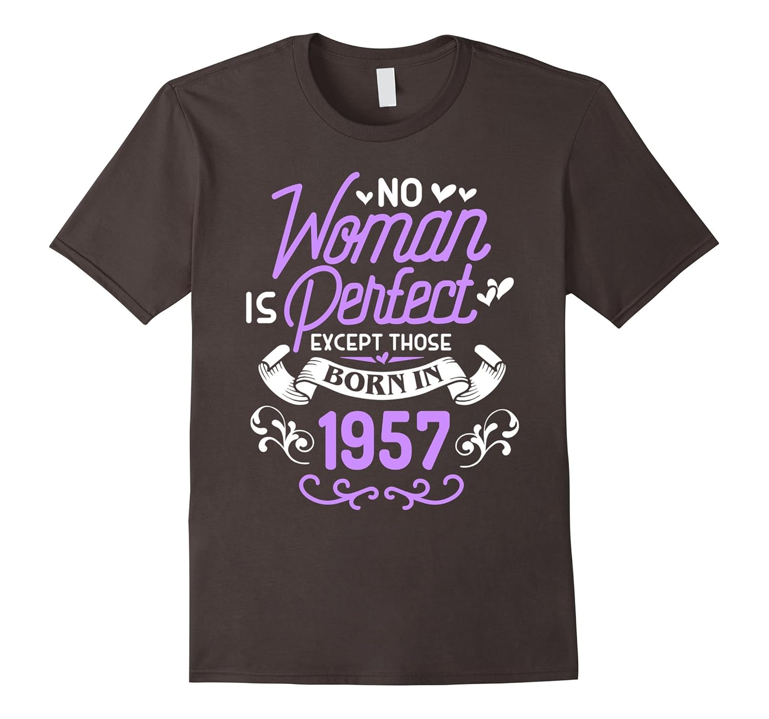 Solid colors: 100% Cotton; Heather Grey: 90% Cotton, 10% Polyester; All Other Heathers: 65% Cotton, 35% Polyester, Imported, Machine wash cold with like colors, dry low heat, 60th Birthday Gift Shirt, No Woman is Perfect Except Those Who Are Born In 1957 T-Shirt for Women. Birthday gift idea for people born in 1957 or anyone who is turning 60 years old, vintage style graphic tee. Perfect for a birthday party. Lightweight, Classic fit, Double-needle sleeve and bottom hem