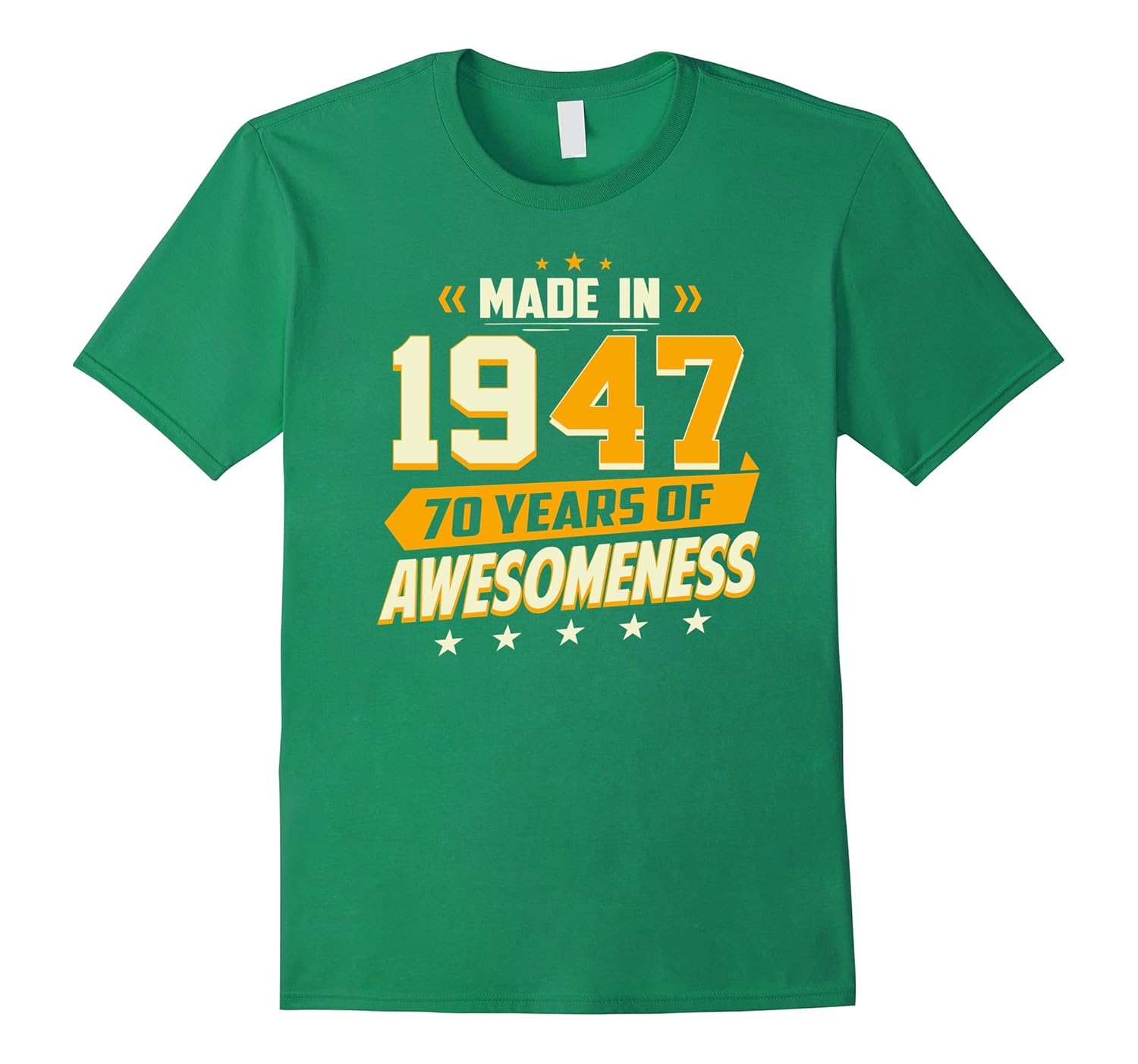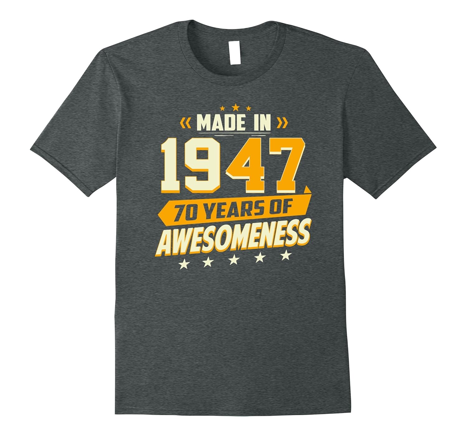 Solid colors: 100% Cotton; Heather Grey: 90% Cotton, 10% Polyester; All Other Heathers: 65% Cotton, 35% Polyester, Imported, Machine wash cold with like colors, dry low heat, An awesome classic vintage retro tee for legends saying Made In 1947 70 Years Of Awesomeness in distressed weathered style! An amazing, cool tshirt for men or women turning seventy years old born in ”47 and; been rocking since birth!, A great happy 70th birthday gift idea or a fun Christmas present for your retired mom, dad, husband, wife, daughter, son, uncle, aunt, grandpa or grandma! Grab this funny, sarcastic outfit now and; wear it proud to parties, events and; family gatherings!, Lightweight, Classic fit, Double-needle sleeve and bottom hem