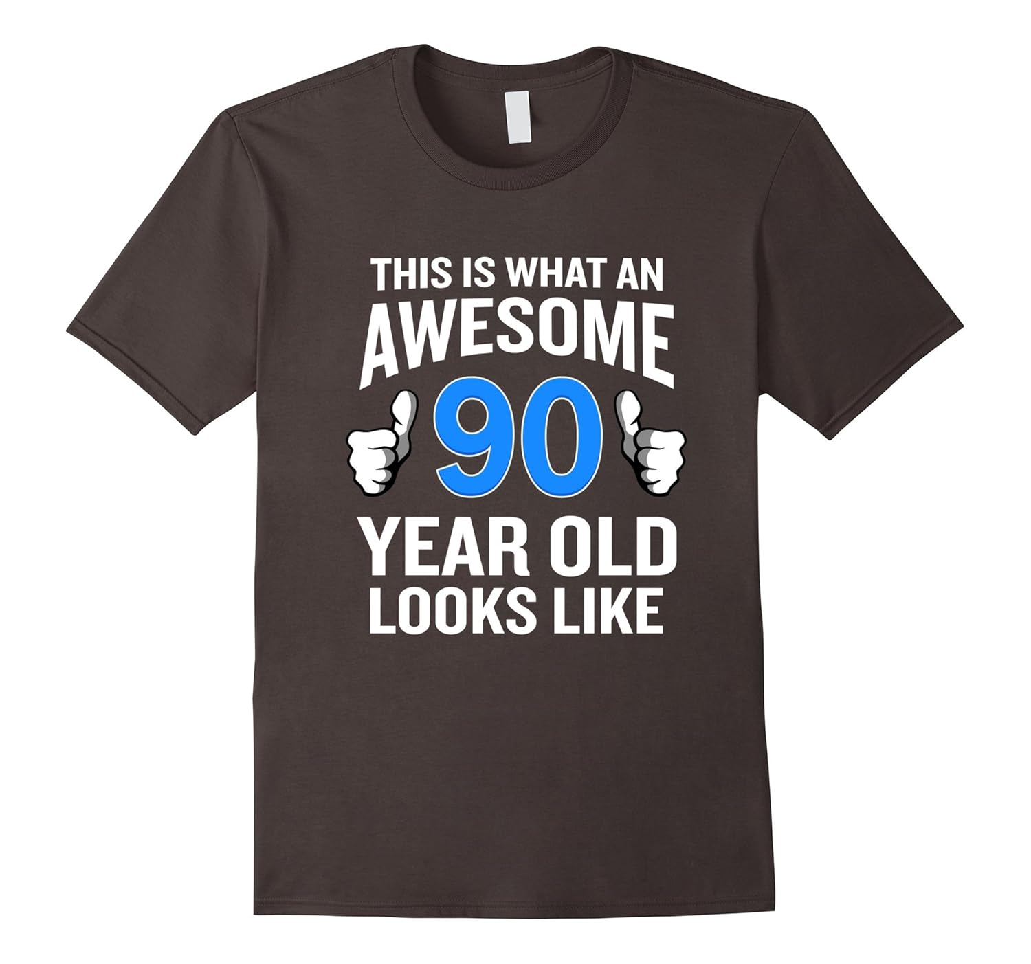 Solid colors: 100% Cotton; Heather Grey: 90% Cotton, 10% Polyester; All Other Heathers: 65% Cotton, 35% Polyester, Imported, Machine wash cold with like colors, dry low heat, An awesome novelty graphic tee that reads This Is What An Awesome 90 Year Old Looks Like in English text with two thumbs pointing up! Any grandad, grandpa or grandma born in 1927 will love this funny shirt gag!, A fun retirement gift idea your amazing mom, dad or senior friends will enjoy! Makes the perfect 90th birthday present for any grandfather or grandmother to wear at parties, family gatherings or any occasion! Don”t wait, get this hilarious tshirt now!, Lightweight, Classic fit, Double-needle sleeve and bottom hem