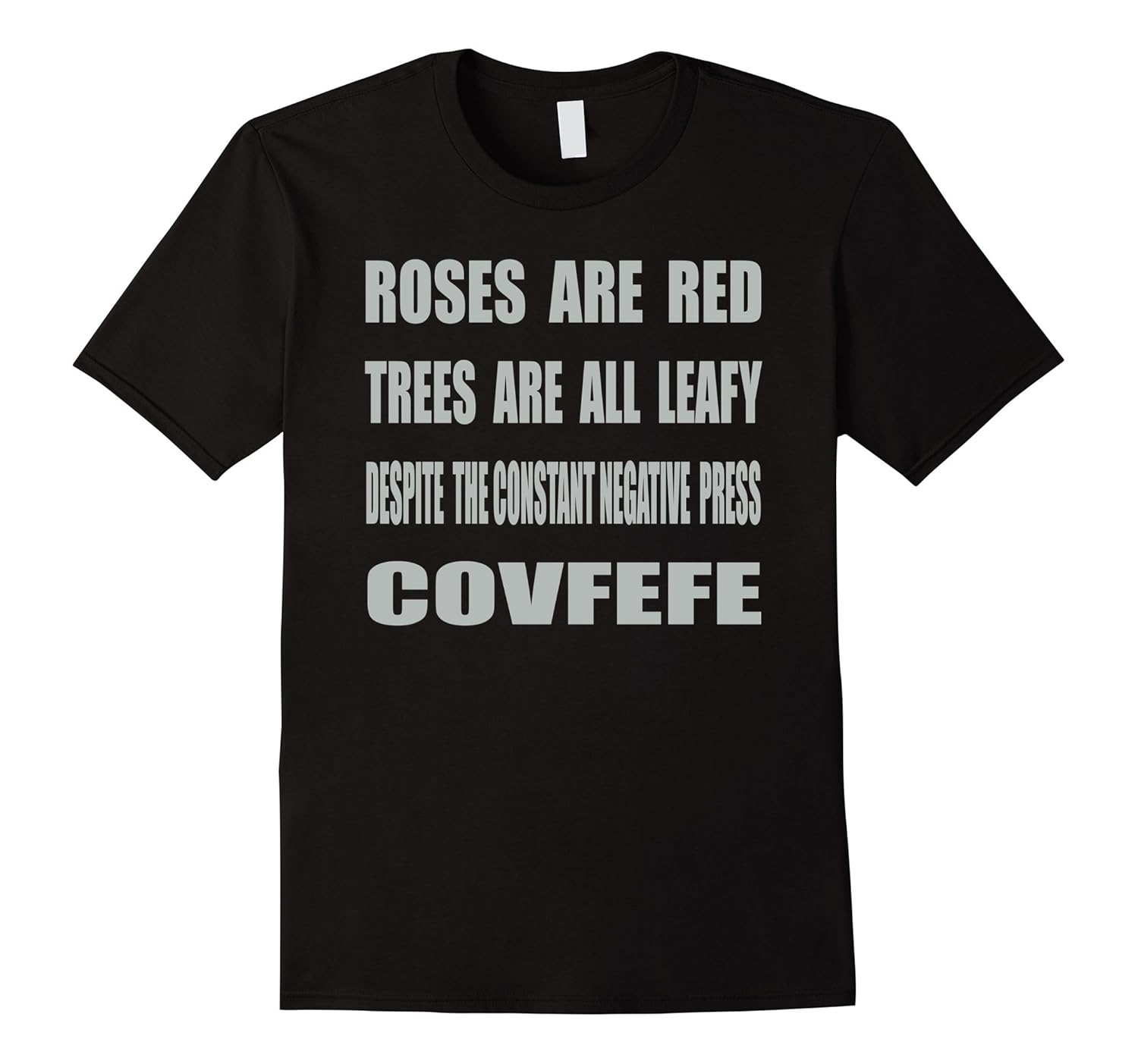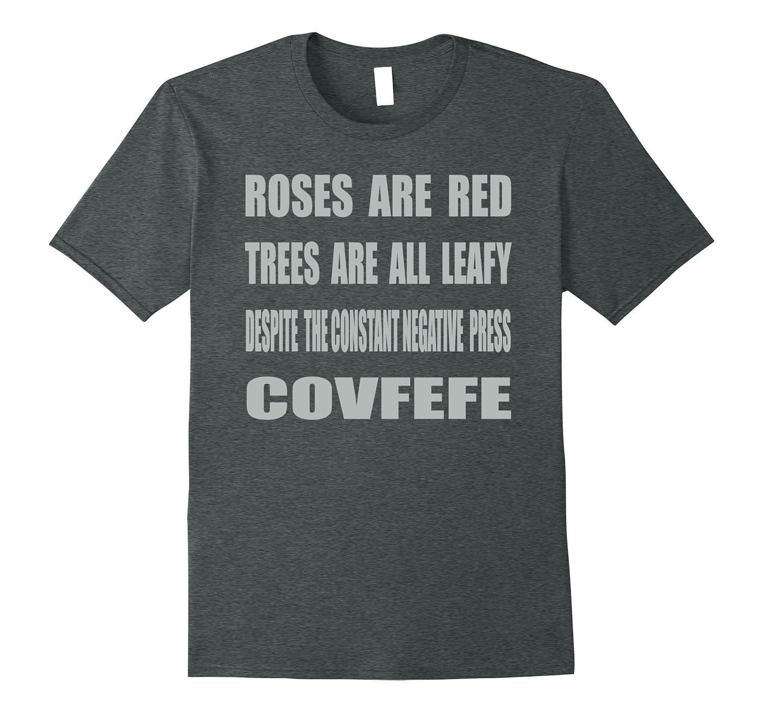 Solid colors: 100% Cotton; Heather Grey: 90% Cotton, 10% Polyester; All Other Heathers: 65% Cotton, 35% Polyester, Imported, Machine wash cold with like colors, dry low heat, Roses are Red. Trees are all Leafy. Despite The Constant Negative Press. covfefe, Please Order A Size Up For A Looser Fit For This Awesome T Shirt! Click “Add-to-cart” Now and order a great humorous unique gift of apparel Today!, Lightweight, Classic fit, Double-needle sleeve and bottom hem