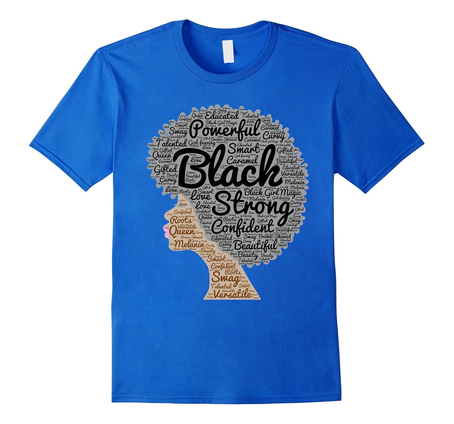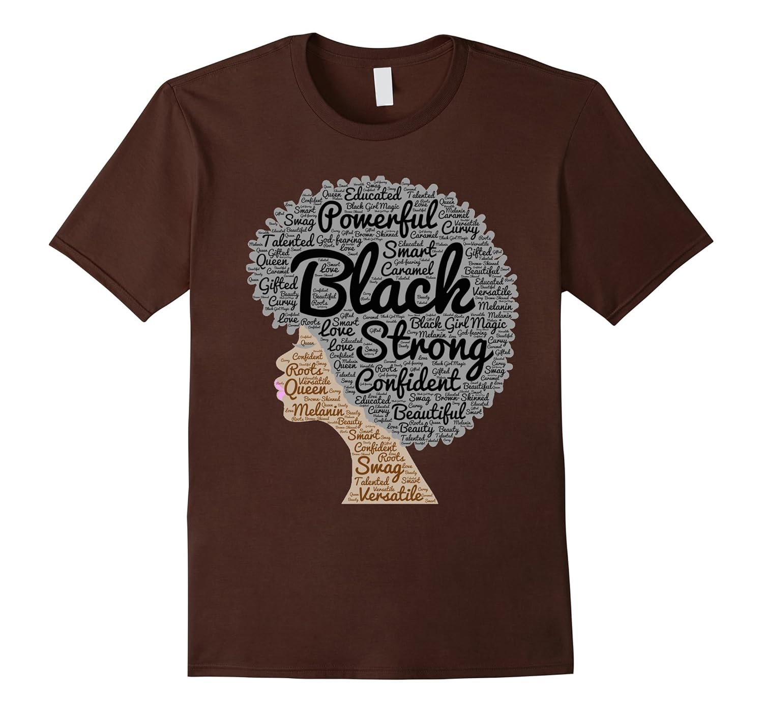 Solid colors: 100% Cotton; Heather Grey: 90% Cotton, 10% Polyester; All Other Heathers: 65% Cotton, 35% Polyester; Imported; Machine wash cold with like colors, dry low heat; African American woman with natural hair afro made up of words such as strong, black, confident, magic, educated, melanin, curvy, queen. Great birthday, Black History Month idea for a proud black woman. Also nice shirt for kids or little girls.; Great tshirt for brown skinned ladies who embrace their kinks, melanin and black heritage. Nice Christmas gift idea for your wife, mom, sister or daughter.; Lightweight, Classic fit, Double-needle sleeve and bottom hem