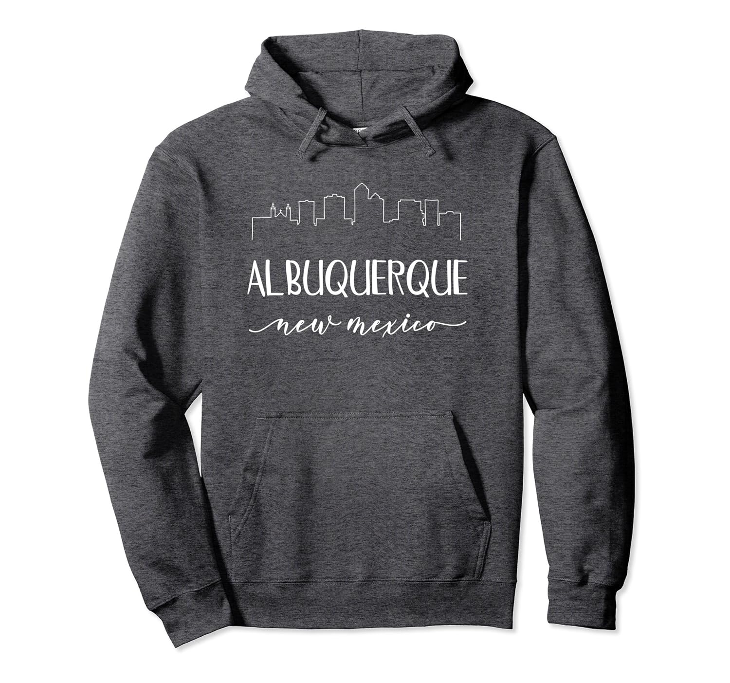 Solid colors: 80% Cotton, 20% Polyester; Heather Grey: 78% Cotton, 22% Poly; Dark Heather: 50% Cotton, 50% Polyester; Imported; Machine wash cold with like colors, dry low heat; Original sketched and digitized calligraphy design of the skyline and landmarks in downtown Albuquerque, New Mexico. Perfect casual wear hooded sweatshirt for New Mexico state residents or tourists of the beautiful city of Albuquerque.; This Albuquerque New Mexico Hoodie – Calligraphy State Shirt is a great hoodie gift shirt for a friend or family relative for a birthday, Christmas, or other holiday! Great for the cooler winter months in the southwest of the united states.; 8.5 oz, Classic fit, Twill-taped neck