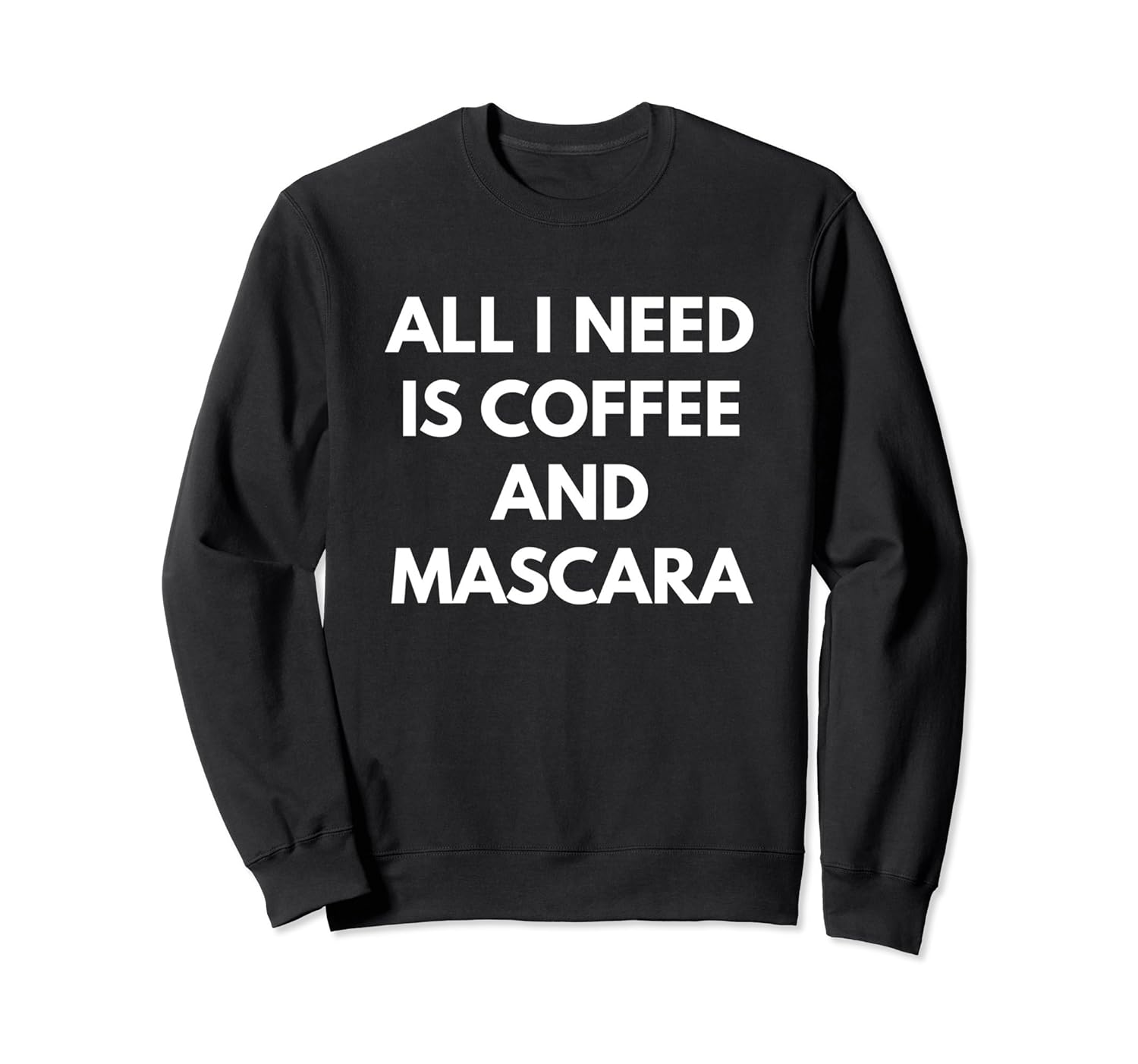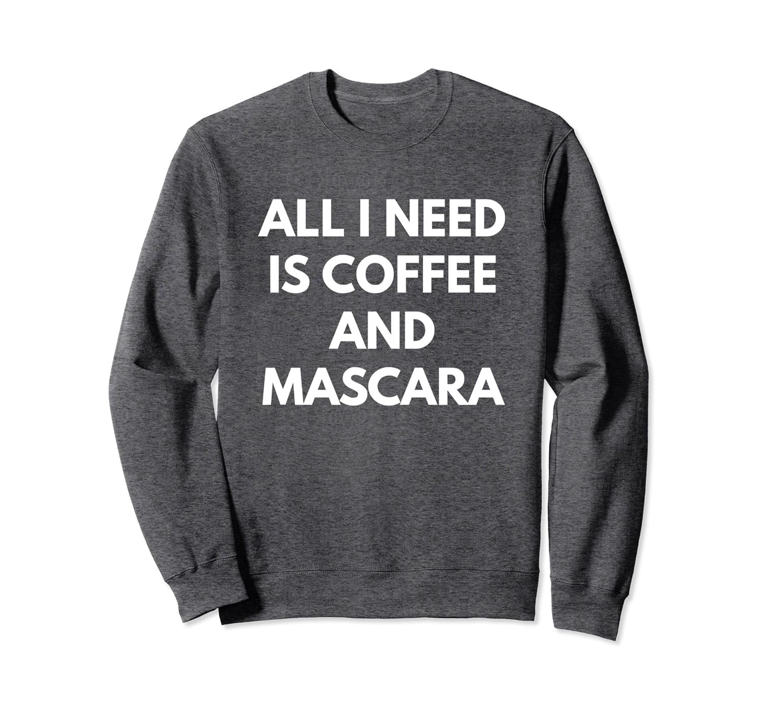 Solid colors: 80% Cotton, 20% Polyester; Heather Grey: 78% Cotton, 22% Poly; Dark Heather: 50% Cotton, 50% Polyester; Imported; Machine wash cold with like colors, dry low heat; Funny sarcastic joke shirt that will get your friends and family laughing.; All I Need Is Coffee And Mascara – Sweatshirt sizes runs small. We recommend ordering a size up. Please see the sizing chart image for more details.; 8.5 oz, Classic fit, Twill-taped neck