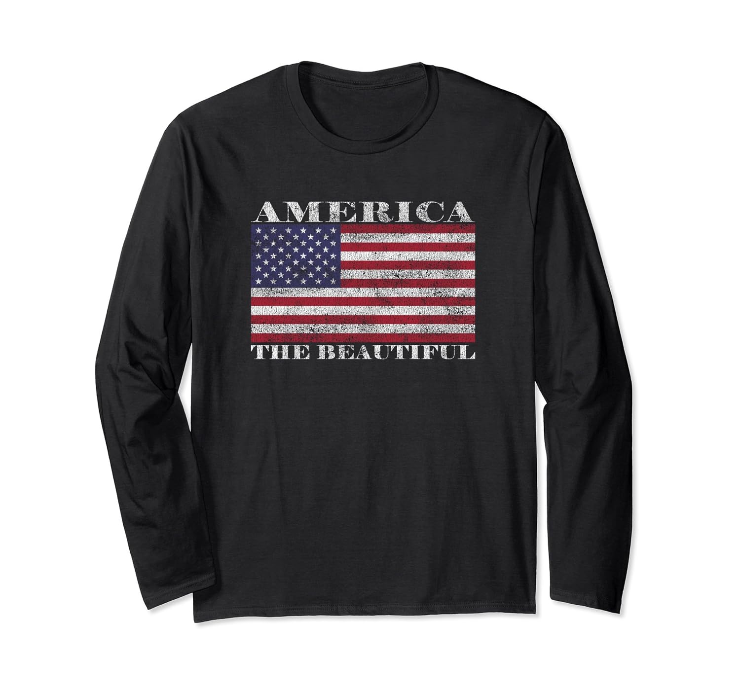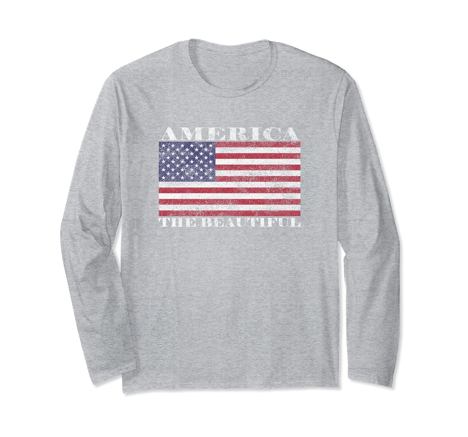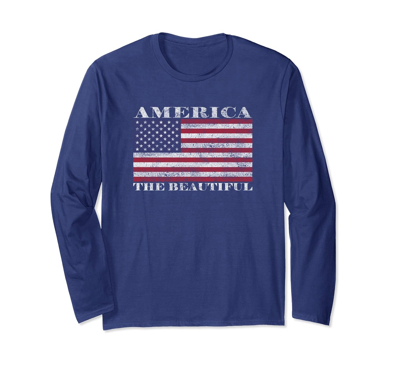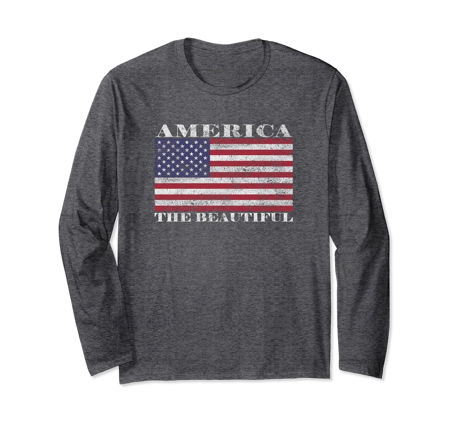 Solid colors: 100% Cotton; Heather Grey: 90% Cotton, 10% Polyester; All Other Heathers: 50% Cotton, 50% Polyester; Imported; Machine wash cold with like colors, dry low heat; Our America The Beautiful American Flag July 4th Long Sleeve T-shirt is the perfect tshirt for true patriots who love this beautiful country, the United States of America. Its a great gift idea for a birthday, Christmas, or the fourth of July.; People who like Independence Day, the 4th of July, or patriotic songs like our National Anthem will love this long sleeve tee shirt. Great present for Men, Women and Kids.; Lightweight, Classic fit, Double-needle sleeve and bottom hem