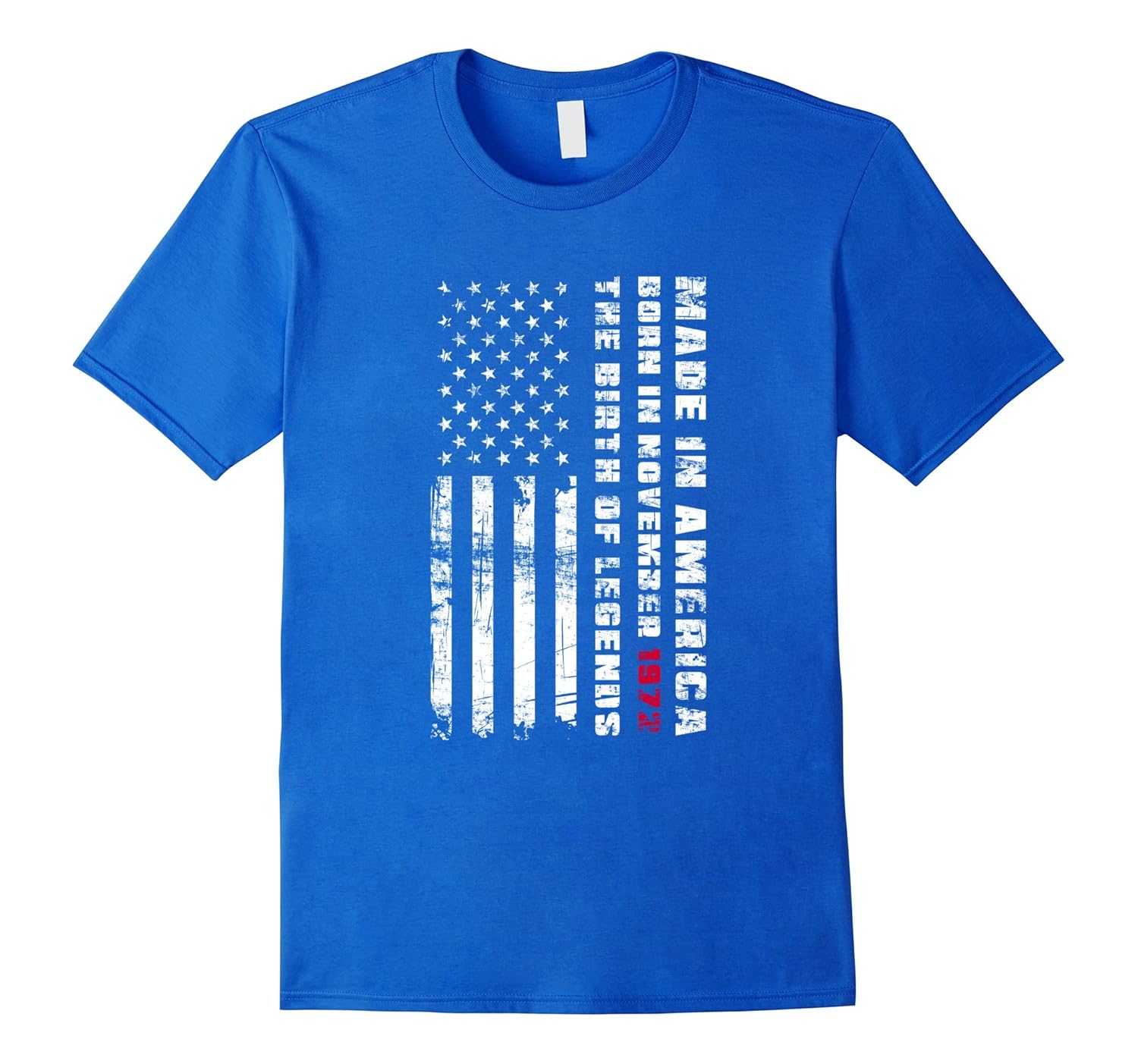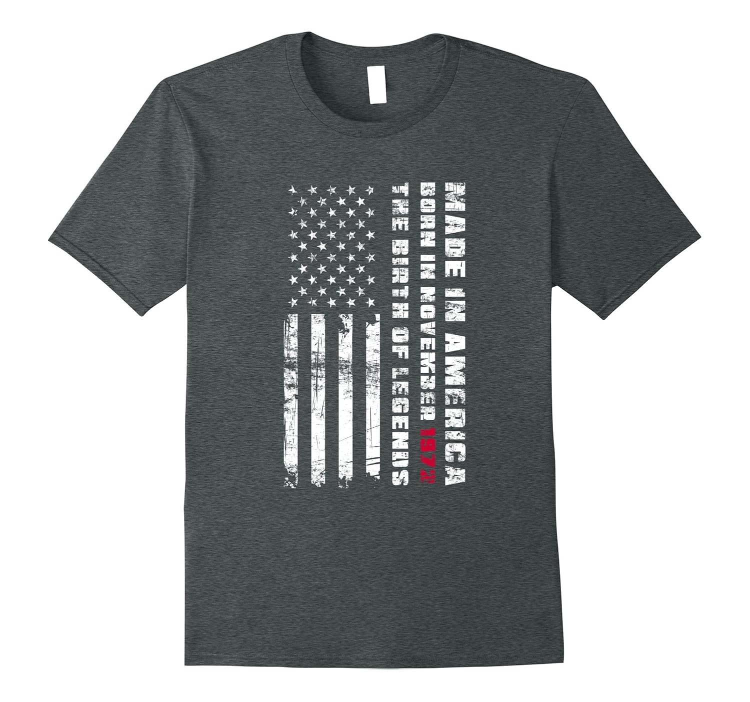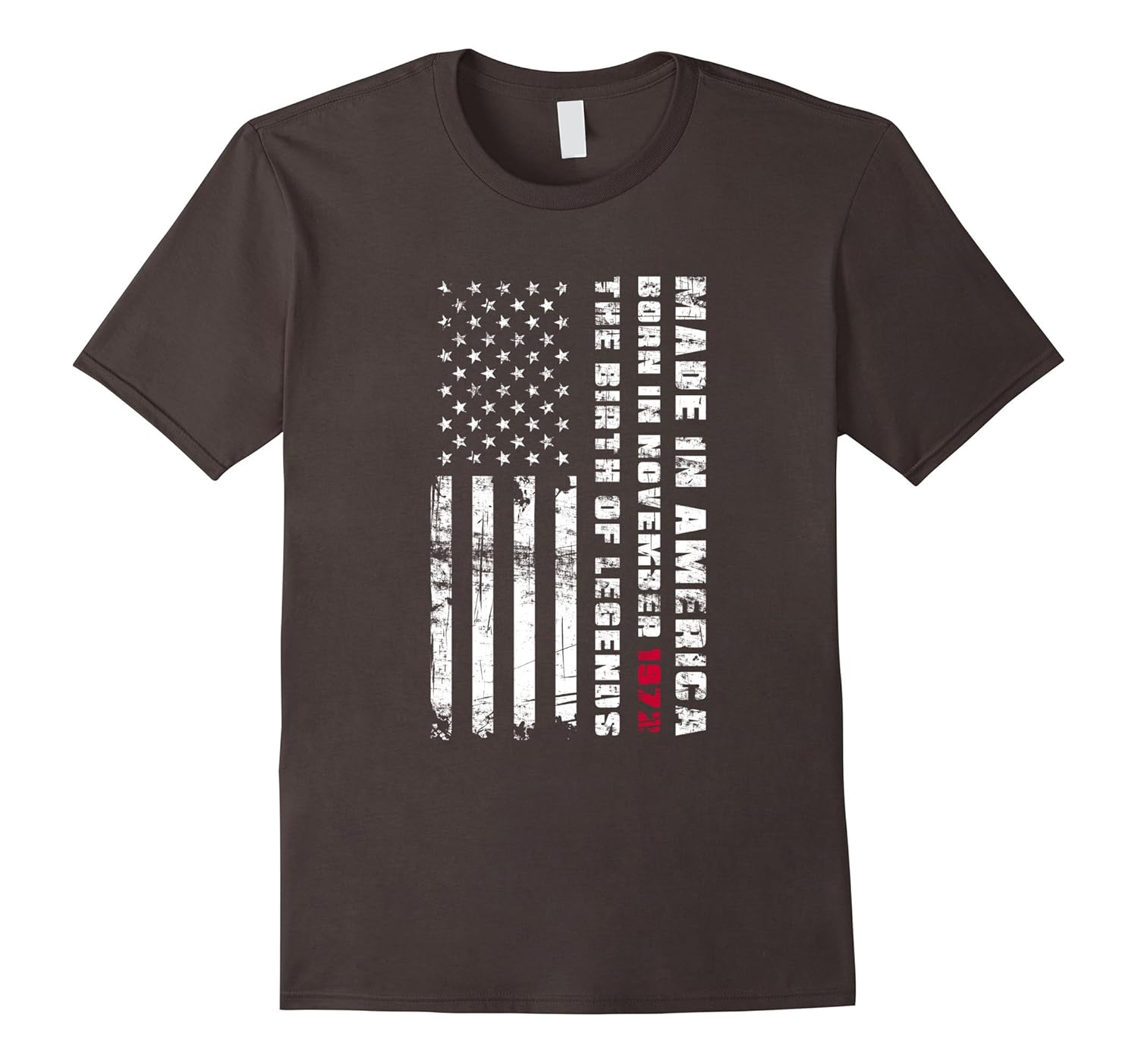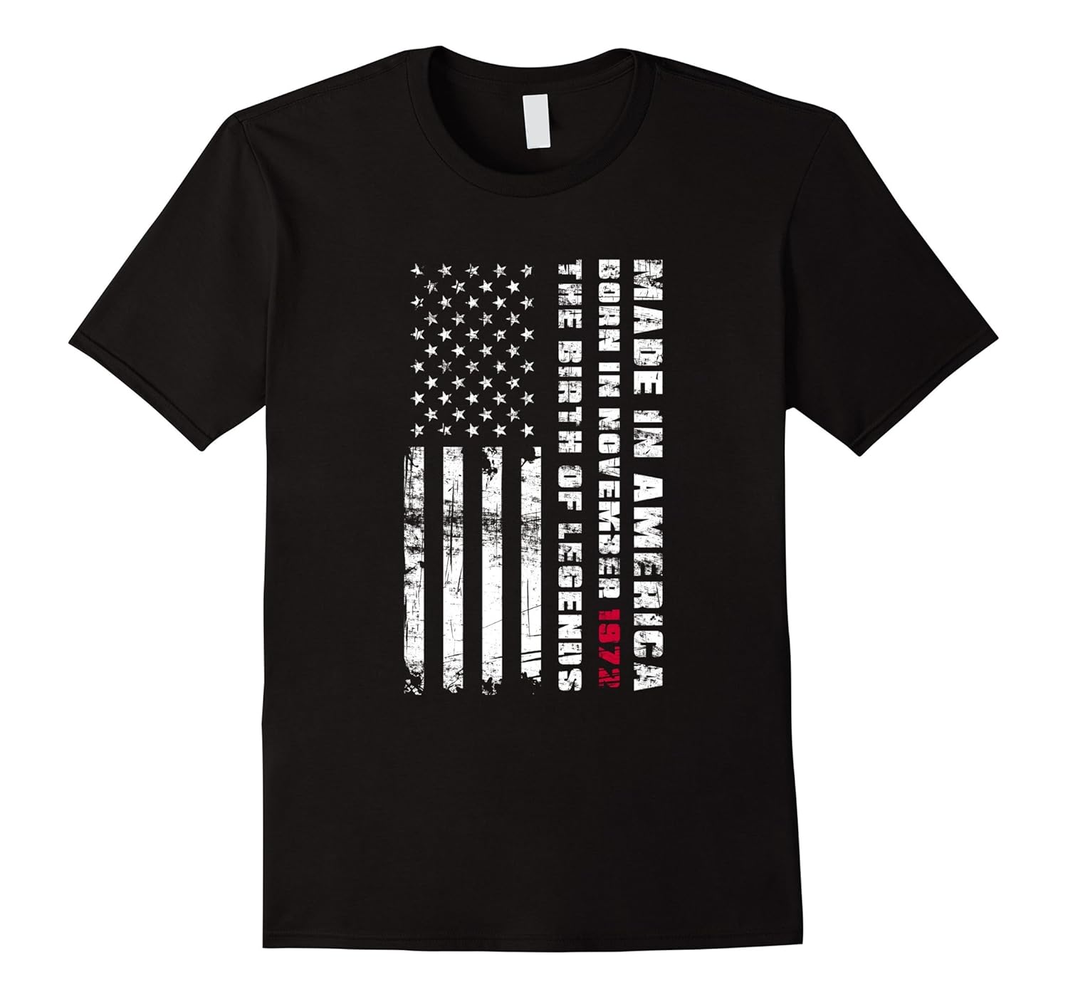 Solid colors: 100% Cotton; Heather Grey: 90% Cotton, 10% Polyester; All Other Heathers: 65% Cotton, 35% Polyester, Imported, Machine wash cold with like colors, dry low heat, Perfect patriotic gift idea for a woman or man born in November 1972 and who loves Tees with a grunge American flag with 50 stars. Great gift for a man or lady turning 45 years old. Wonderful gift for 45th birthday. One of a kind, genuine design that makes a great present for your beloved son, daughter, father, mother, brother, sister, niece, nephew or friend. Lightweight, Classic fit, Double-needle sleeve and bottom hem