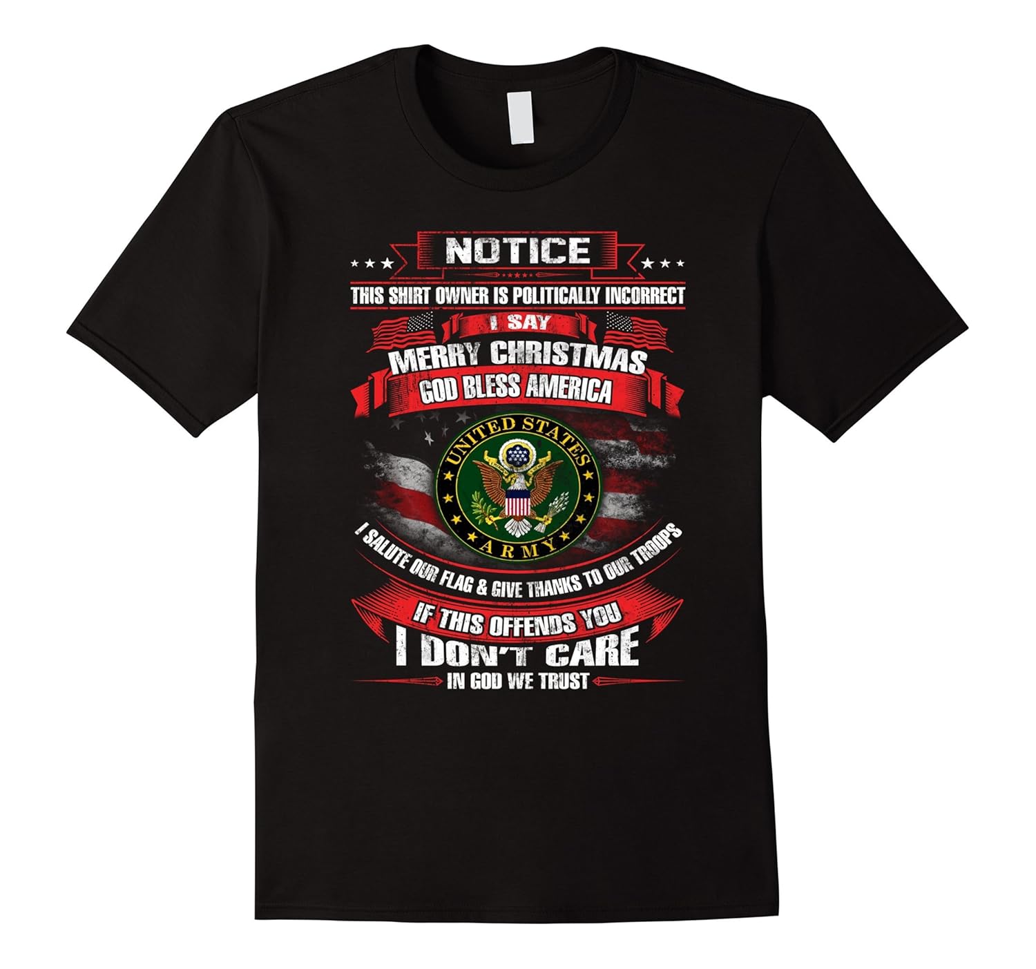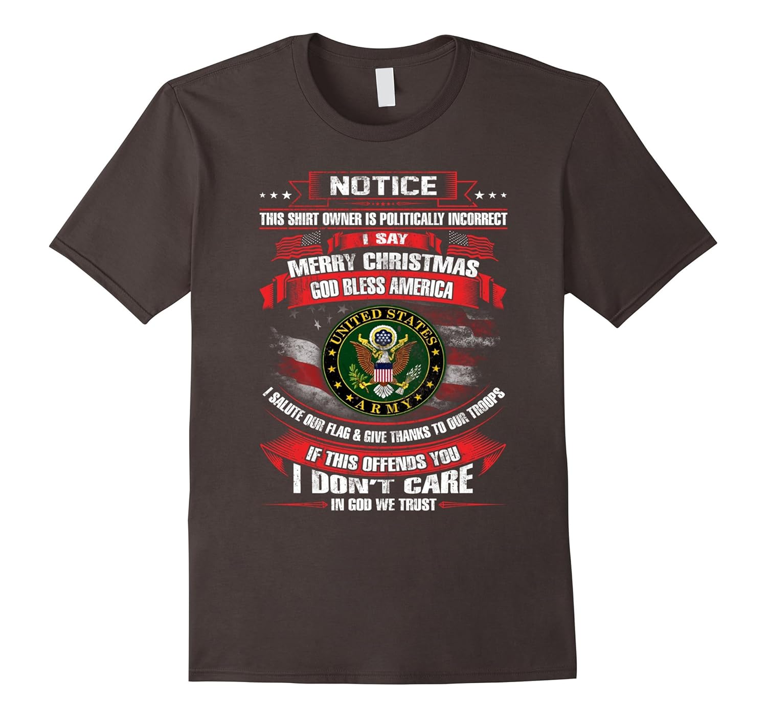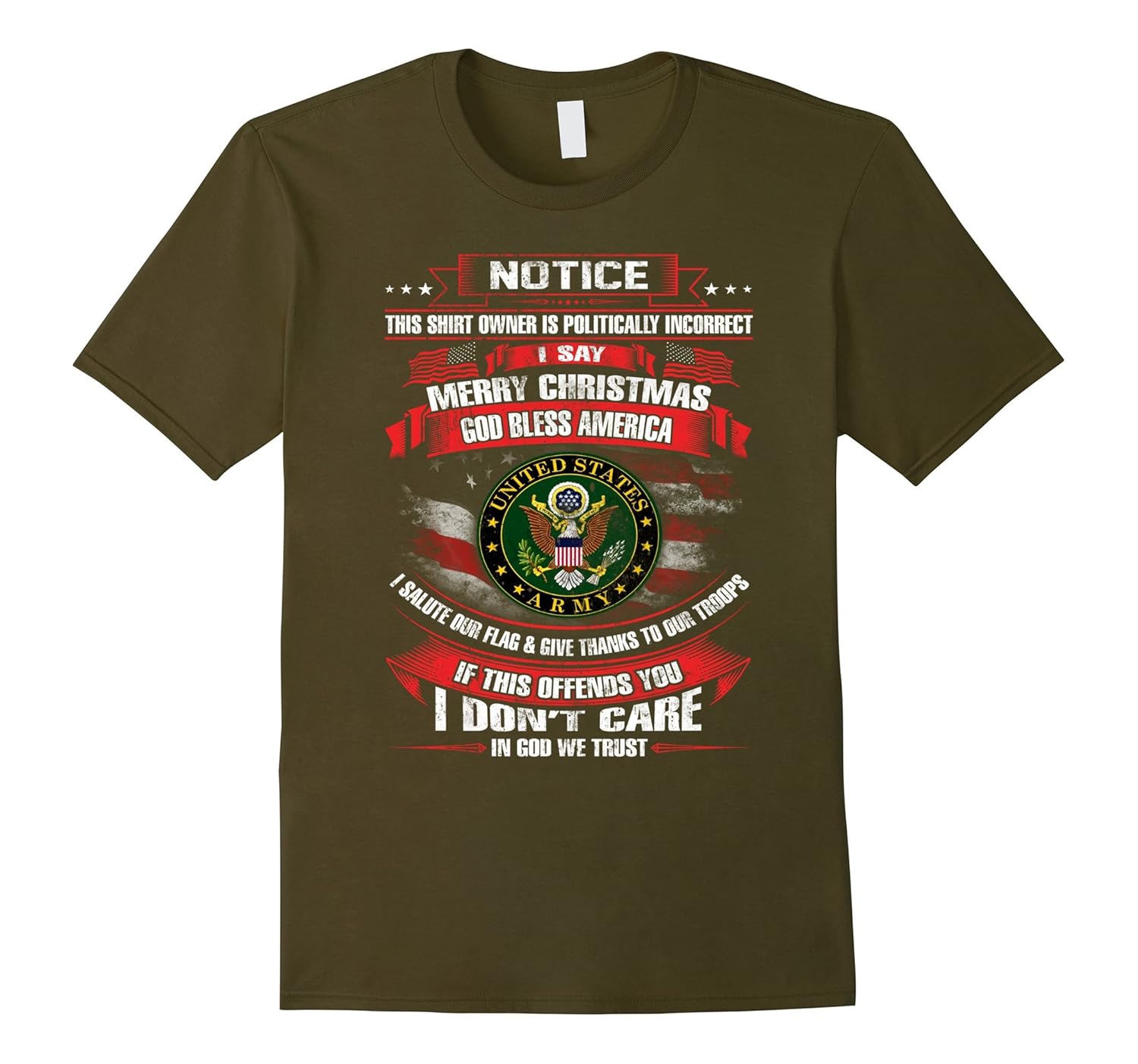 Solid colors: 100% Cotton; Heather Grey: 90% Cotton, 10% Polyester; All Other Heathers: 65% Cotton, 35% Polyester, Imported, Machine wash cold with like colors, dry low heat, Army Veteran,Army Veterans,Army Veterans shirt, Army Veterans t shirt,Army Veteran tee shirt,Army Veteran tee,veteran shirt army, Notice This shirt owner is politically incorrect,i say merry christmas,god bless america, i salute our flag and; give thanks to our troops,if this offends you,i don”t care,in god we trust. Lightweight, Classic fit, Double-needle sleeve and bottom hem