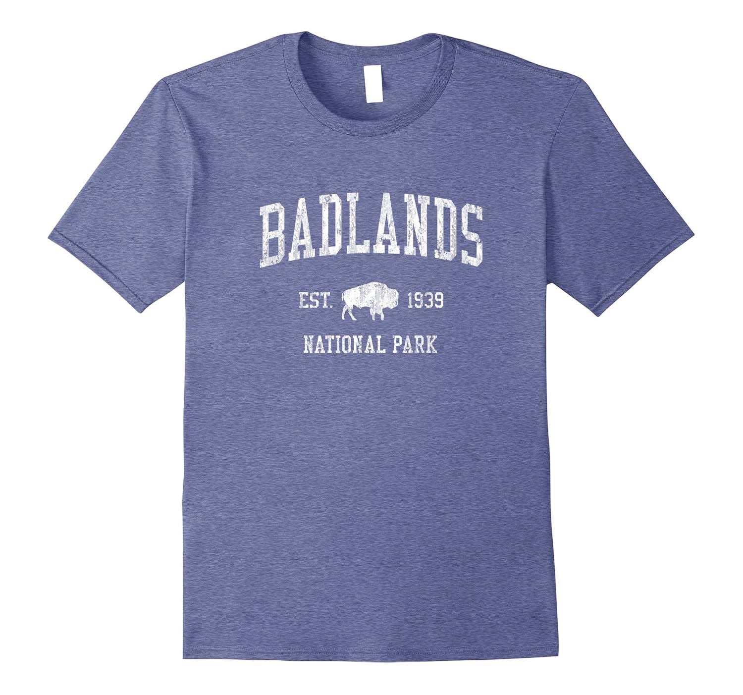 Solid colors: 100% Cotton; Heather Grey: 90% Cotton, 10% Polyester; All Other Heathers: 65% Cotton, 35% Polyester, Imported, Machine wash cold with like colors, dry low heat, Vintage Badlands T-Shirt – Order a Size Up if You Prefer a Relaxed Fitted Tee, Badlands National Park T-Shirt with buffalo/bison sports design and; year established in South Dakota old school exclusively retro by Jim Shorts, Lightweight, Classic fit, Double-needle sleeve and bottom hem