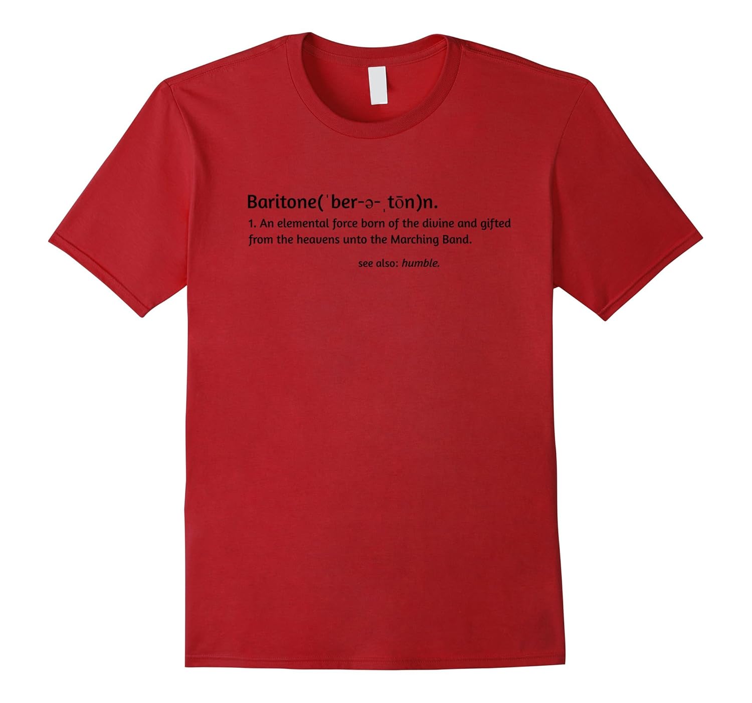 Solid colors: 100% Cotton; Heather Grey: 90% Cotton, 10% Polyester; All Other Heathers: 65% Cotton, 35% Polyester, Imported, Machine wash cold with like colors, dry low heat, Baritone truly is God”s gift to marching band. Show the world your pride in being a great baritonist with this hilarious tee. Baritone defined for the ages! Be proud to show who you are and what you do with this awesome shirt. Lightweight, Classic fit, Double-needle sleeve and bottom hem
