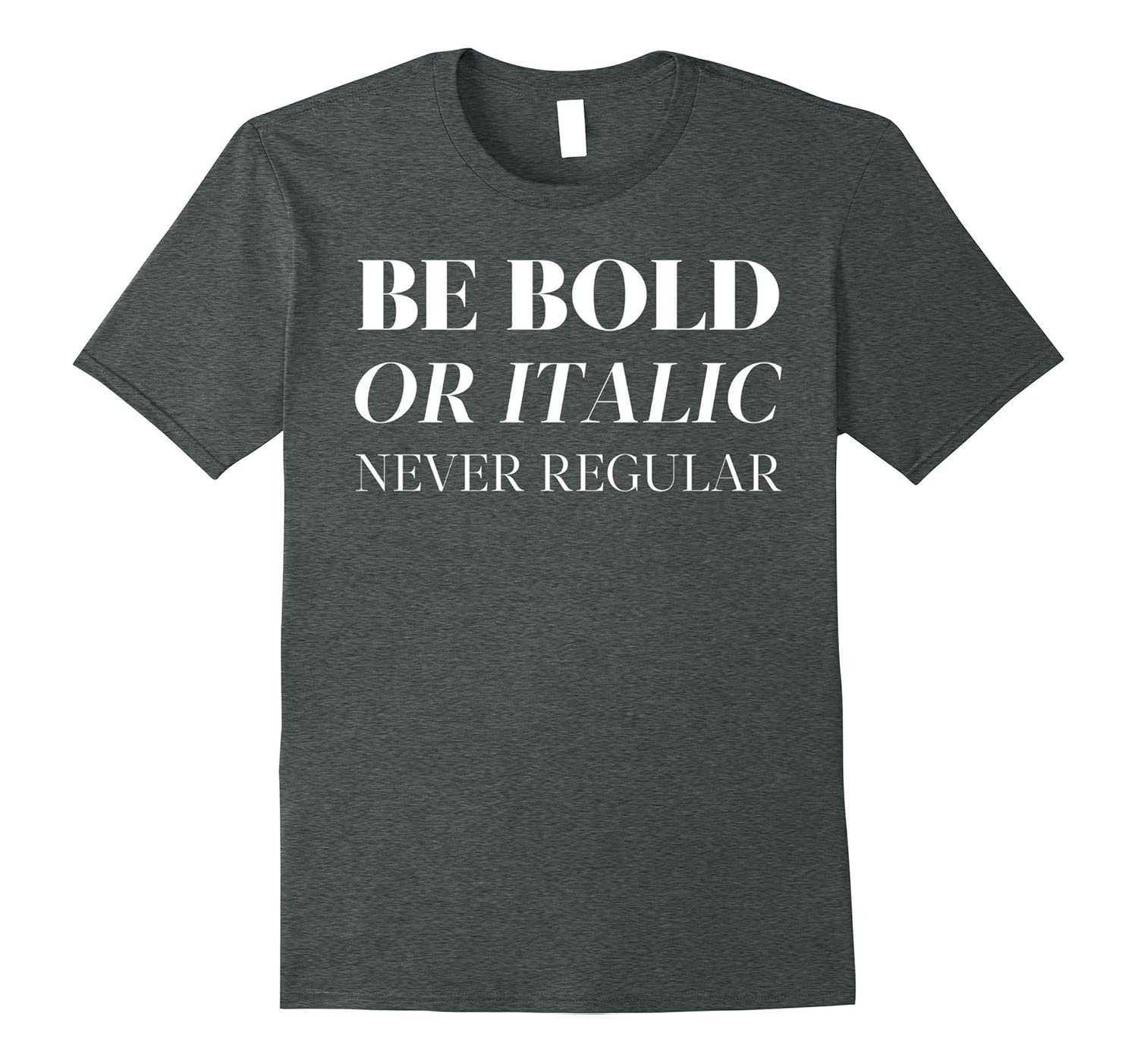 Solid colors: 100% Cotton; Heather Grey: 90% Cotton, 10% Polyester; All Other Heathers: 65% Cotton, 35% Polyester, Imported, Machine wash cold with like colors, dry low heat, This inspirational shirt is great for graphic designers, design lovers, front-end developers or everyone who loves design. This funny font shirt plays on words to tell the world to be bold, be italic, be wild, be weird, but never just be regular. This inspirational Be Bold or Italic Never Regular Designer Font Shirt is designed and printed to be fitted. For a more loose fit, please order a size up. This is also a great gift for a mom, dad, brother, sister, boyfriend, girlfriend, or best friend. Lightweight, Classic fit, Double-needle sleeve and bottom hem