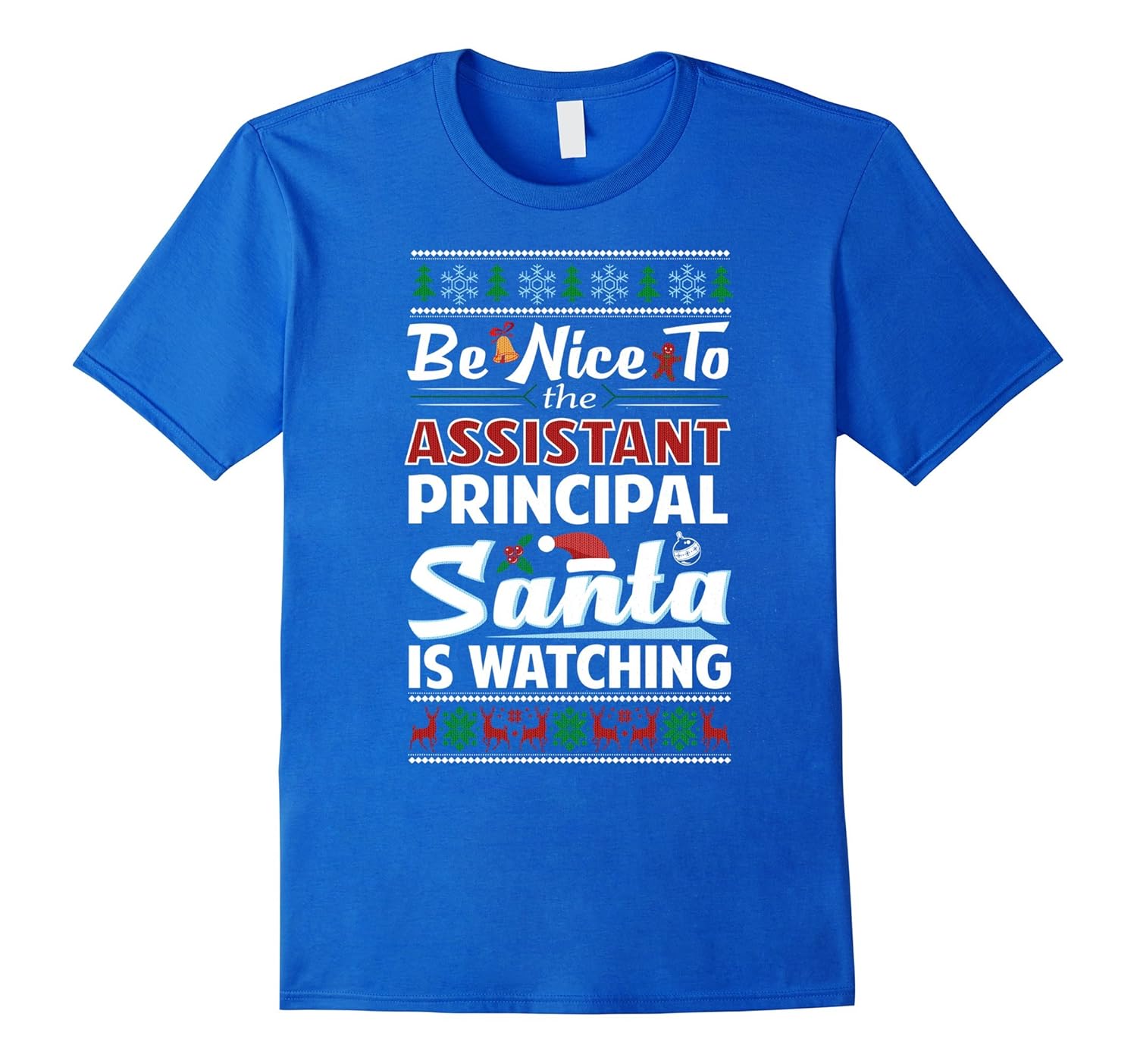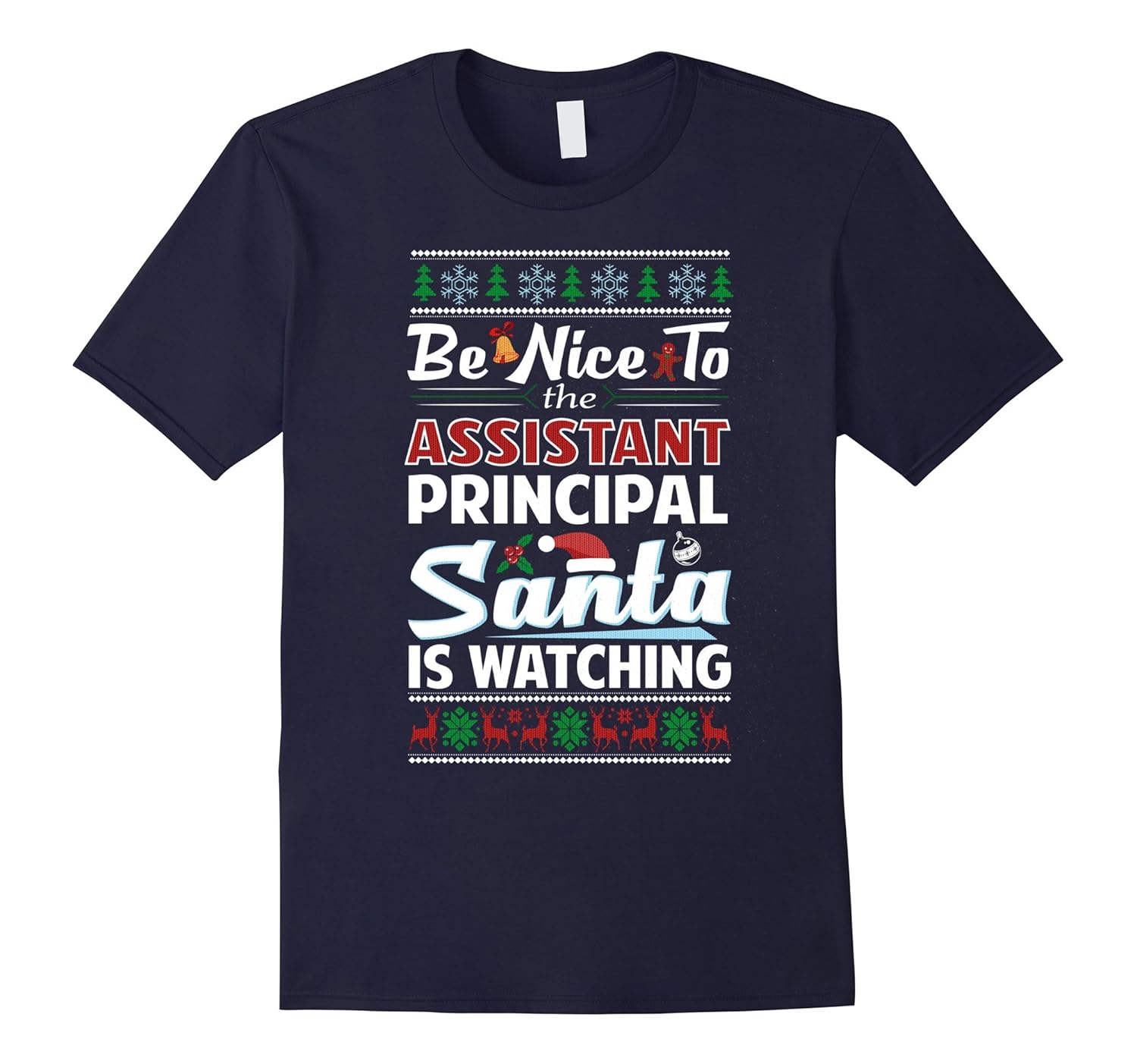 Solid colors: 100% Cotton; Heather Grey: 90% Cotton, 10% Polyester; All Other Heathers: 65% Cotton, 35% Polyester, Imported, Machine wash cold with like colors, dry low heat, An awesome tee saying Be Nice To The Assistant Principal Santa Is Watching decorated in ugly Christmas sweater with cute reindeers, snowflakes, gingerbread and; mistletoe patterns! A funny outfit that”ll make students treat you nicely at school!, Makes a cool tacky Christmas present or a hilarious gag gift idea for amazing teachers and; educators that”ll be a great hit during the happy holiday season! Get this sarcastic tshirt to remind your kids to be on their good behavior and; off the naughty list!, Lightweight, Classic fit, Double-needle sleeve and bottom hem