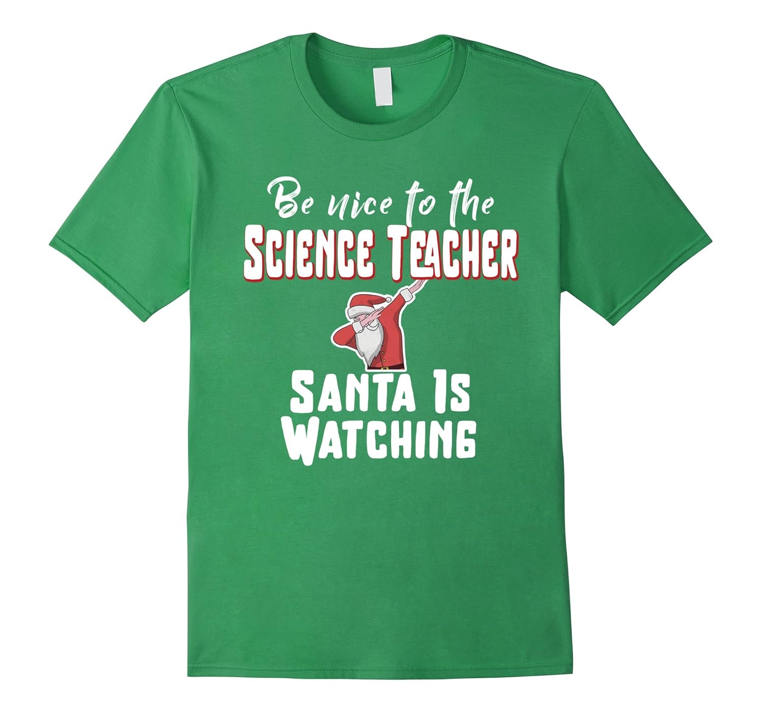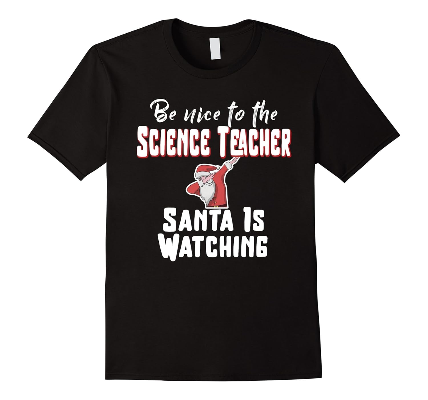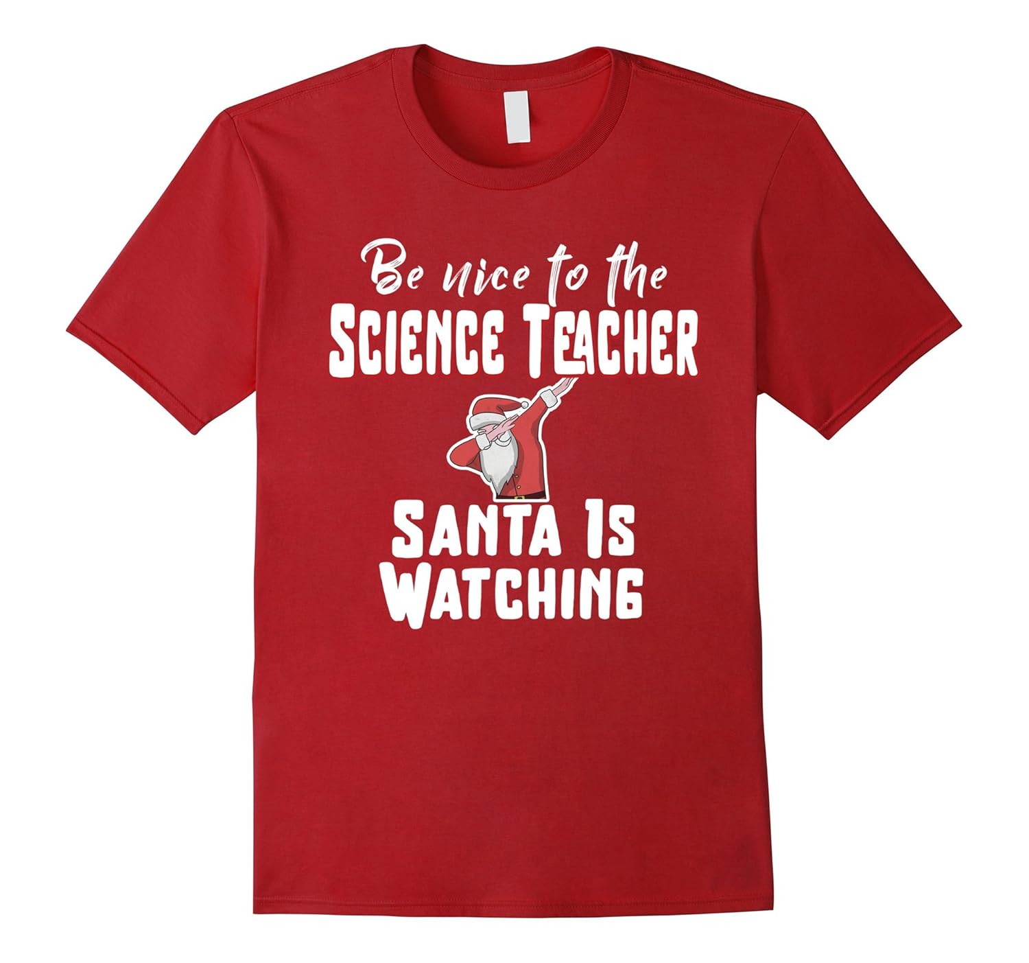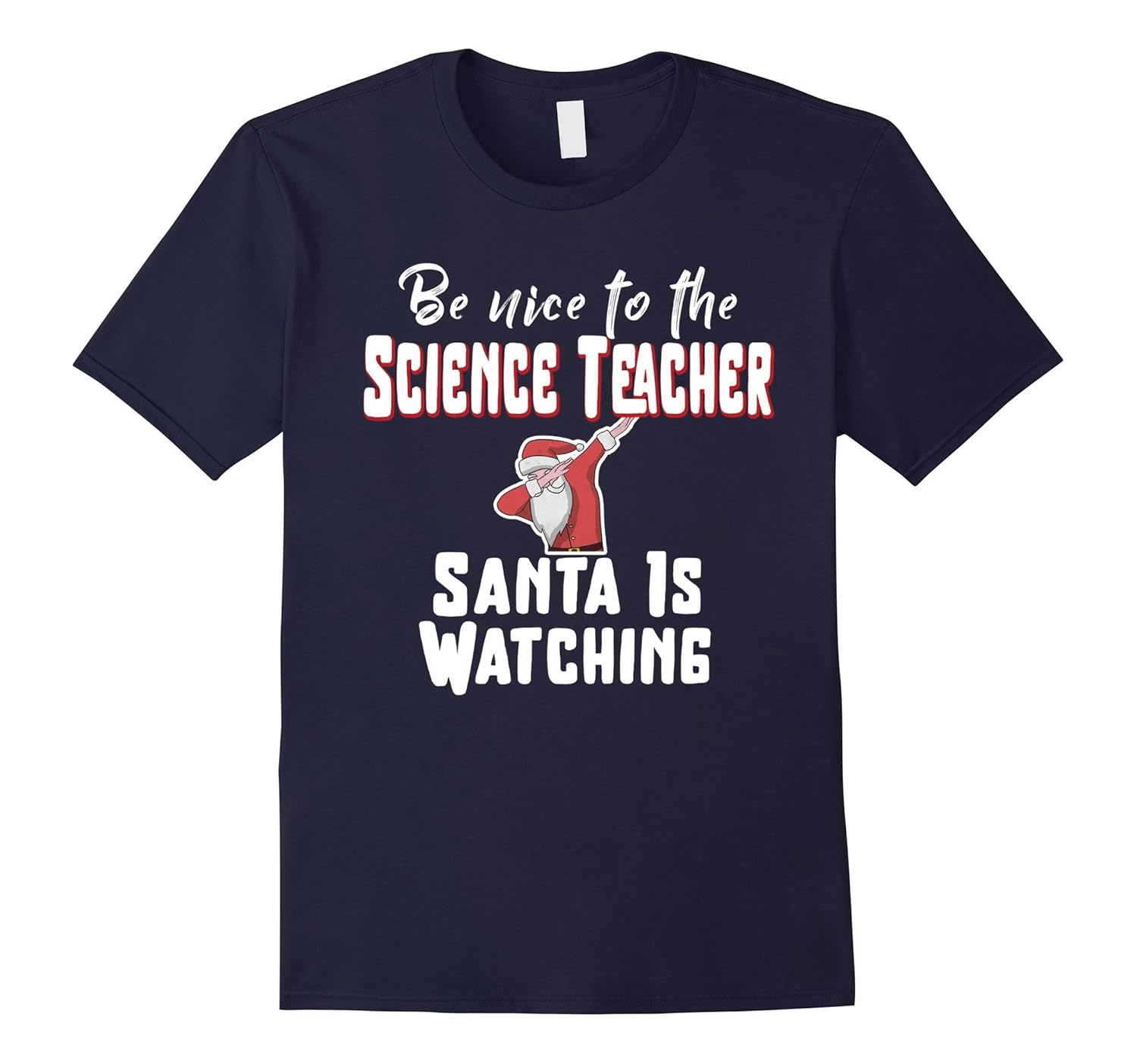 Solid colors: 100% Cotton; Heather Grey: 90% Cotton, 10% Polyester; All Other Heathers: 65% Cotton, 35% Polyester; Imported; Machine wash cold with like colors, dry low heat; Funny christmas Santa Dabbing shirt that reads Be Nice To The Science Teacher Santa Is Watching; T-Shirt for a Science Teacher to wear this christmas holiday; Lightweight, Classic fit, Double-needle sleeve and bottom hem