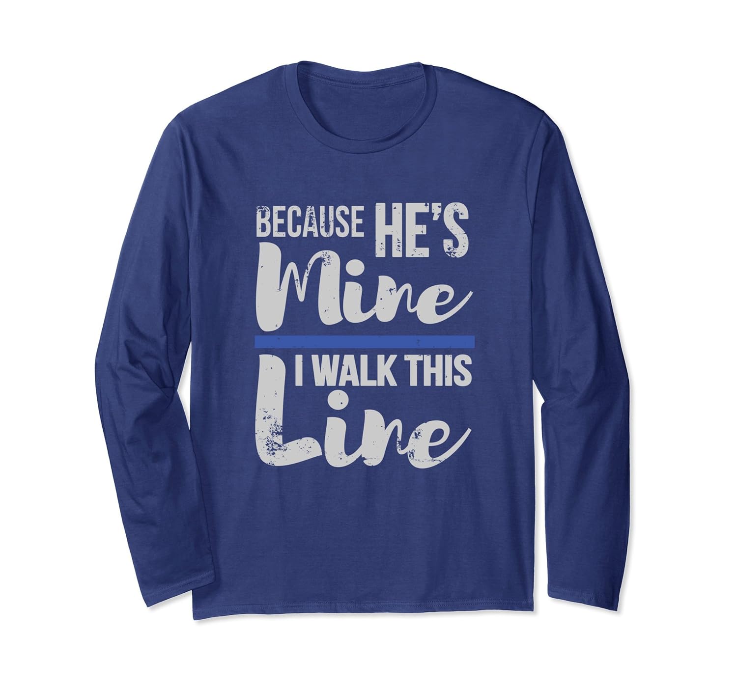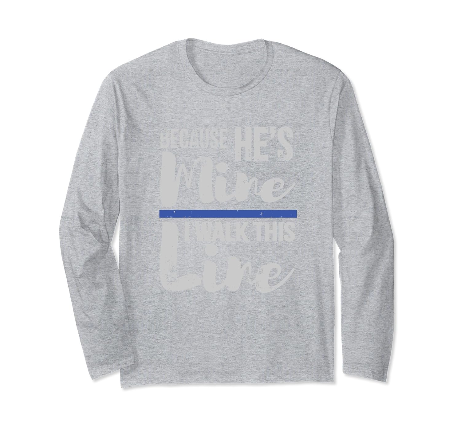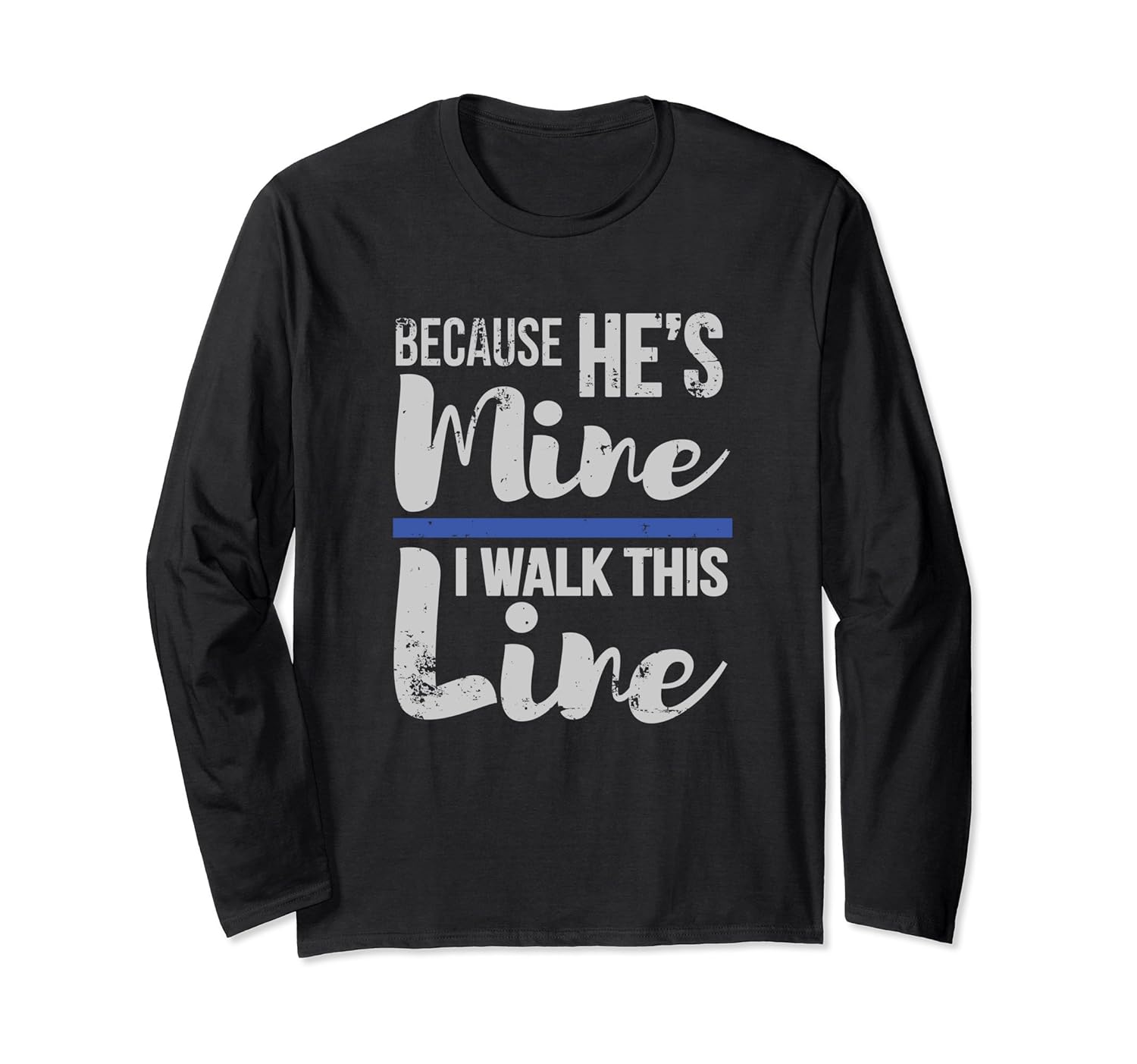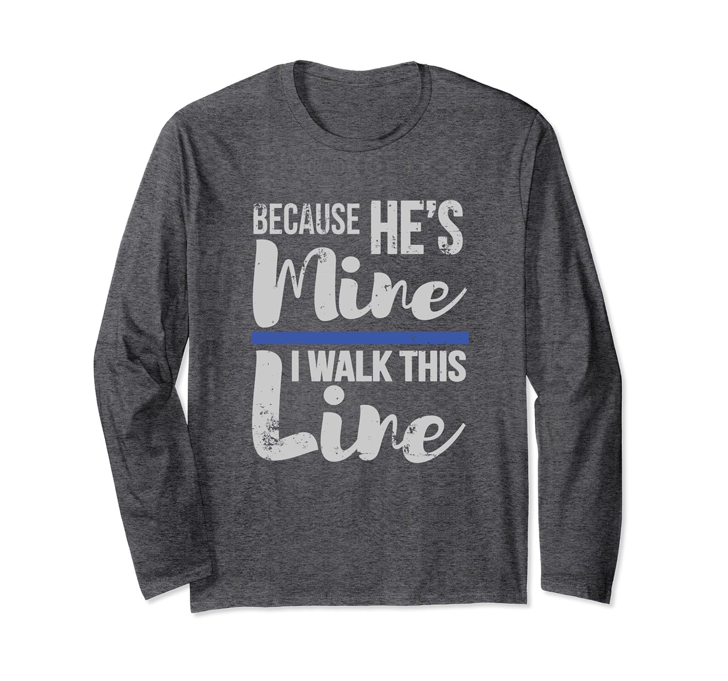 Solid colors: 100% Cotton; Heather Grey: 90% Cotton, 10% Polyester; All Other Heathers: 50% Cotton, 50% Polyester; Imported; Machine wash cold with like colors, dry low heat; Show off that you walk the line for your boyfriend/ husband. If hes yours and you walk the line for him then show it off; The Because Hes Mine I Walk This Line Long Sleeve T-Shirt makes a great gift for friends and family; Lightweight, Classic fit, Double-needle sleeve and bottom hem
