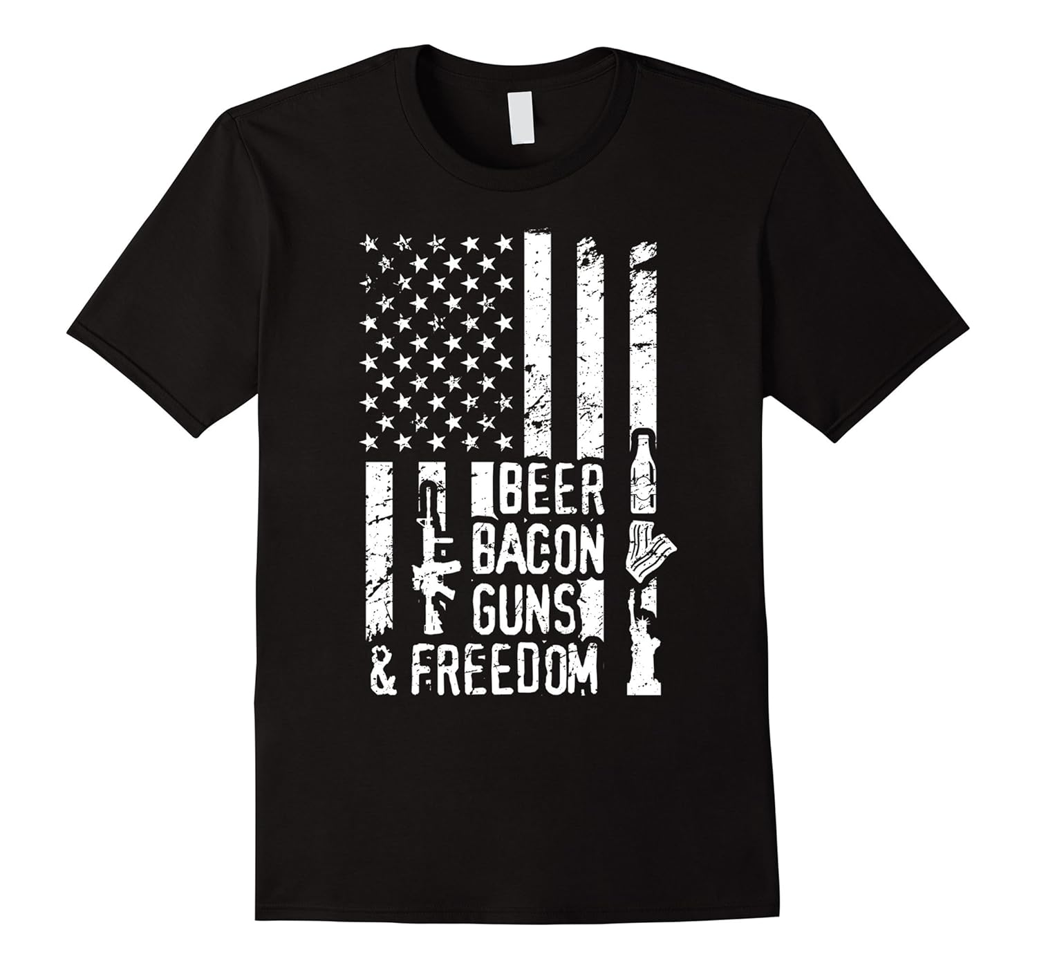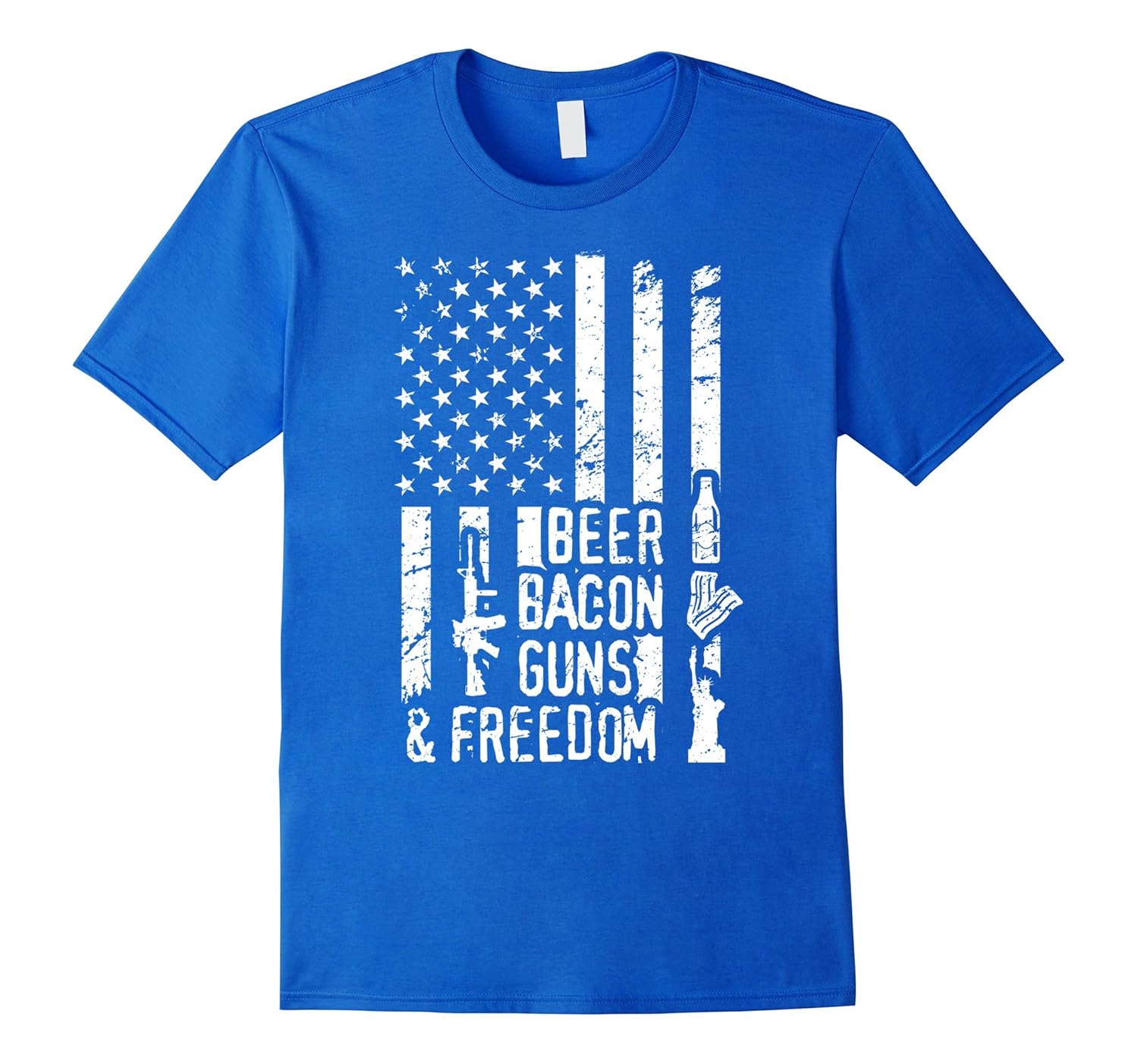Solid colors: 100% Cotton; Heather Grey: 90% Cotton, 10% Polyester; All Other Heathers: 65% Cotton, 35% Polyester, Imported, Machine wash cold with like colors, dry low heat, Beer Bacon Guns And Freedom T-Shirt design is a Perfect Gift Idea for Men and Women and for every patriot of American Flag. Awesome gift for your dad, mom, brother, sister, grandpa, husband, wife, boyfriend, uncle, son and daughter. Great patriotic American Flag tee shirt with a distressed print decal with a cool saying and awesome images of these words made in a flag lines. Make a perfect gift for your man for his birthday or for Christmas with this wonderful tee shirt. Lightweight, Classic fit, Double-needle sleeve and bottom hem