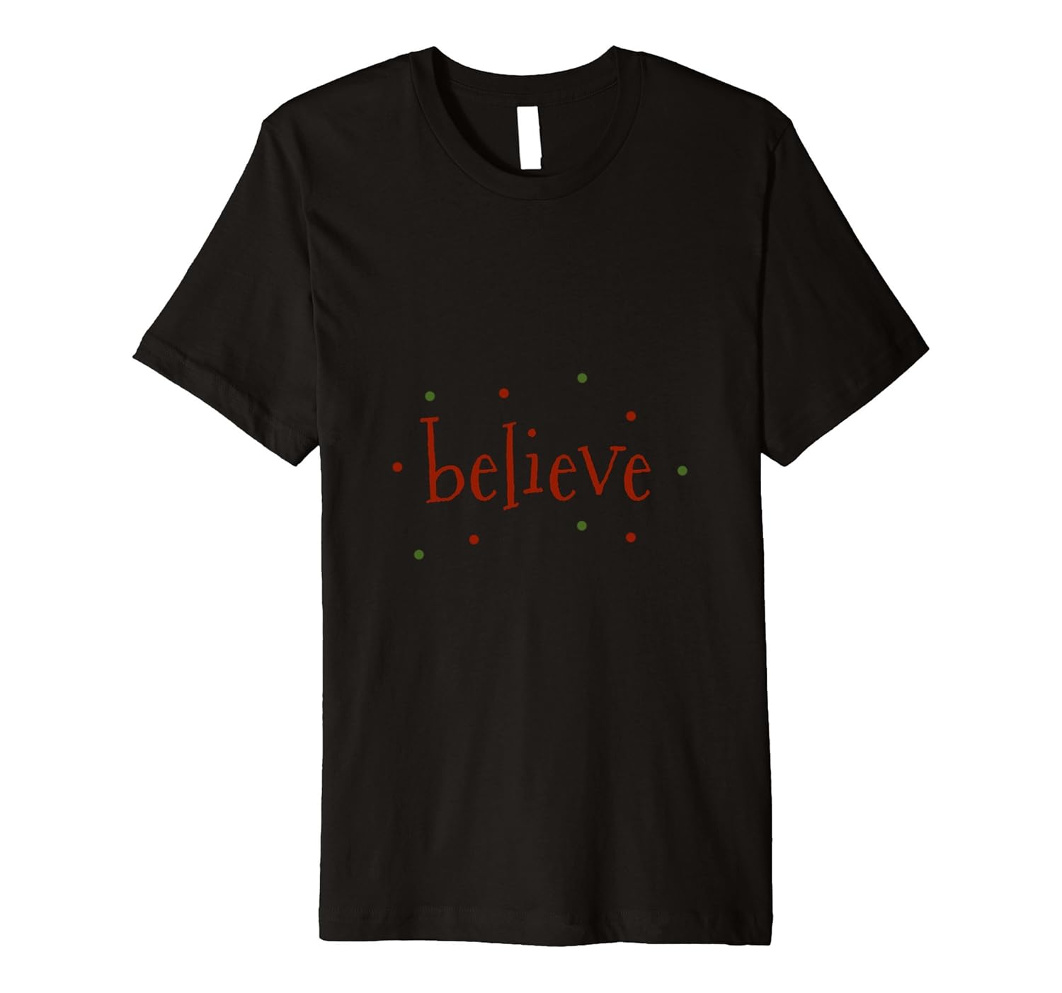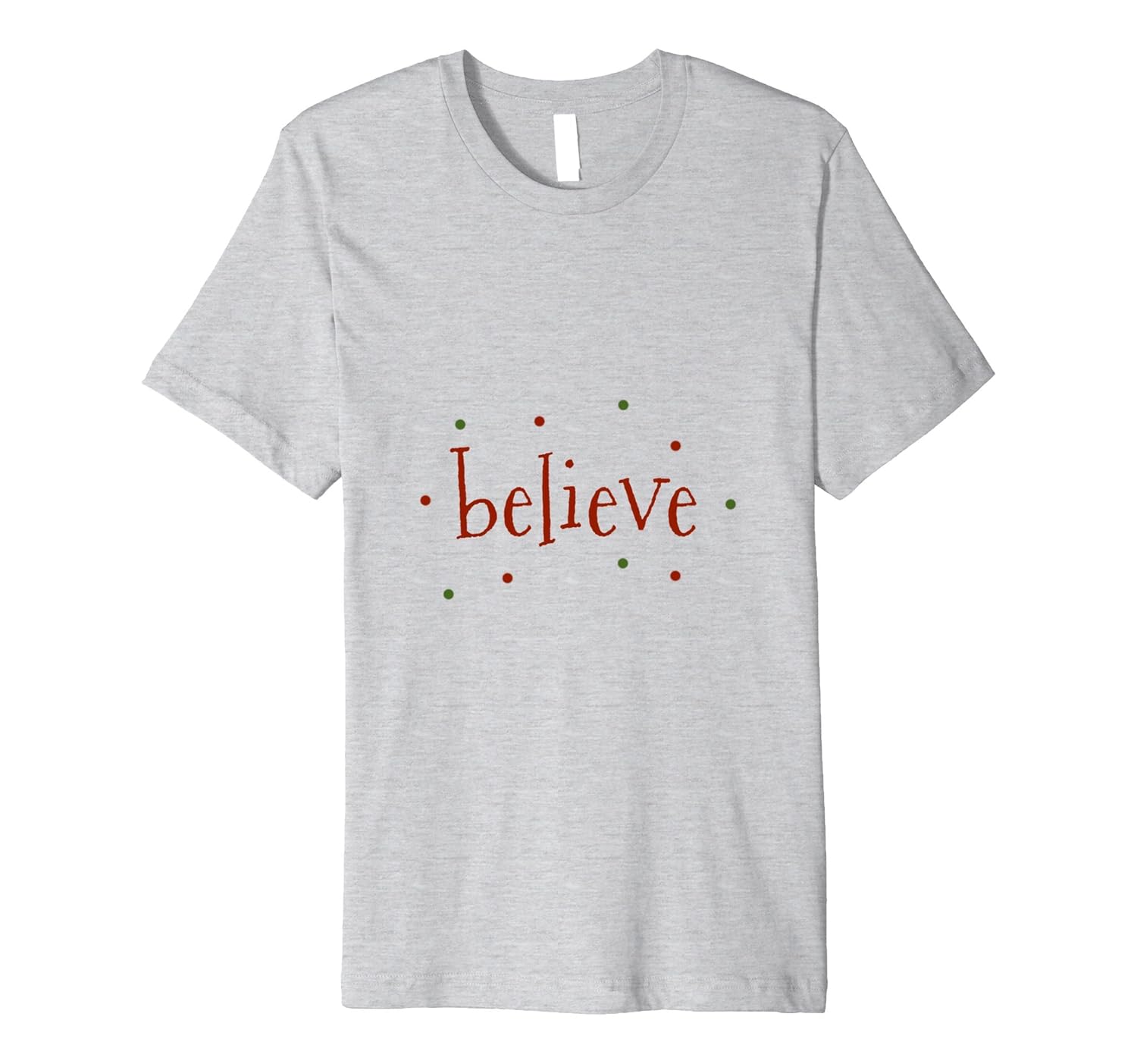 Solid colors: 100% Cotton; Heather Grey: 90% Cotton, 10% Polyester; All Other Heathers: 58% Cotton, 42% Polyester; Imported; Machine wash cold with like colors, dry low heat; This fun shirt for men or women reads believe in a festive holiday font with decorative red and green confetti.; Fit: Slim (consider ordering a larger size for a looser fit); Present this tee as a gift to your christmas loving friends, family and kids. Or wear the top yourself during the xmas season, to holiday parties, and as part of your outfit throughout the year to display your love of the holidays.; This premium t-shirt is made of lightweight fine jersey fabric