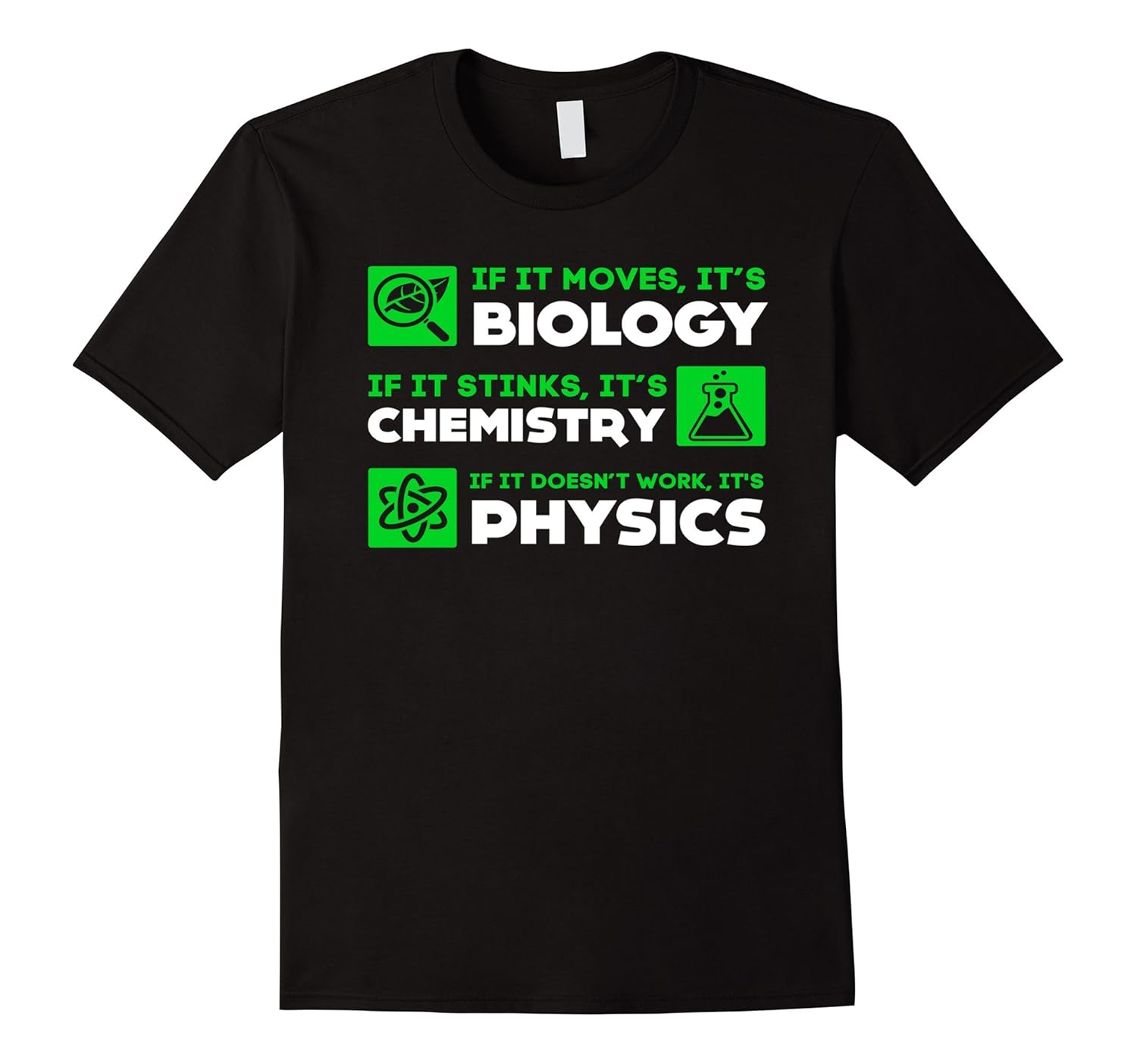 Solid colors: 100% Cotton; Heather Grey: 90% Cotton, 10% Polyester; All Other Heathers: 65% Cotton, 35% Polyester; Imported; Machine wash cold with like colors, dry low heat; Biology Chemistry Physics Science Teacher Shirt; If It Moves, Its Biology If It Stinks, Its Chemistry If It Doesnt Work, Its Physics.; Lightweight, Classic fit, Double-needle sleeve and bottom hem