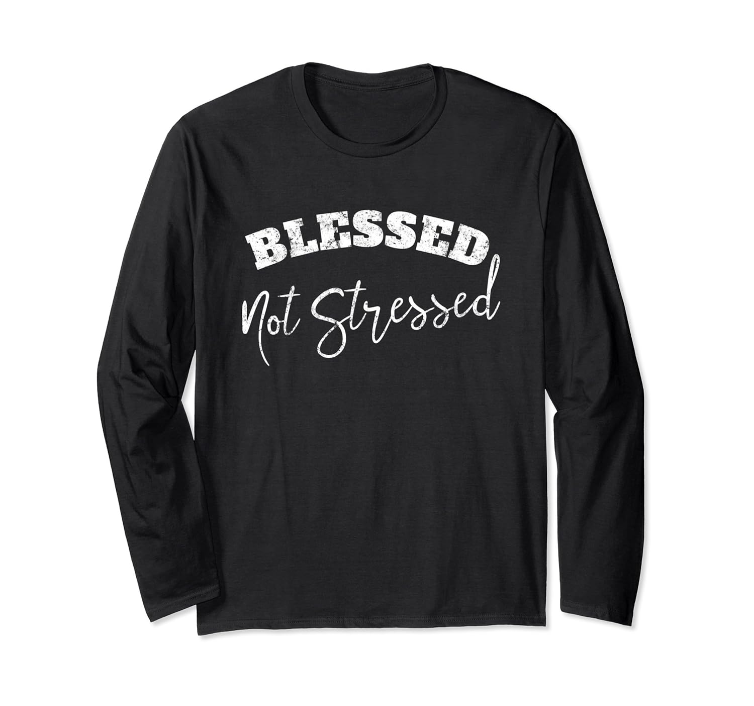 Solid colors: 100% Cotton; Heather Grey: 90% Cotton, 10% Polyester; All Other Heathers: 50% Cotton, 50% Polyester; Imported; Machine wash cold with like colors, dry low heat; Blessed Not Stressed Long Sleeved Tee Shirt. Bless. Stress. Fortunate. Lucky. Grateful.; Unisex Long Sleeve TShirt Sizes Fit Mens, Womens and Big Kids. See Size Chart for details.; Lightweight, Classic fit, Double-needle sleeve and bottom hem