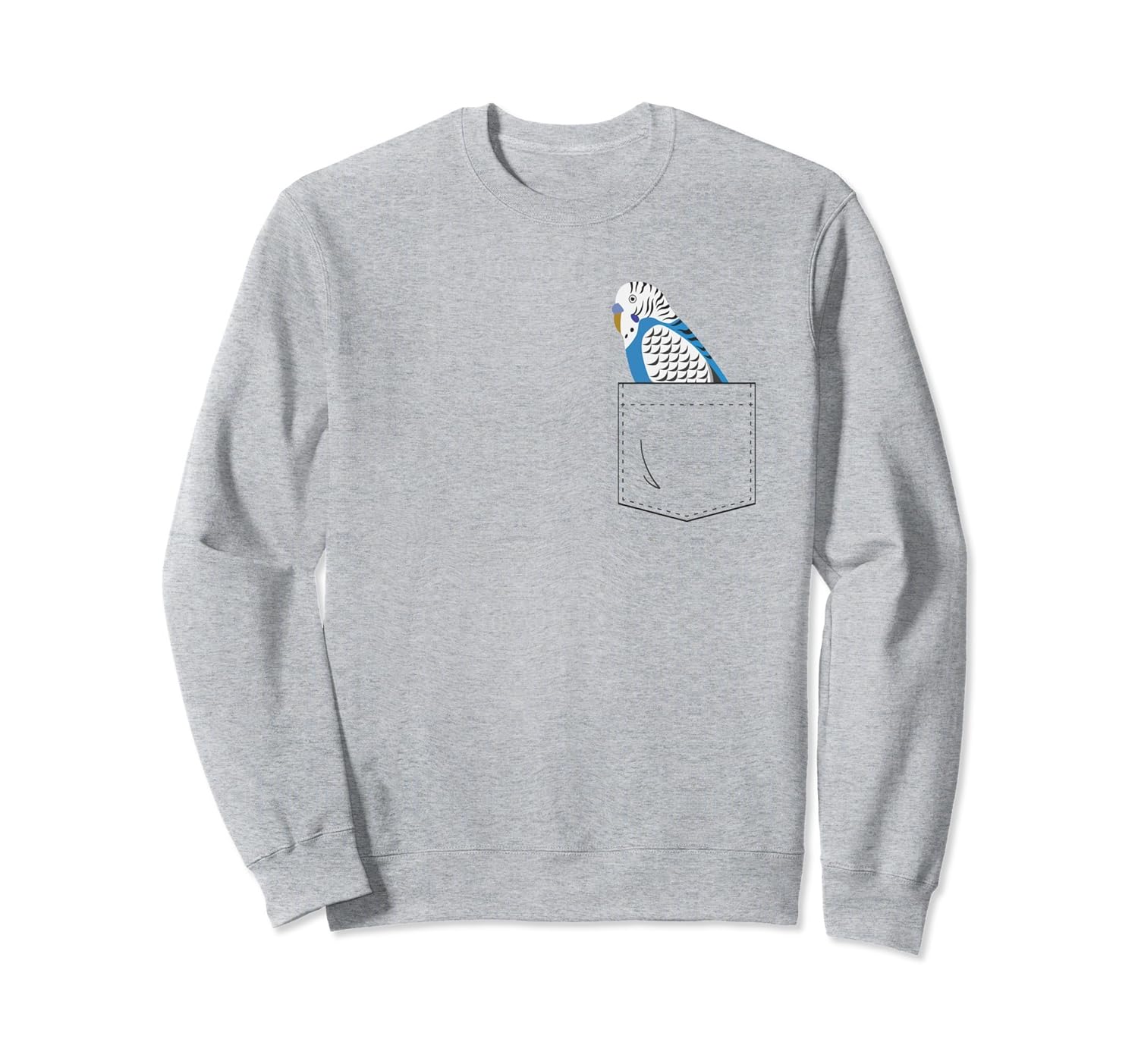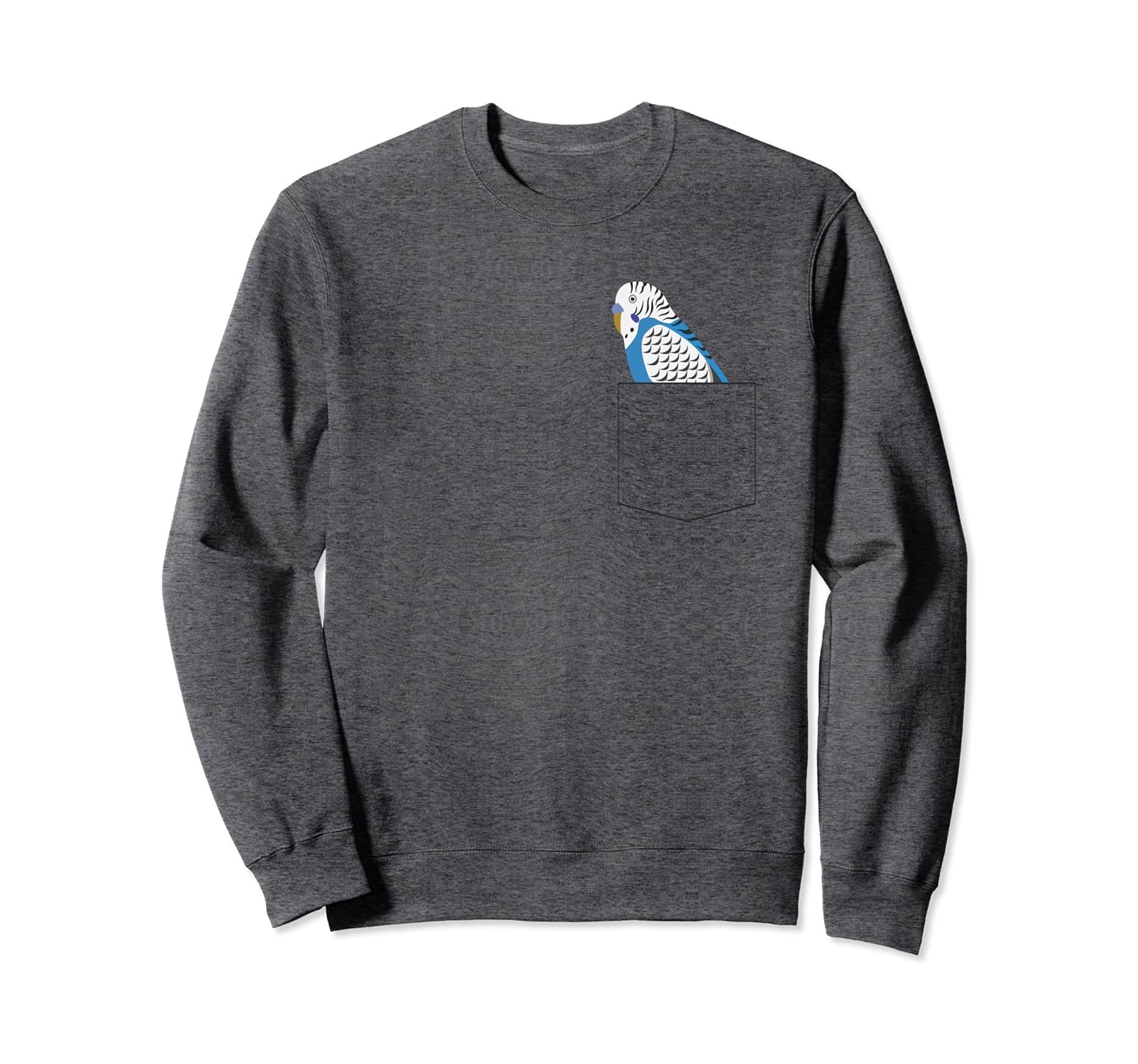 Solid colors: 80% Cotton, 20% Polyester; Heather Grey: 78% Cotton, 22% Poly; Dark Heather: 50% Cotton, 50% Polyester; Imported; Machine wash cold with like colors, dry low heat; A funny budgerigar sweatshirt designed for bird lovers in mind. This shirt features a cartoon budgie parakeet parrot in your front (fake) shirt pocket. Whether youre going to a store or to a park, you can bring your parrot anywhere with you!; Perfect shirt for men, women, mom or dad, anyone who shares life with a parrot Andamp; enjoys showering. Great gift for parrot rescue, parrot lover, bird lover, zookeeper, bird trainer, and avian veterinarian. This funny, clever sweatshirt will get laughs!; 8.5 oz, Classic fit, Twill-taped neck