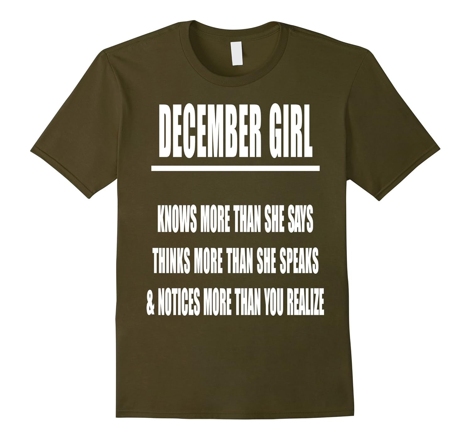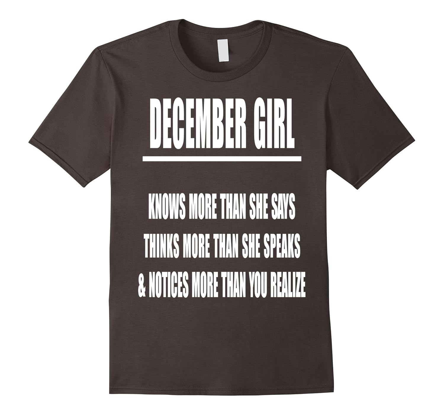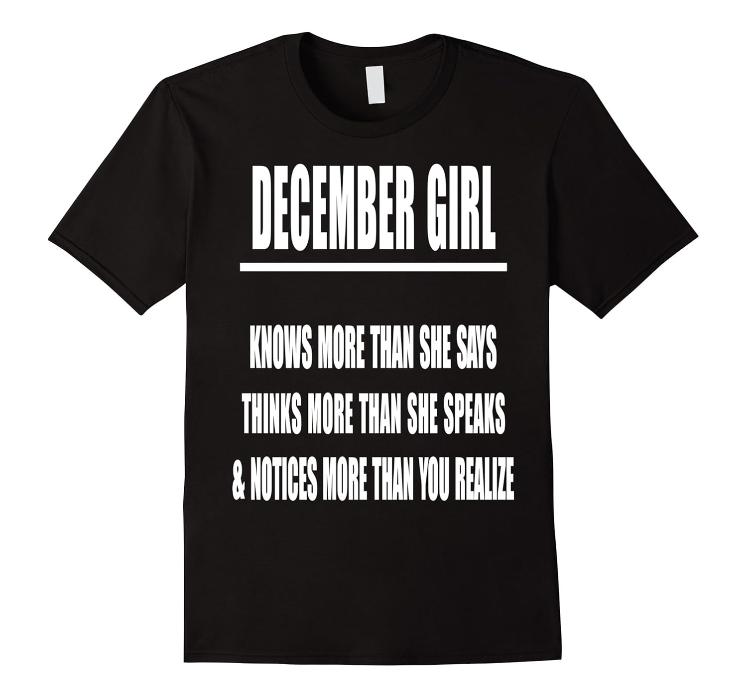 Solid colors: 100% Cotton; Heather Grey: 90% Cotton, 10% Polyester; All Other Heathers: 65% Cotton, 35% Polyester, Imported, Machine wash cold with like colors, dry low heat, December girl knows more than she says, thinks more than she speaks and notices more than you realize, Lightweight, Classic fit, Double-needle sleeve and bottom hem