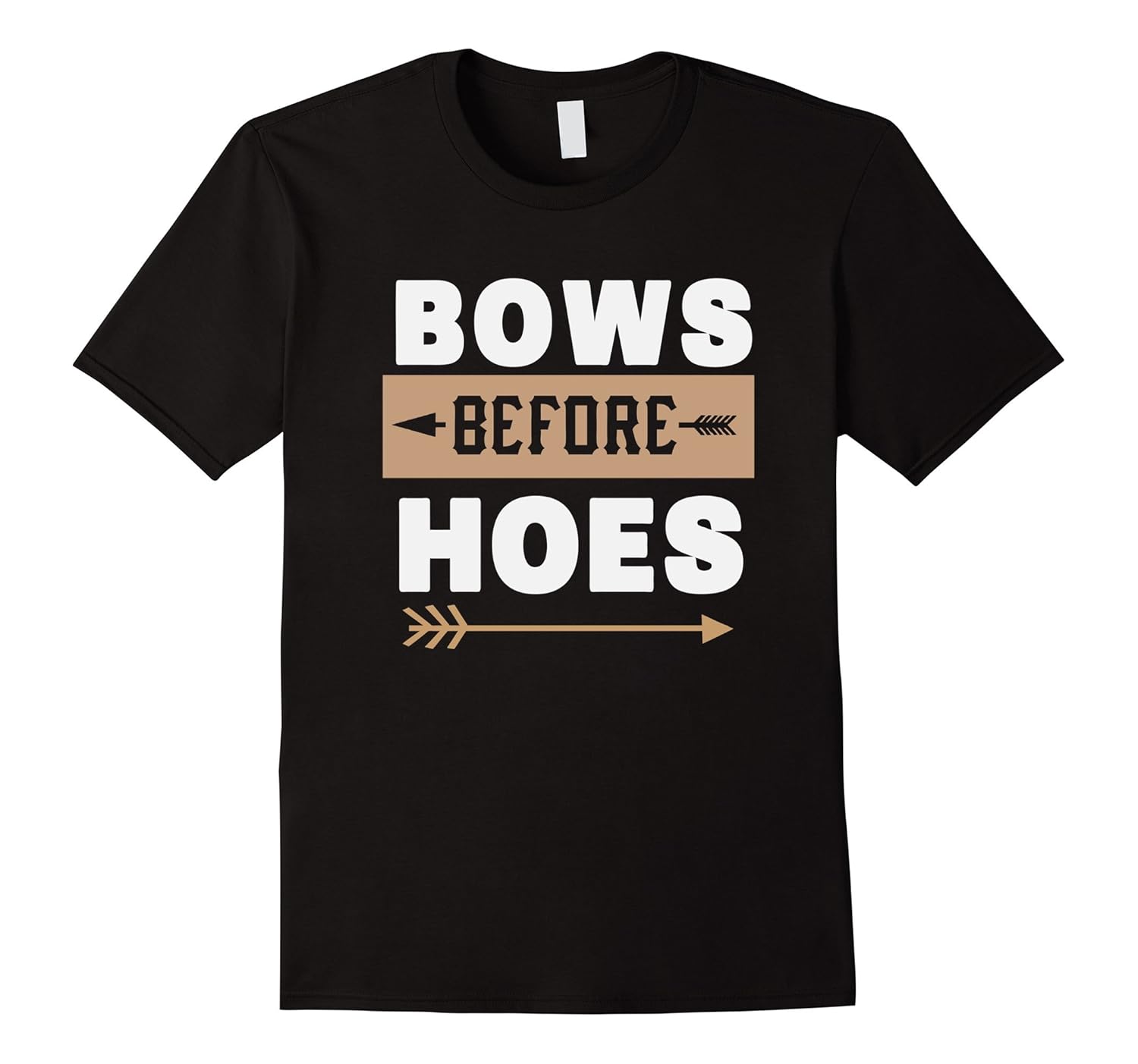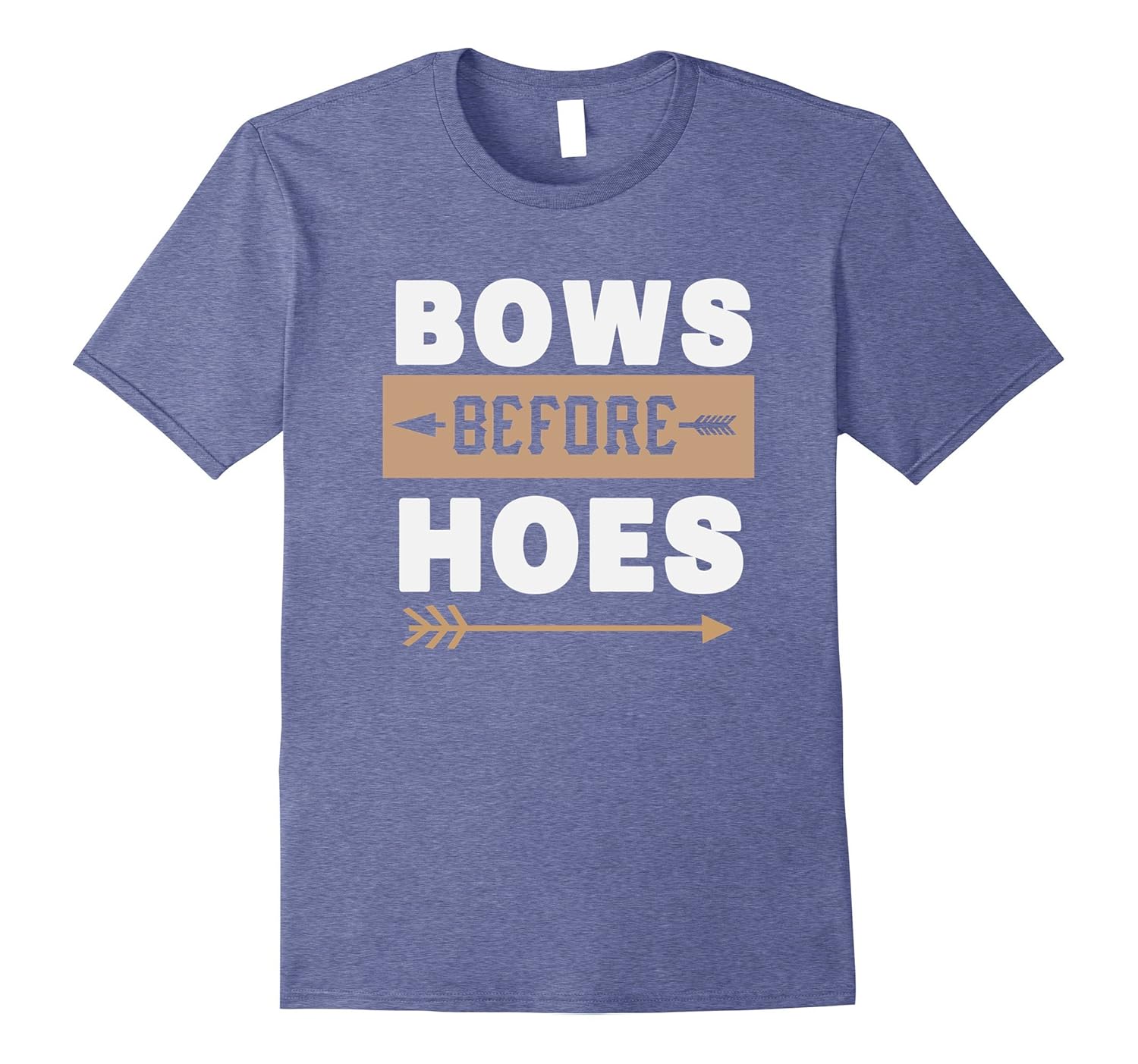 Solid colors: 100% Cotton; Heather Grey: 90% Cotton, 10% Polyester; All Other Heathers: 65% Cotton, 35% Polyester, Imported, Machine wash cold with like colors, dry low heat, Bows before hoes. Every who love to hunt with a bow and arrow will love this funny shirt. Perfect gift for hunter dads, sons, friends. For birthday, christmas or anniversary. Lightweight, Classic fit, Double-needle sleeve and bottom hem