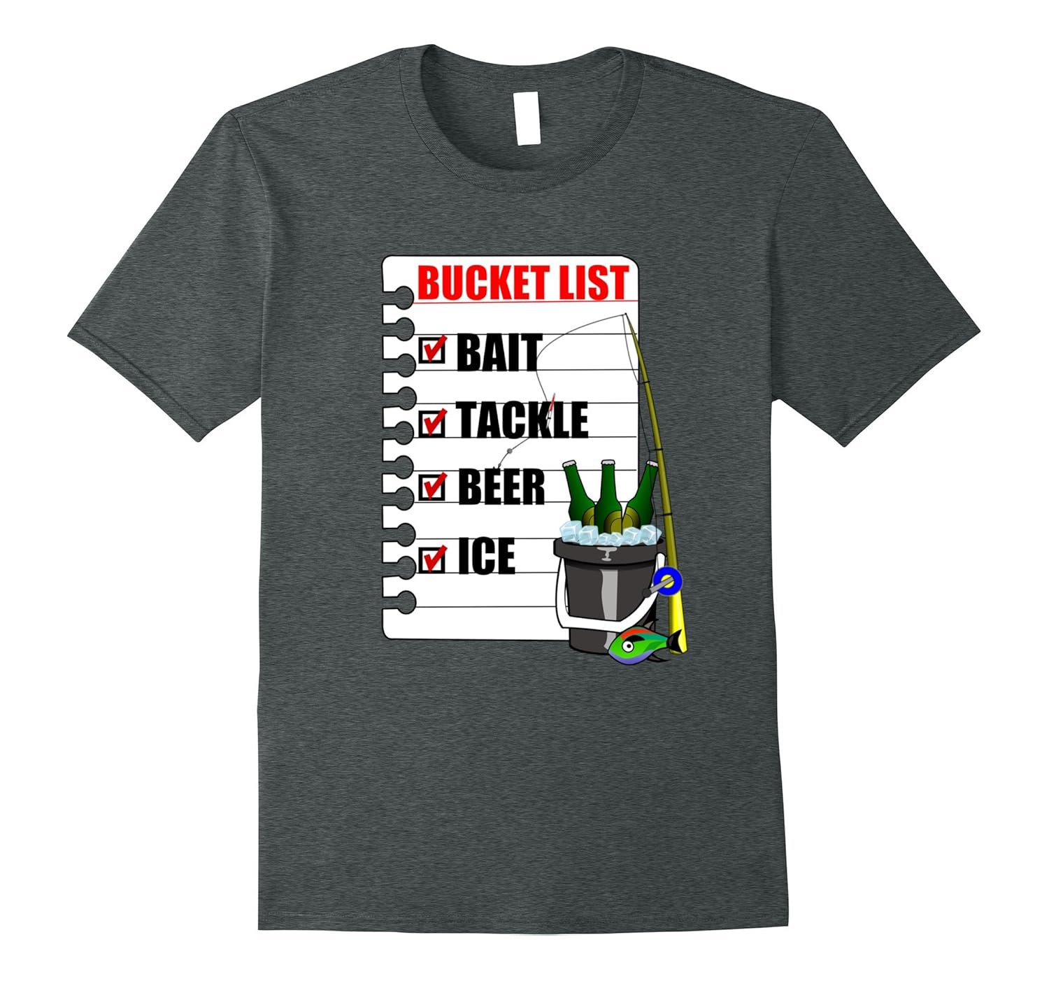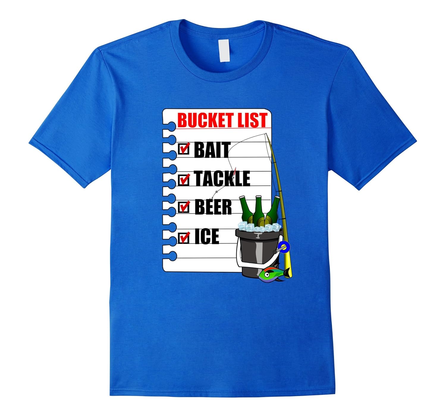 Solid colors: 100% Cotton; Heather Grey: 90% Cotton, 10% Polyester; All Other Heathers: 65% Cotton, 35% Polyester, Imported, Machine wash cold with like colors, dry low heat, Bucket List T Shirt. Tackle Bait Beer Ice Shirt for a fisherman or woman. Do you have a bucket list of things you want to do before it”s too late. This hilarious shirt is perfect for a Christmas gift Birthday gift or anytime. The beer is chilling and the lure and fishing rod are ready to go. What could be better than spending a day on the lake fishing. Enjoy the smiles you”ll get when wearing this fun fishing t-shirt. Wear it in your fishing boat or out on the town. Lightweight, Classic fit, Double-needle sleeve and bottom hem