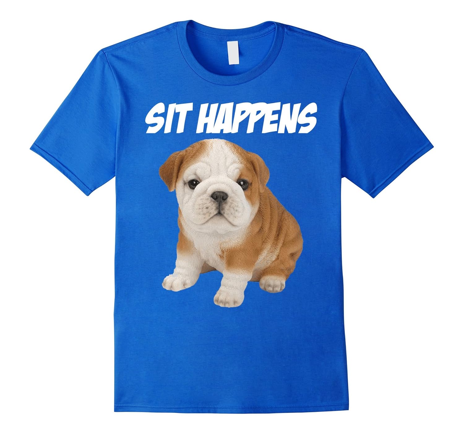 Solid colors: 100% Cotton; Heather Grey: 90% Cotton, 10% Polyester; All Other Heathers: 65% Cotton, 35% Polyester; Imported; Machine wash cold with like colors, dry low heat; High Quality Print Comfortable Bulldog Sit Happens clothing apparel tshirt that makes a great gift; Available in mens womens boys girls and youths / kids sizes; Lightweight, Classic fit, Double-needle sleeve and bottom hem