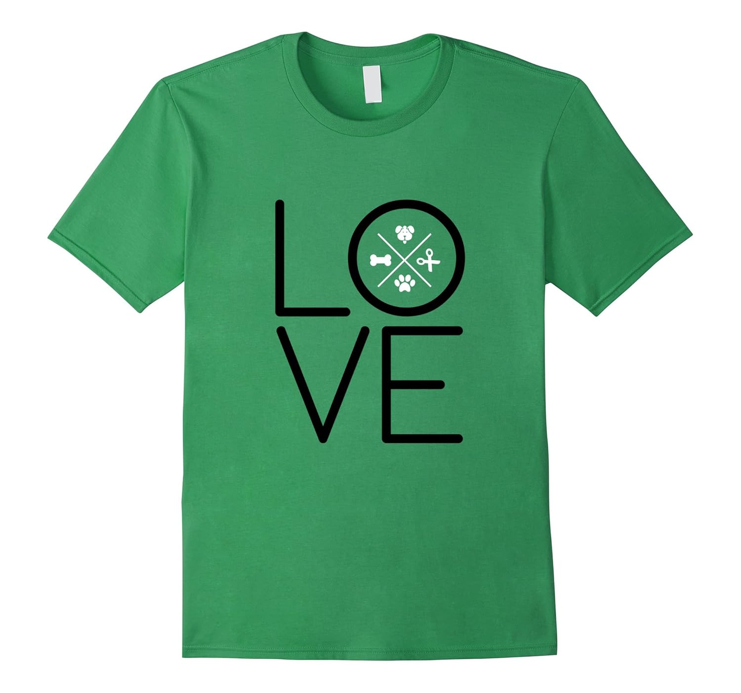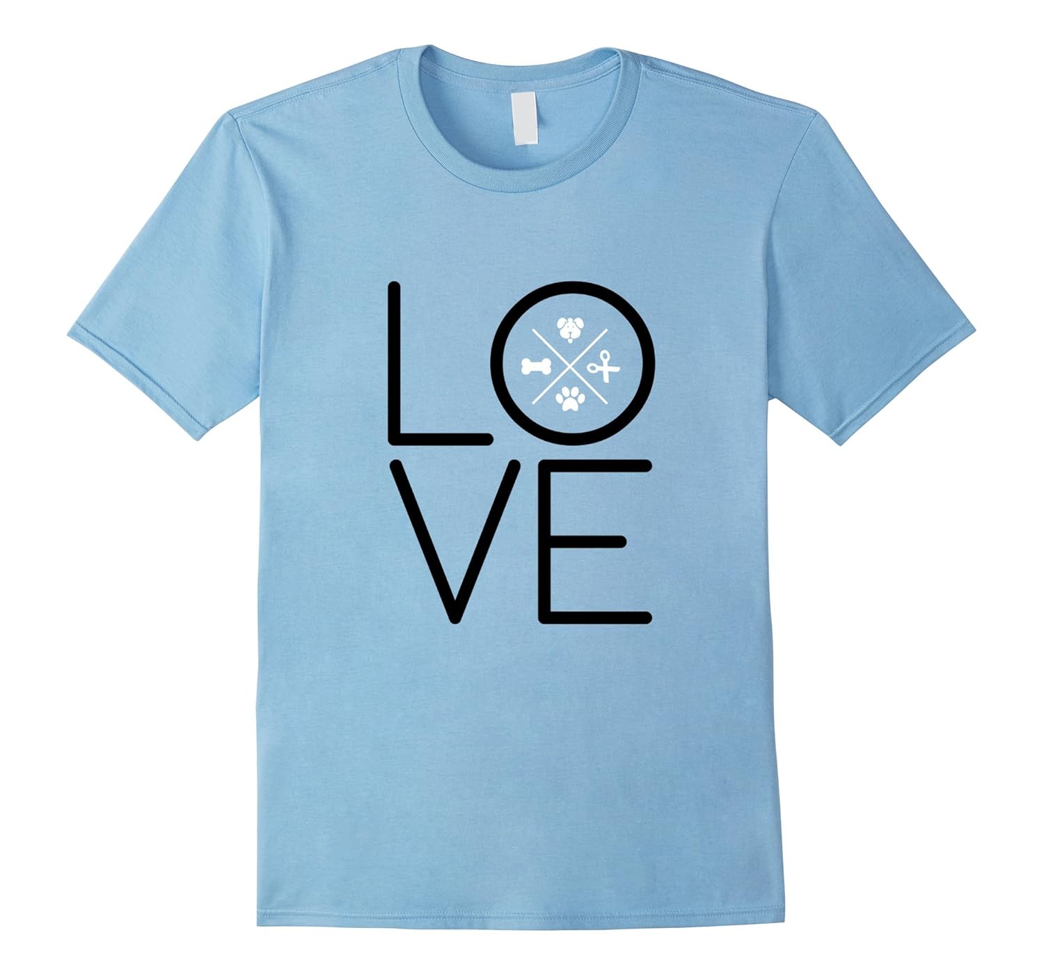 Solid colors: 100% Cotton; Heather Grey: 90% Cotton, 10% Polyester; All Other Heathers: 65% Cotton, 35% Polyester; Imported; Machine wash cold with like colors, dry low heat; Great gift for a dog lover or someone who loves their dog.; Text reads LOVE with chewing bone, paw print, dog and grooming scissors.; Lightweight, Classic fit, Double-needle sleeve and bottom hem