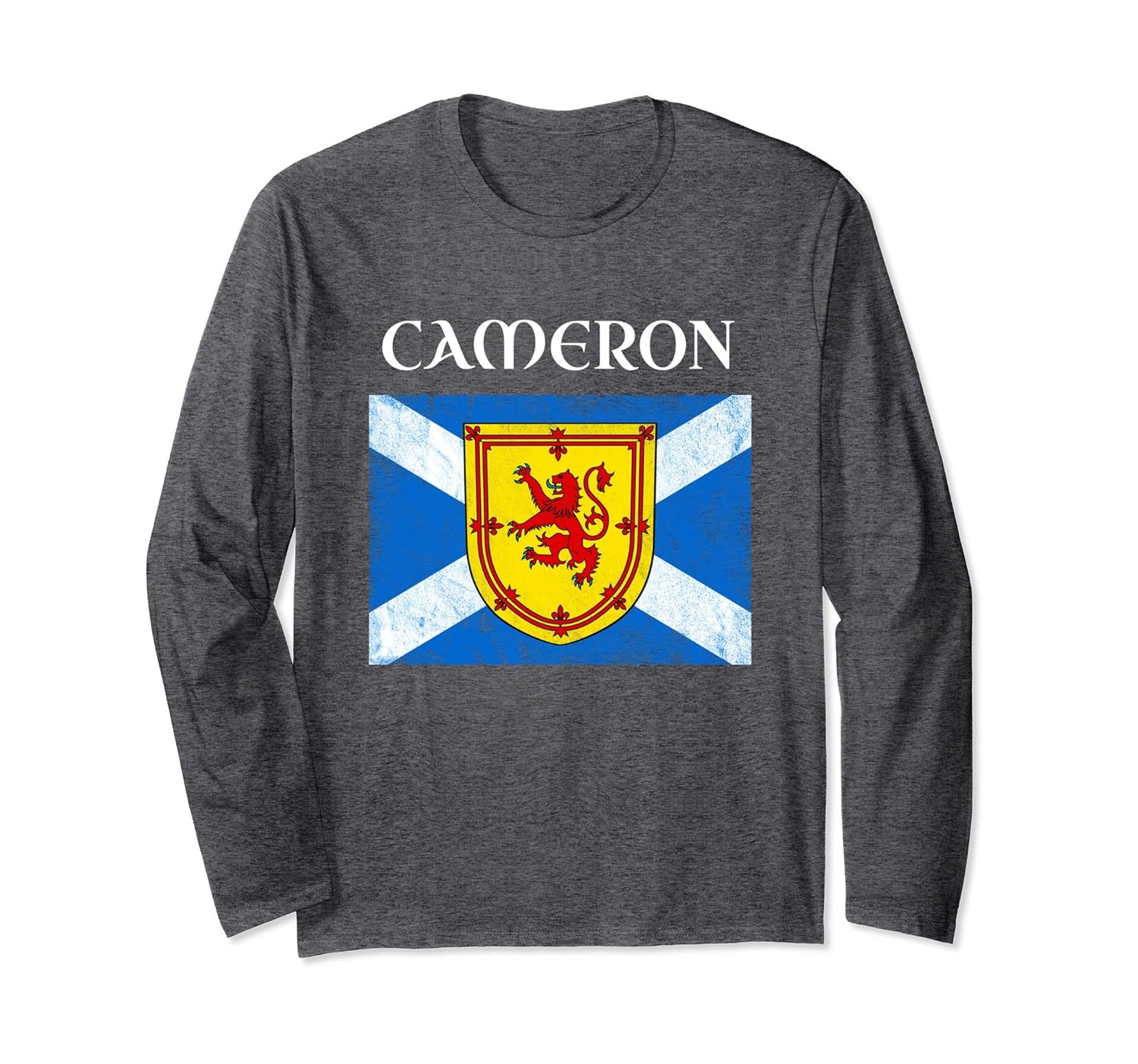 Solid colors: 100% Cotton; Heather Grey: 90% Cotton, 10% Polyester; All Other Heathers: 50% Cotton, 50% Polyester; Imported; Machine wash cold with like colors, dry low heat; Cameron Scottish name long sleeve t-shirt gift. Gaelic Scot heritage apparel with Scotland flag, lion rampant. Scottish name, clan name, surname, Celtic family name shirt. Wear with kilts or tartan for highland games.; Lightweight, Classic fit, Double-needle sleeve and bottom hem