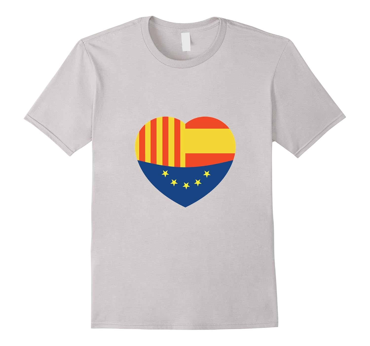 Solid colors: 100% Cotton; Heather Grey: 90% Cotton, 10% Polyester; All Other Heathers: 65% Cotton, 35% Polyester, Imported, Machine wash cold with like colors, dry low heat, Awesome tshirt design with a heart formed by the Catalunya flag, the Spanish flag and the European flag together as one. Gran diseno con un corazon formado por las banderas de Catalunya, Espanya y Europa juntas como una sola. Lightweight, Classic fit, Double-needle sleeve and bottom hem