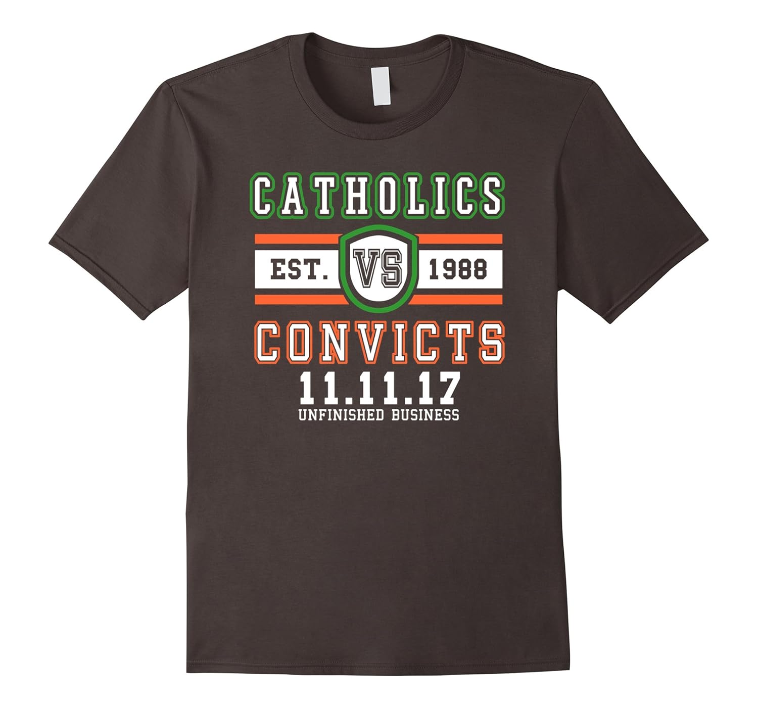 Solid colors: 100% Cotton; Heather Grey: 90% Cotton, 10% Polyester; All Other Heathers: 65% Cotton, 35% Polyester, Imported, Machine wash cold with like colors, dry low heat, Catholics Vs Convicts T Shirt 2017, Catholics Vs Convicts Rematch Shirts, 11-11-17 , November 11, 2017, Catholics Versus Convicts T-shirt Est 1988, Catholics vs. Convicts: Unfinished Business T-Shirt, Lightweight, Classic fit, Double-needle sleeve and bottom hem