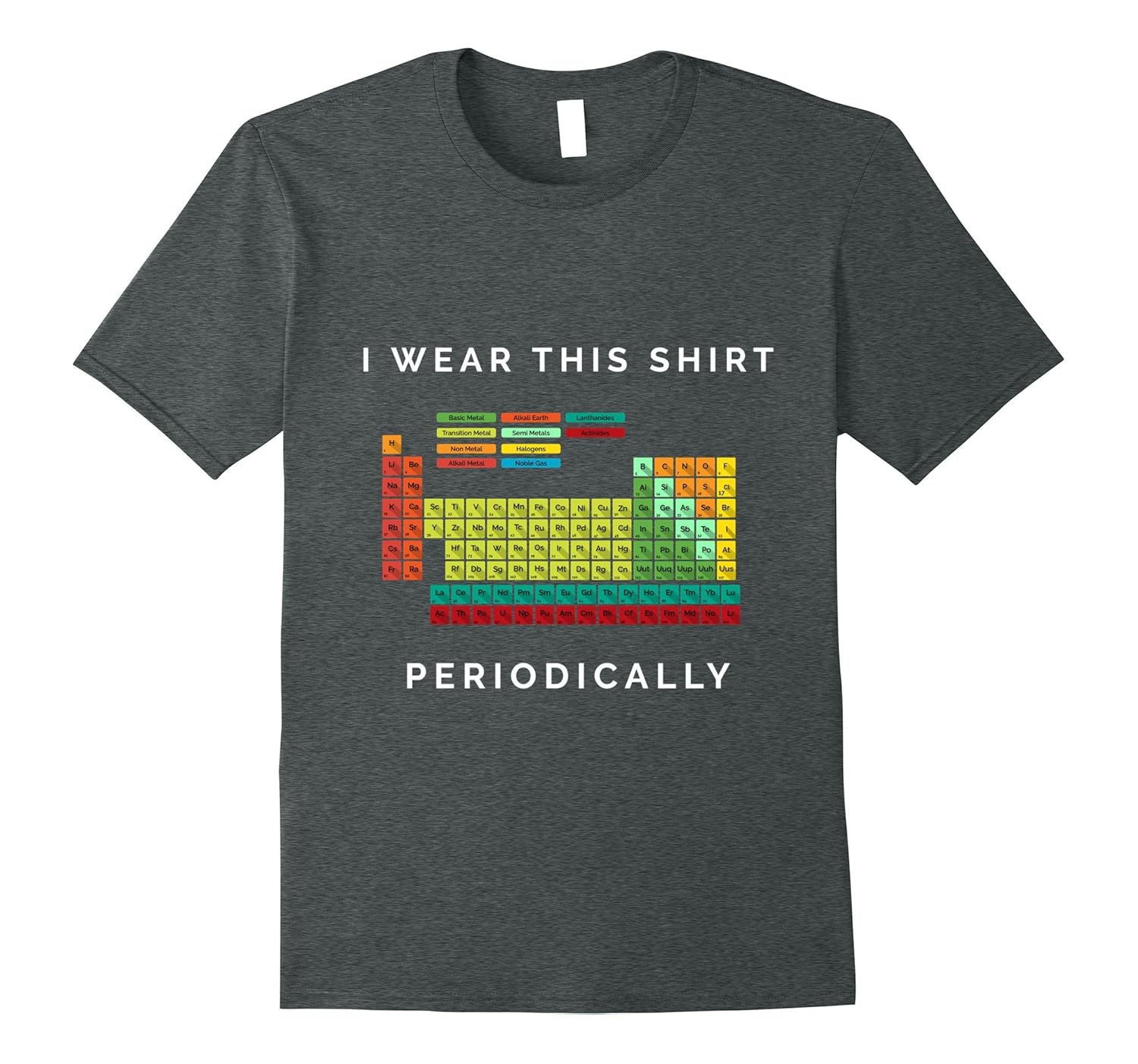 Solid colors: 100% Cotton; Heather Grey: 90% Cotton, 10% Polyester; All Other Heathers: 65% Cotton, 35% Polyester; Imported; Machine wash cold with like colors, dry low heat; Humor and word play at work – This science t shirt of periodic table features whole elements labelled according to their state (gas, metal ..) The table is along with a chemistry pun text that reads: I wear this shirt periodically.; This t shirt will make a fun gift for anyone who loves science, chemistry and physics and likes nerdy jokes.; Lightweight, Classic fit, Double-needle sleeve and bottom hem