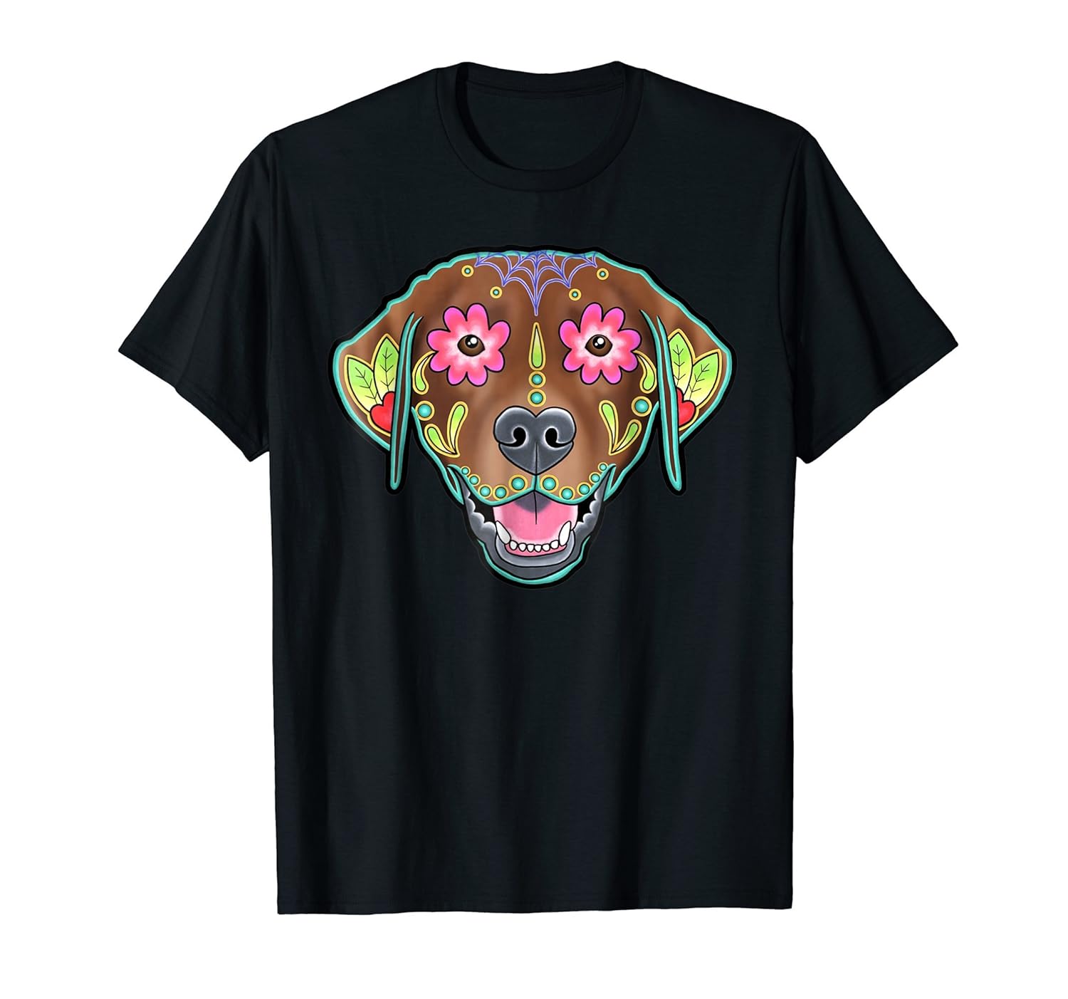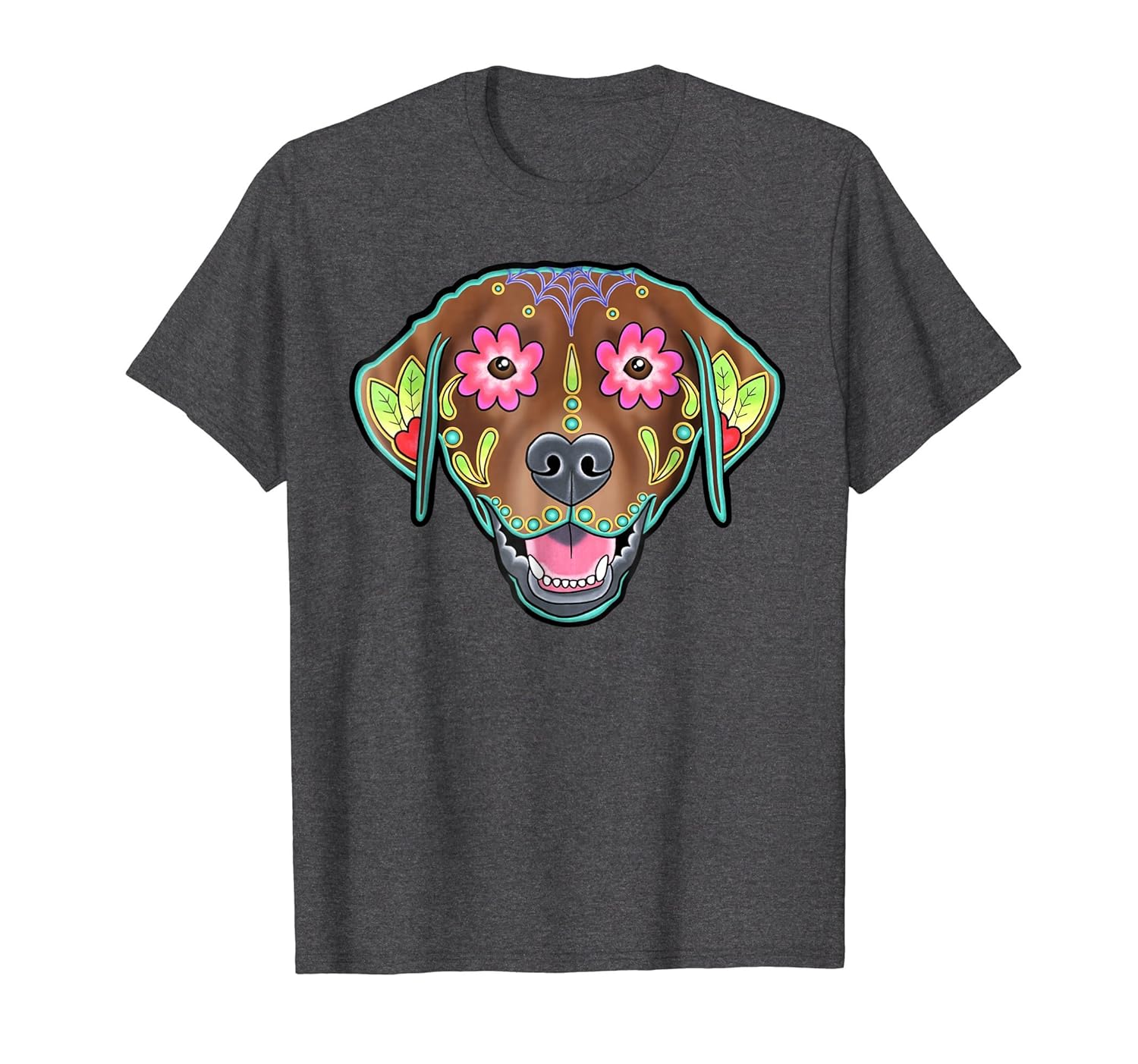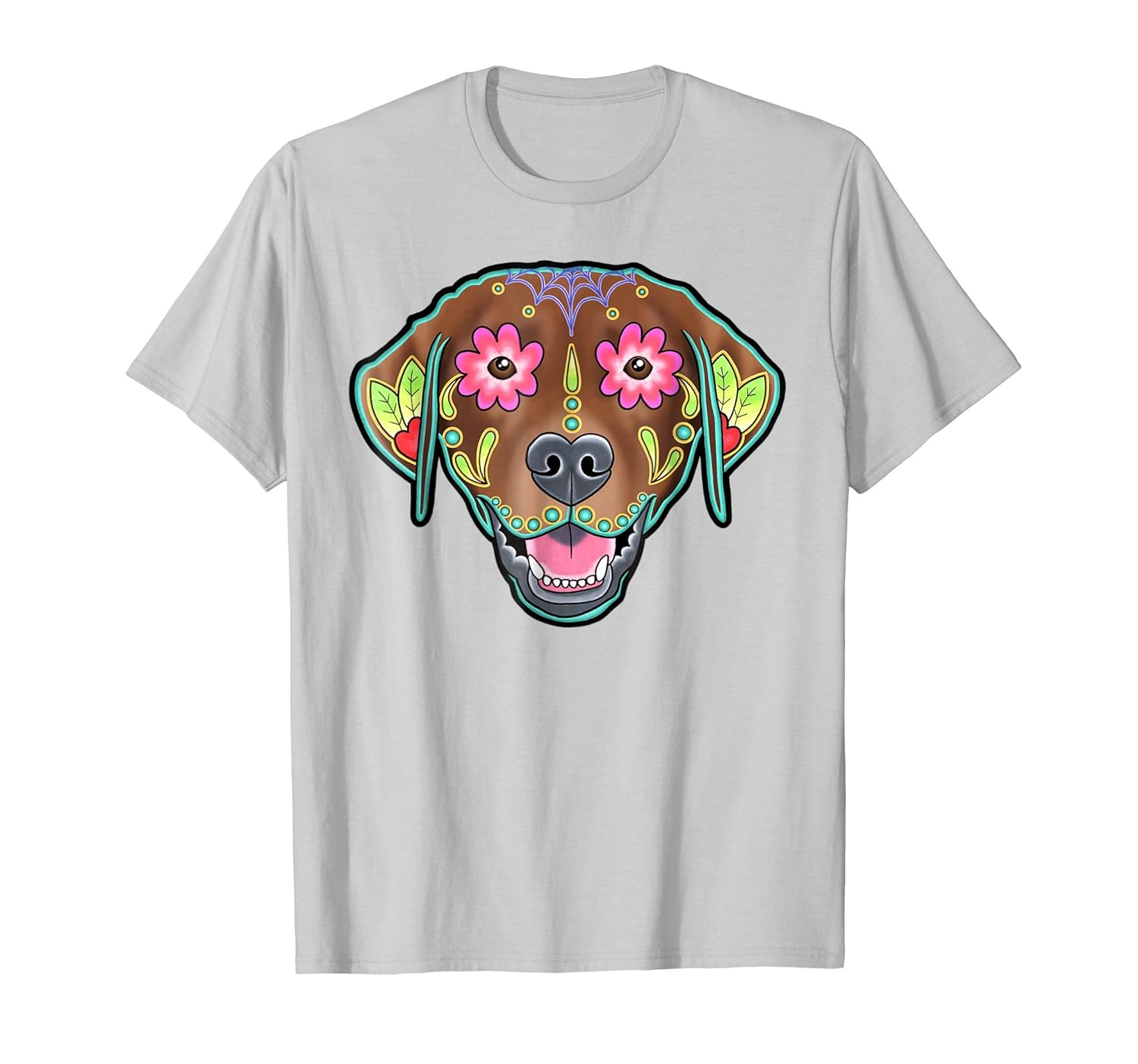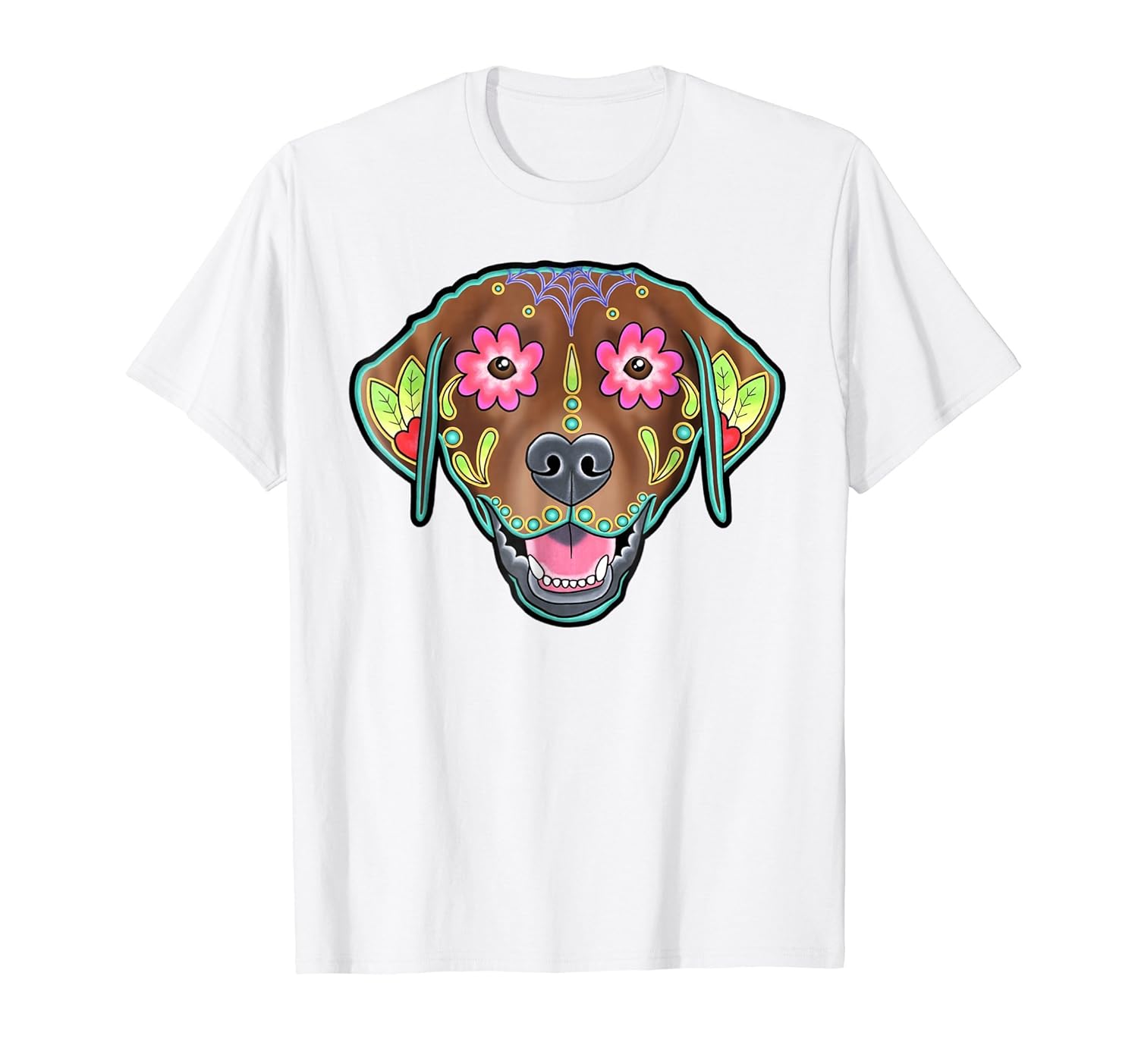 Solid colors: 100% Cotton; Heather Grey: 90% Cotton, 10% Polyester; All Other Heathers: 50% Cotton, 50% Polyester; Imported; Machine wash cold with like colors, dry low heat; This unique Dia de los Muertos design features a smiling chocolate labrador retriever adorned with filigree and flowers. This happy brown lab is decorated as a traditional Mexican folk art sugar skull. Celebrate your furbaby with this tattoo inspired tee!; This colorful Day of the Dead design is a must have for any dog lover. Whether youre a pup parent, an animal rescuer, or a doggy enthusiast, there is no better way to show off your puppy love than with this authentic retriever calavera design!; Lightweight, Classic fit, Double-needle sleeve and bottom hem