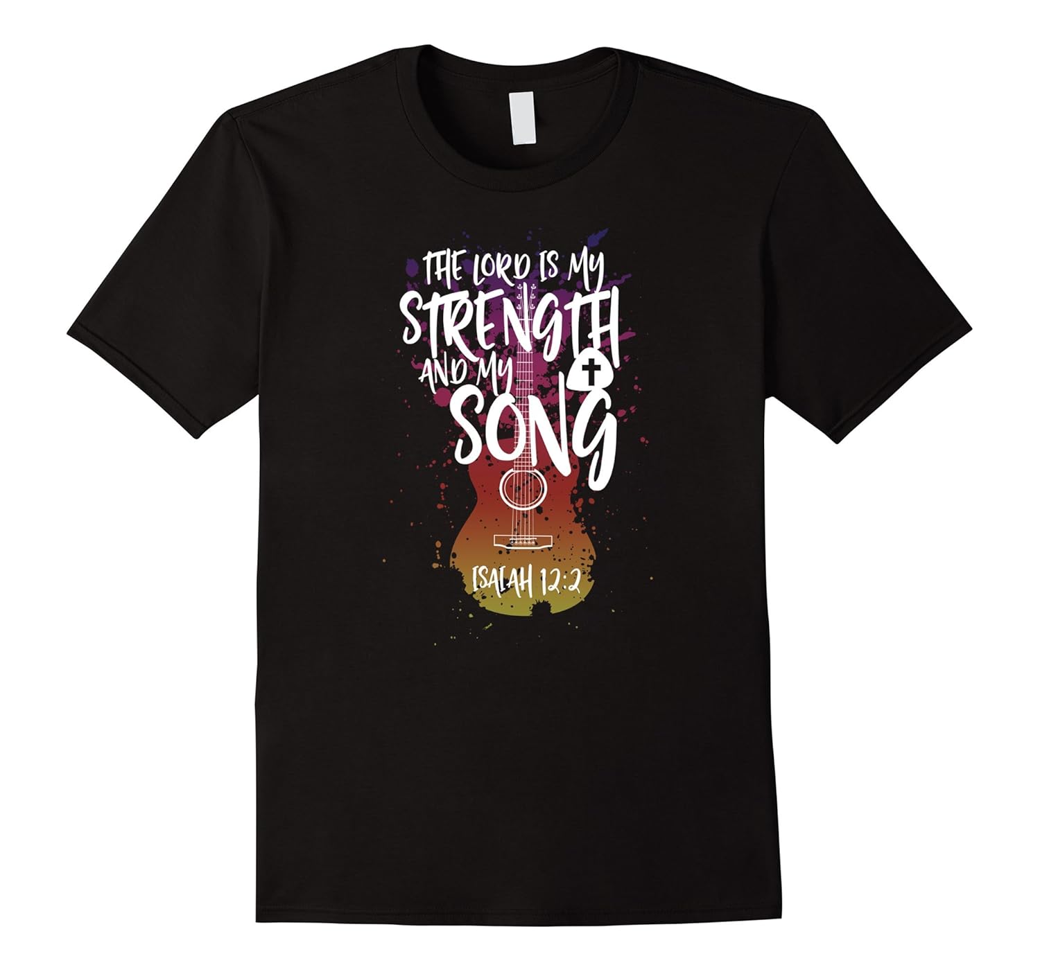 Solid colors: 100% Cotton; Heather Grey: 90% Cotton, 10% Polyester; All Other Heathers: 65% Cotton, 35% Polyester, Imported, Machine wash cold with like colors, dry low heat, This T-shirt is an awesome gift for any Christ-loving guitar player, The TShirt features Bible Verse Isaiah 12:2 The Lord Is My Strength And My Song, Lightweight, Classic fit, Double-needle sleeve and bottom hem