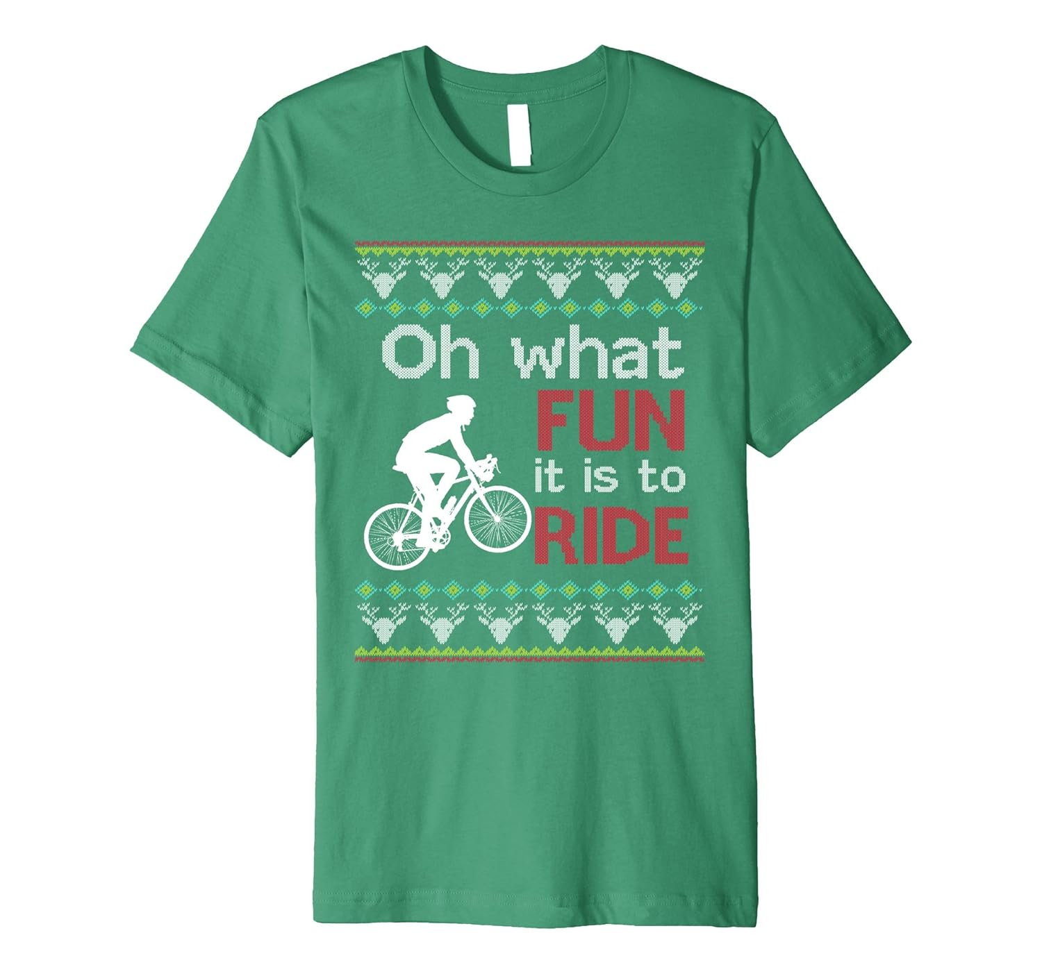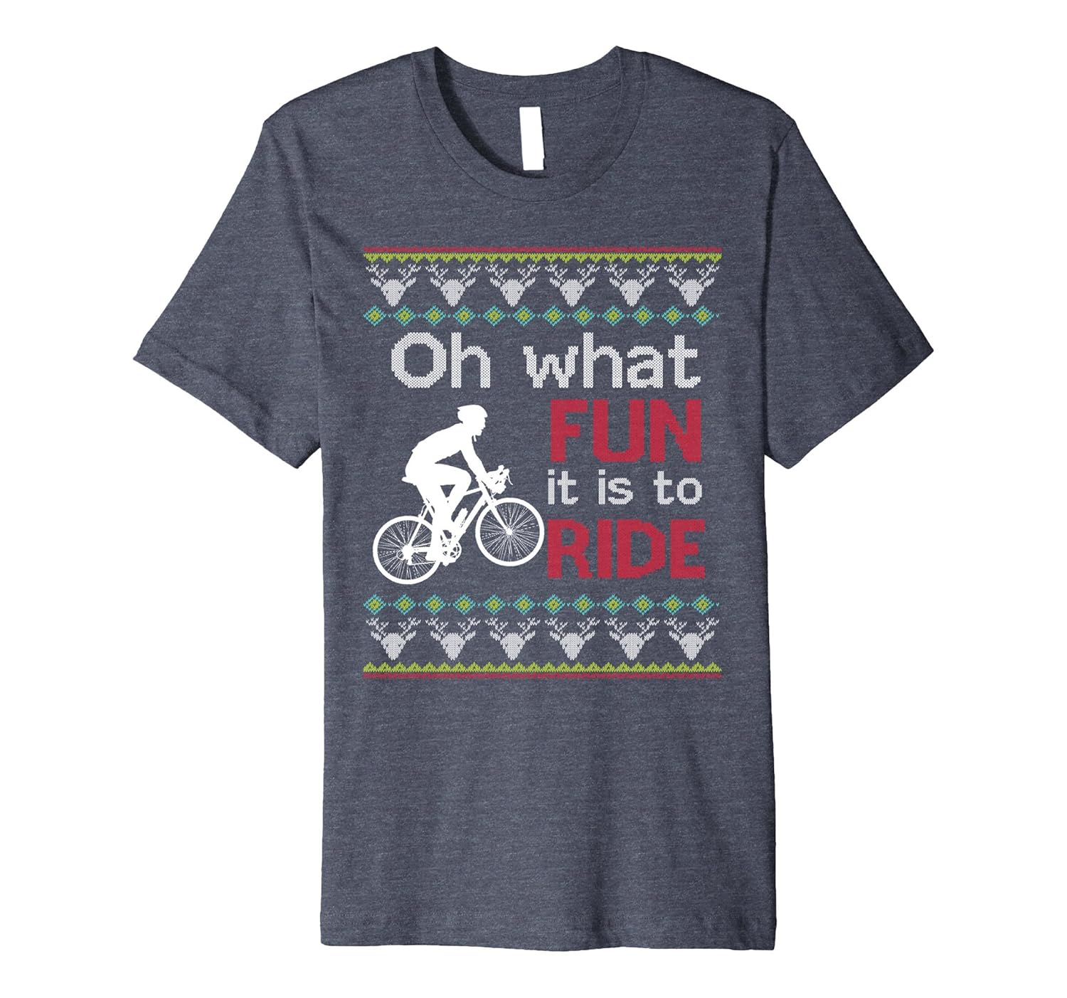 Solid colors: 100% Cotton; Heather Grey: 90% Cotton, 10% Polyester; All Other Heathers: 58% Cotton, 42% Polyester; Imported; Machine wash cold with like colors, dry low heat; This awesome ugly sweater shirt design is a great Christmas gift for men and women friends to show oh what fun it is to bike or bicycle during Xmas.; Fit: Slim (consider ordering a larger size for a looser fit); Greet friends this holiday with a ride on your bike on this shirt!; This premium t-shirt is made of lightweight fine jersey fabric