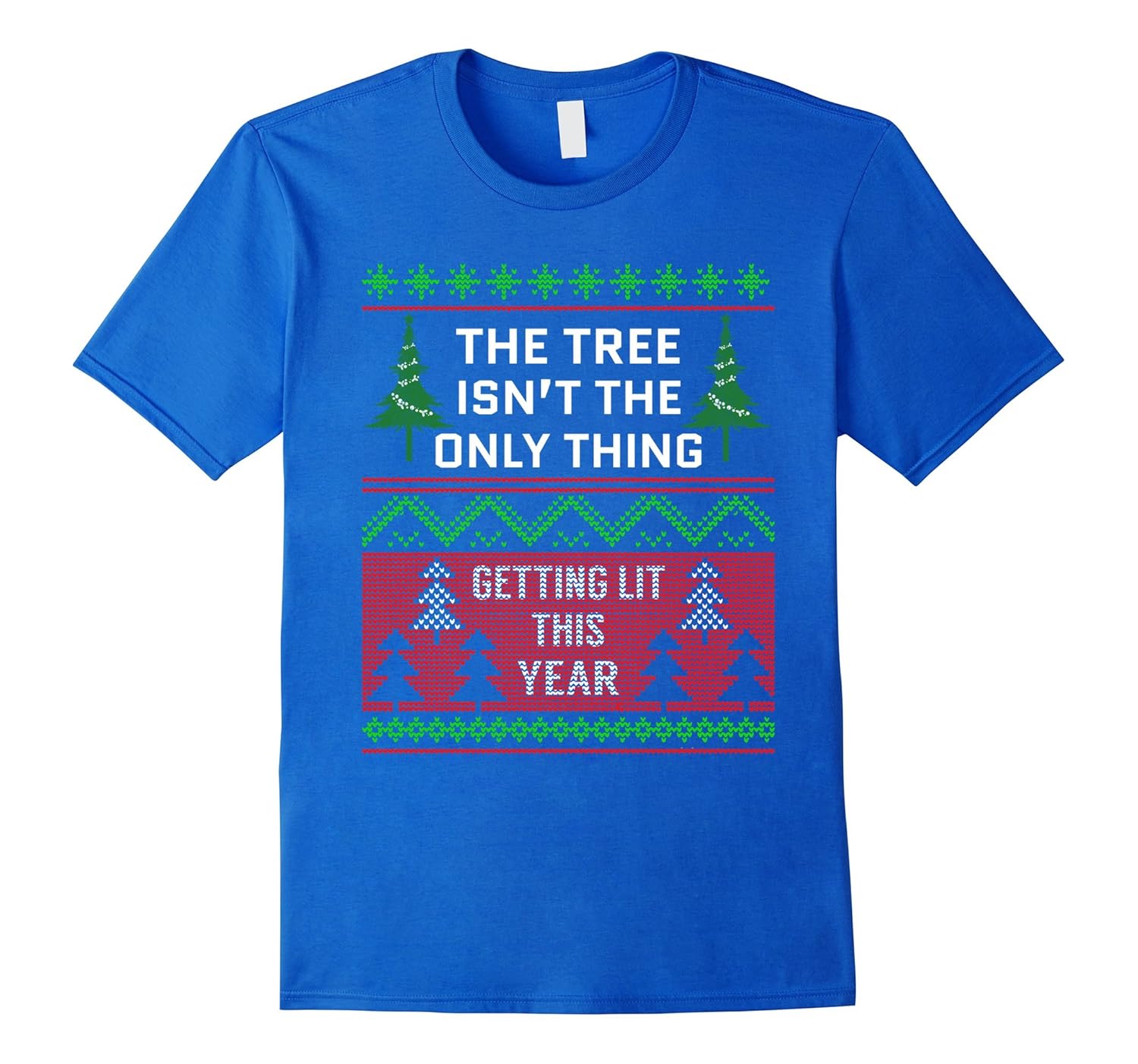 Solid colors: 100% Cotton; Heather Grey: 90% Cotton, 10% Polyester; All Other Heathers: 65% Cotton, 35% Polyester; Imported; Machine wash cold with like colors, dry low heat; Celebrate winter Christmas holiday traditions by wearing this ugly Christmas sweater shirt; The Christmas Tree Isnt The Only Thing Getting Lit This Year; Funny knit fabric pattern t shirt; Spruce fir tree, snowflakes and pattern decorations; Lightweight, Classic fit, Double-needle sleeve and bottom hem