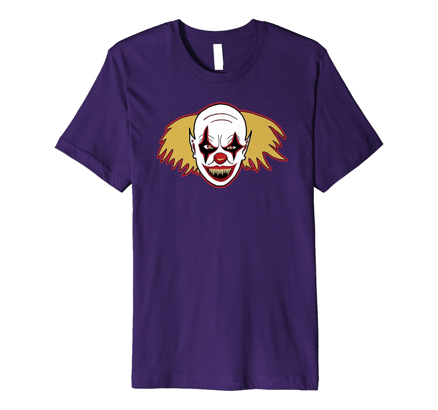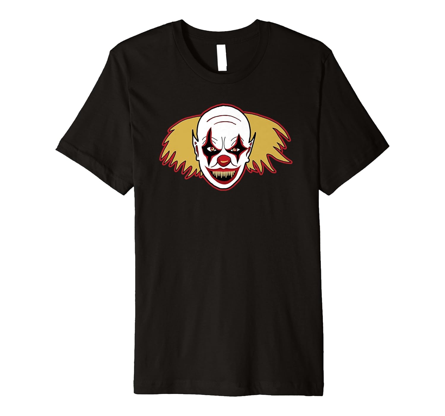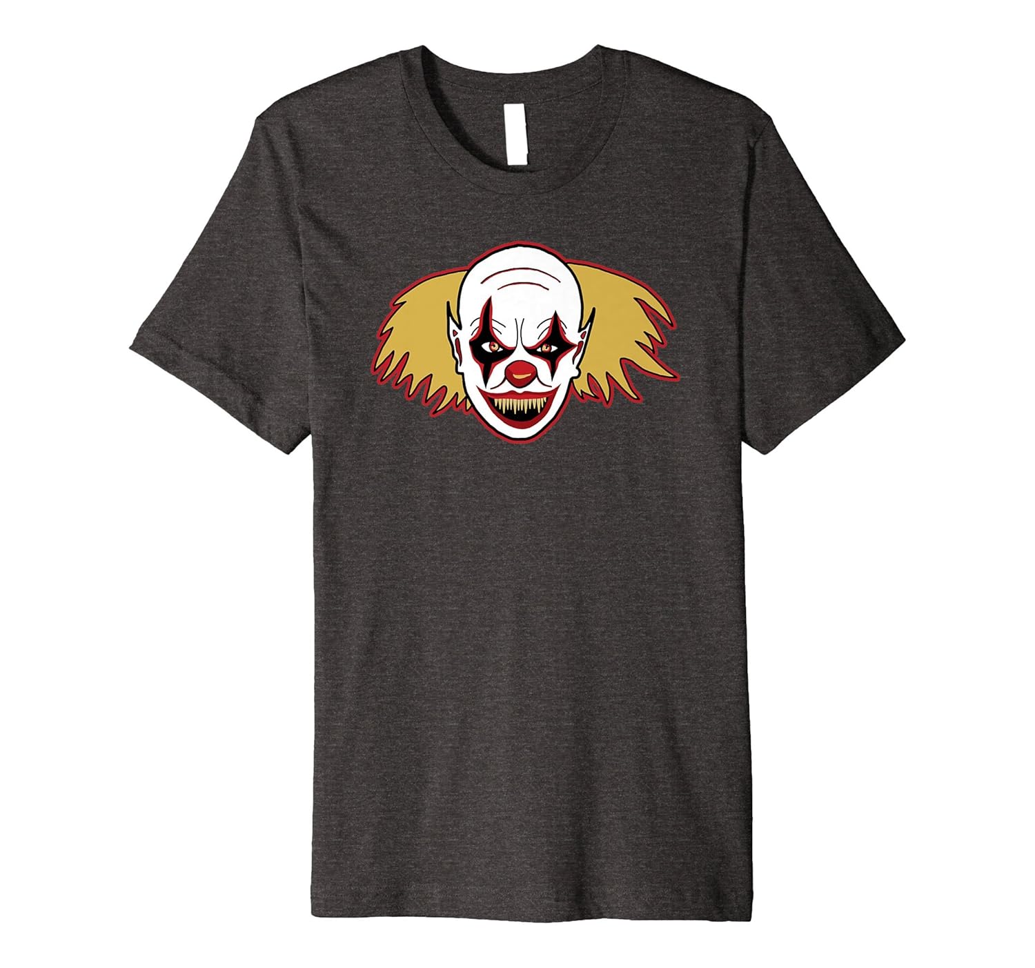 Solid colors: 100% Cotton; Heather Grey: 90% Cotton, 10% Polyester; All Other Heathers: 58% Cotton, 42% Polyester; Imported; Machine wash cold with like colors, dry low heat; Super scary hand drawn clown art design ready to wear anytime of year.; Perfect gift for thriller movie lovers, monster model builders, new big foot hunters and anyone who loves creepy clowns around!; This premium t-shirt is made of lightweight fine jersey fabric; Fit: Slim (consider ordering a larger size for a looser fit)