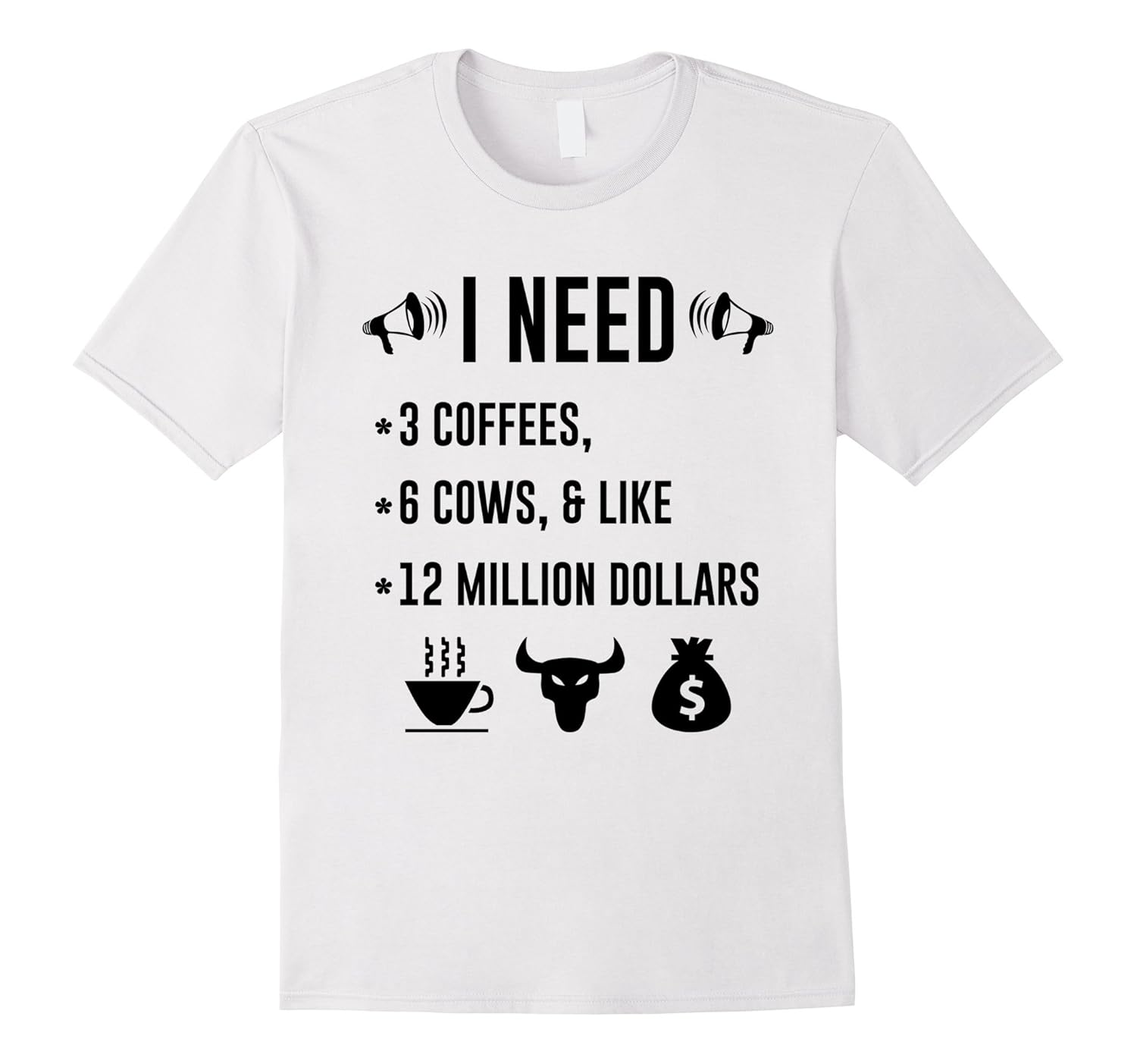 Solid colors: 100% Cotton; Heather Grey: 90% Cotton, 10% Polyester; All Other Heathers: 65% Cotton, 35% Polyester; Imported; Machine wash cold with like colors, dry low heat; Sometimes a little bit of humor can go a very long way, to start new friendships, make amends or to lighten the mood! If youre up for it, why not be that funny, jokester and wear this hilarious, I need 3 coffees, 6 cows Andamp; like 12 million dollars tee!; Look cool and funny in this epic and silly t-shirt. The ultimate nonsensical shirt, for the comedian in you. Perfect birthday, graduation and christmas gift. For a baggy fit order a size up.; Lightweight, Classic fit, Double-needle sleeve and bottom hem