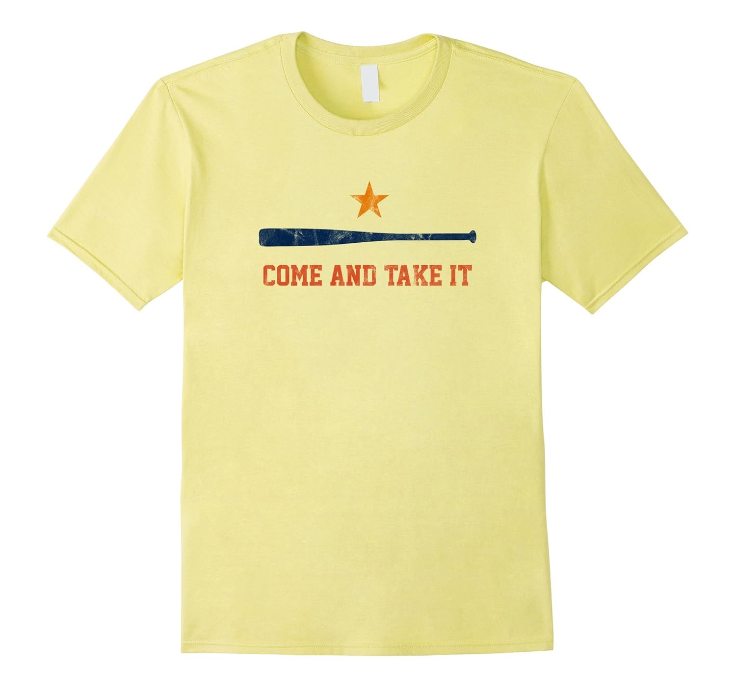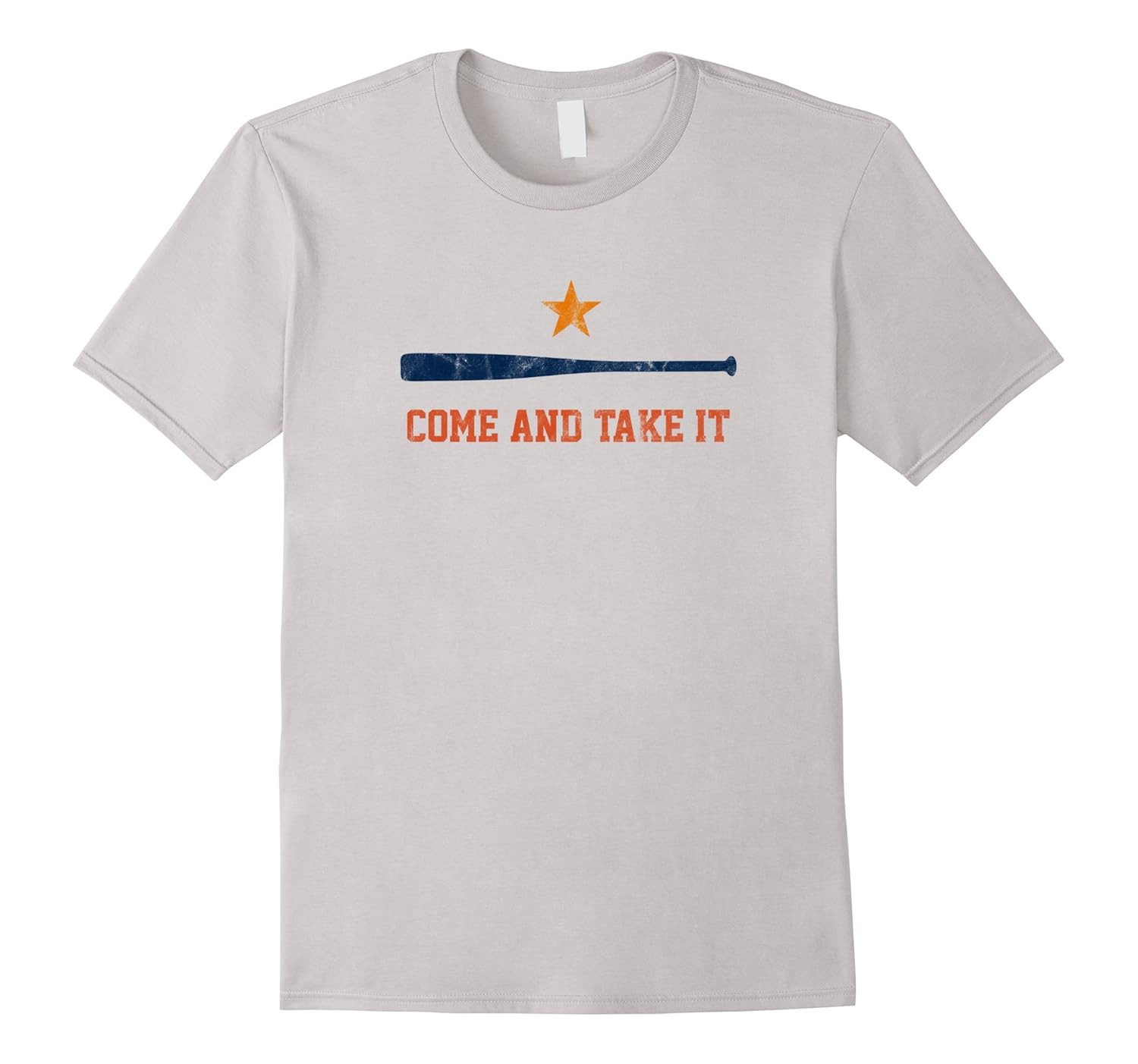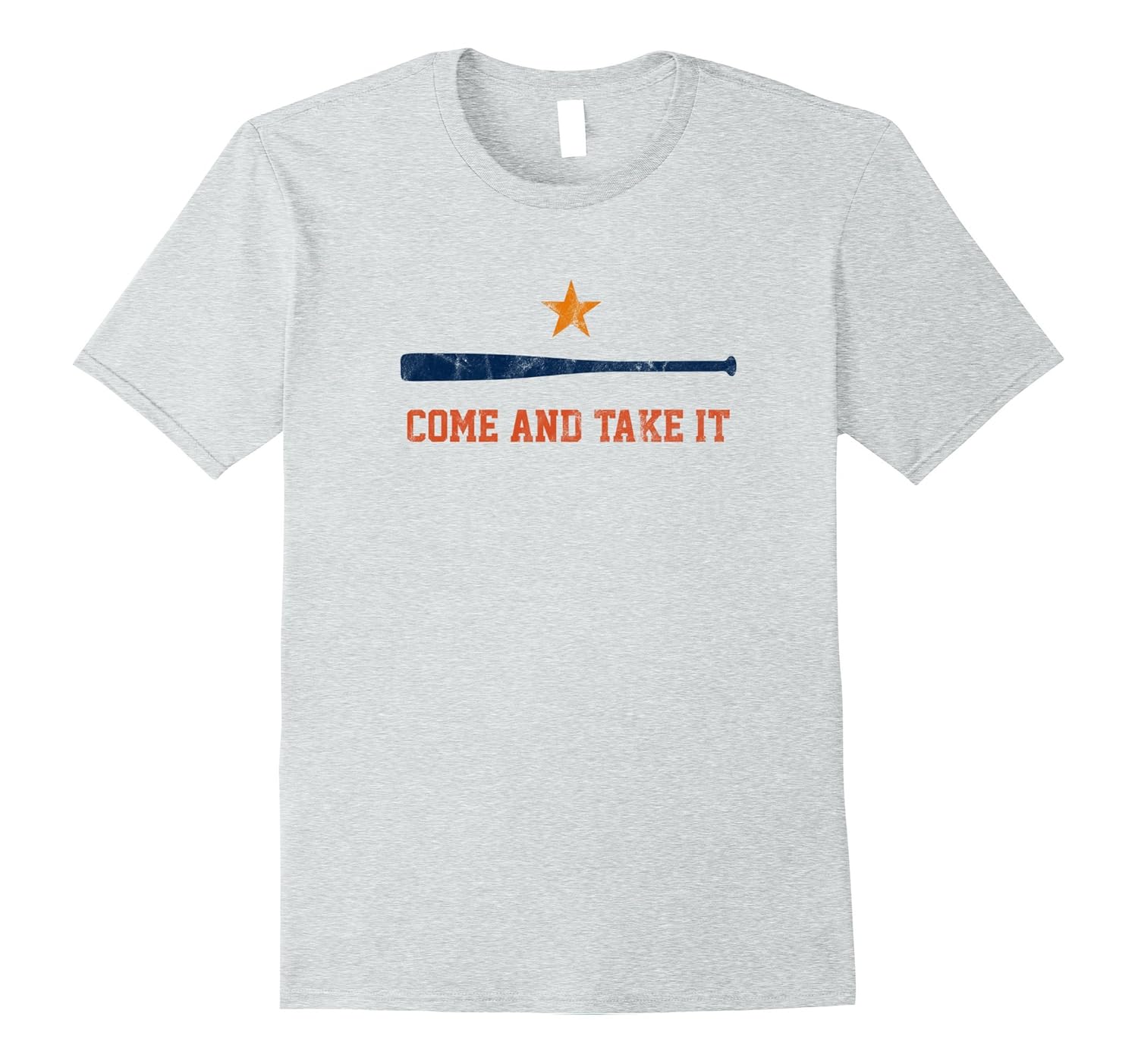 Solid colors: 100% Cotton; Heather Grey: 90% Cotton, 10% Polyester; All Other Heathers: 65% Cotton, 35% Polyester, Imported, Machine wash cold with like colors, dry low heat, Distressed Houston Baseball version of historic Texas battle slogan, Come and Take It, Custom graphic shirt for Houston fans with distressed, vintage, worn style baseball bat, star and slogan, Lightweight, Classic fit, Double-needle sleeve and bottom hem