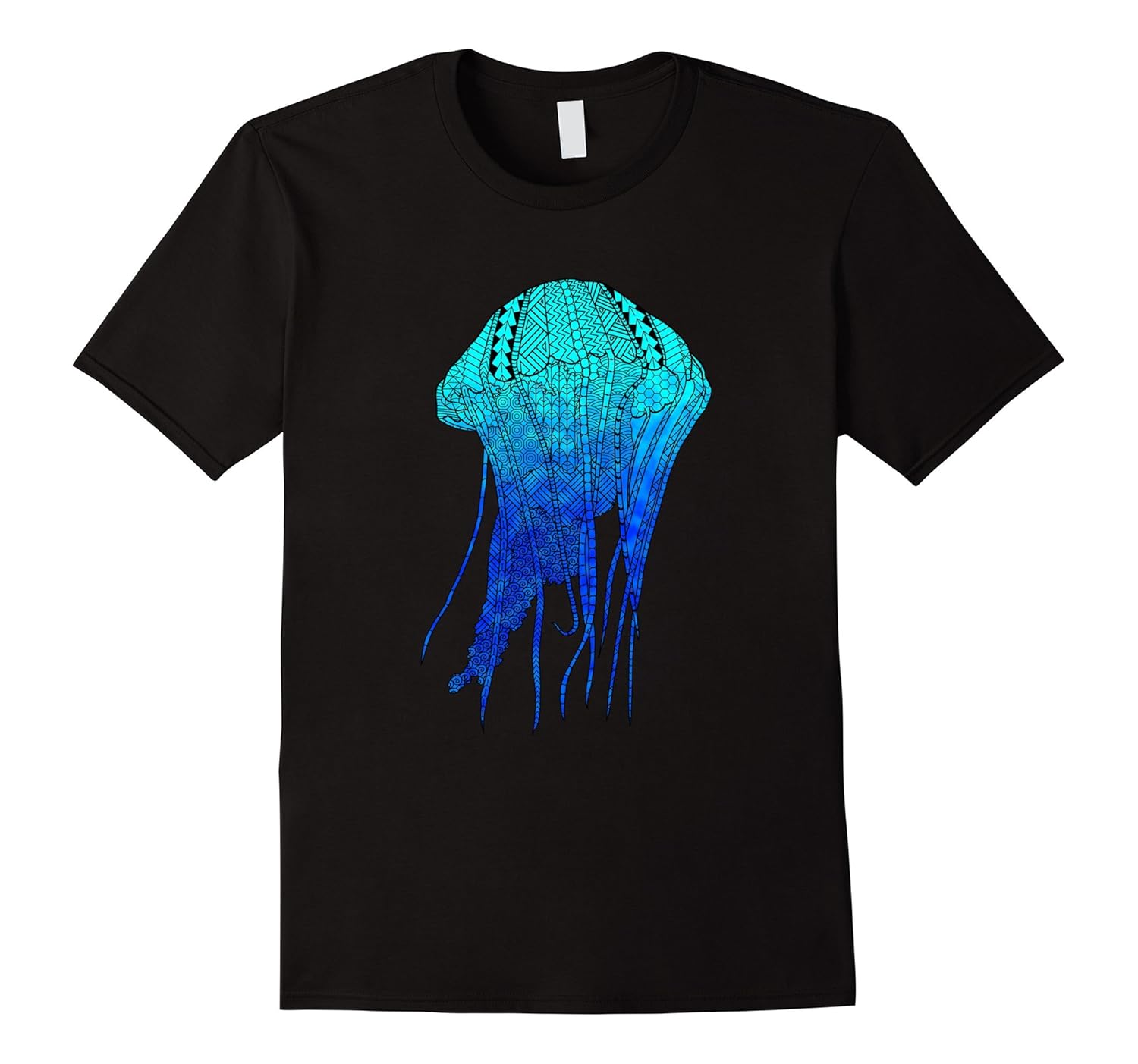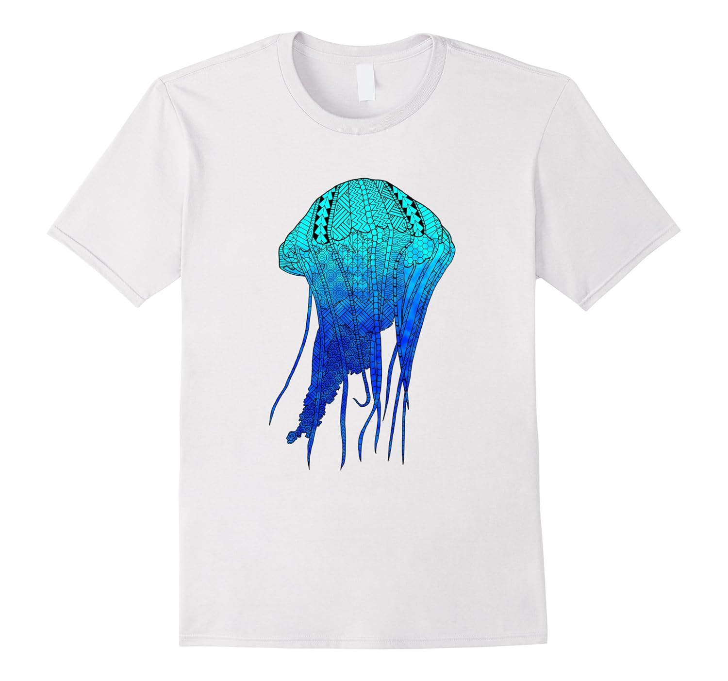 Solid colors: 100% Cotton; Heather Grey: 90% Cotton, 10% Polyester; All Other Heathers: 65% Cotton, 35% Polyester; Imported; Machine wash cold with like colors, dry low heat; A cool tribal jellyfish in ocean blues that makes a great gift for anyone who loves jellyfish and ocean life, from fisherman to ocean conservationists.; A tribal style jellyfish artwork for all ocean marine life and sea animals fans.; Lightweight, Classic fit, Double-needle sleeve and bottom hem
