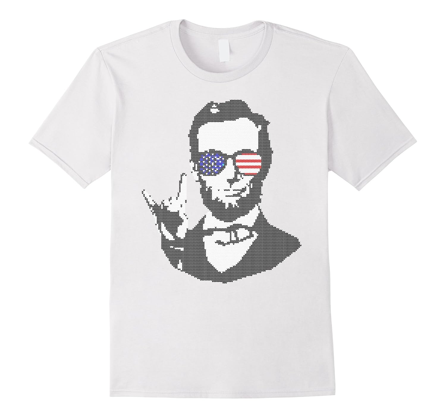 Solid colors: 100% Cotton; Heather Grey: 90% Cotton, 10% Polyester; All Other Heathers: 65% Cotton, 35% Polyester; Imported; Machine wash cold with like colors, dry low heat; Are you looking for a funny original Ugly Sweater Christmas? Look no further than this Abraham Lincoln funny shirt, featuring honest abe with an american flag sunglasses! Perfect for 4th of July, Christmas and any occasion; Great gift for men, women and kids; Lightweight, Classic fit, Double-needle sleeve and bottom hem