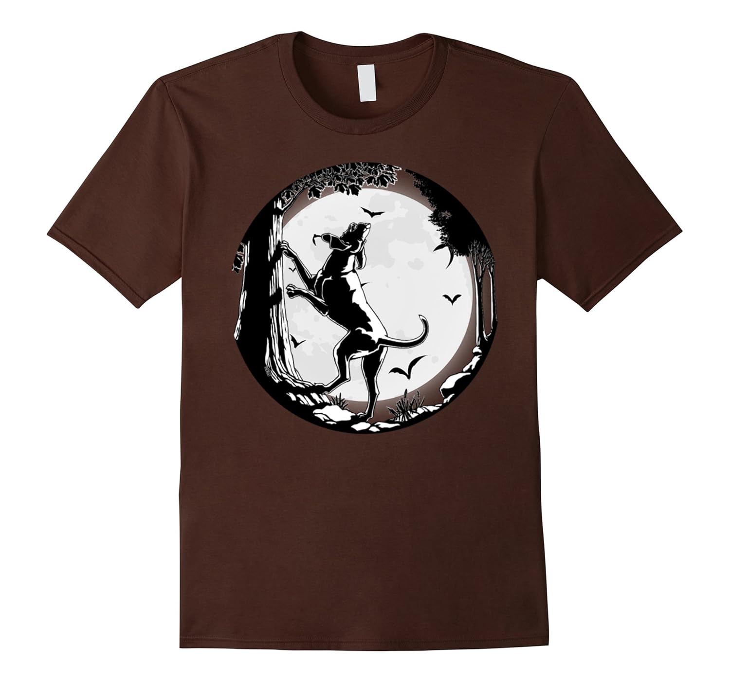 Solid colors: 100% Cotton; Heather Grey: 90% Cotton, 10% Polyester; All Other Heathers: 65% Cotton, 35% Polyester; Imported; Machine wash cold with like colors, dry low heat; coonhound hunting dog hunt bats under halloween moon tshirt, dog shirt, hunting shirt, coonhound shirt, bat shirt, moon shirt, halloween; hound dog, coonhound, hunting dog, coonhound treeing, animal, pet, bat, gift, shadow, moon, darknight, halloween; Lightweight, Classic fit, Double-needle sleeve and bottom hem