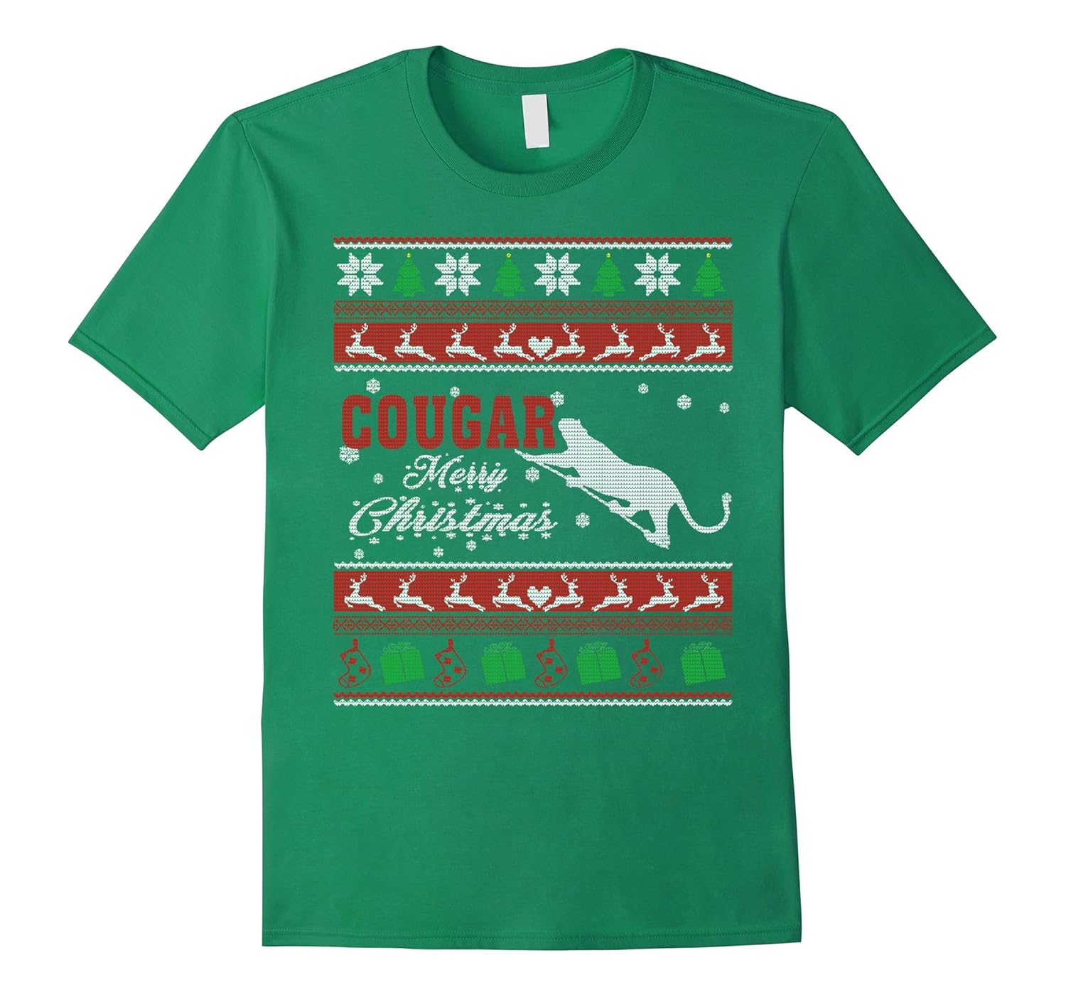 Solid colors: 100% Cotton; Heather Grey: 90% Cotton, 10% Polyester; All Other Heathers: 65% Cotton, 35% Polyester; Imported; Machine wash cold with like colors, dry low heat; Cougar Ugly Christmas tshirt; Cougar Ugly Christmas Sweater tshirt; Lightweight, Classic fit, Double-needle sleeve and bottom hem