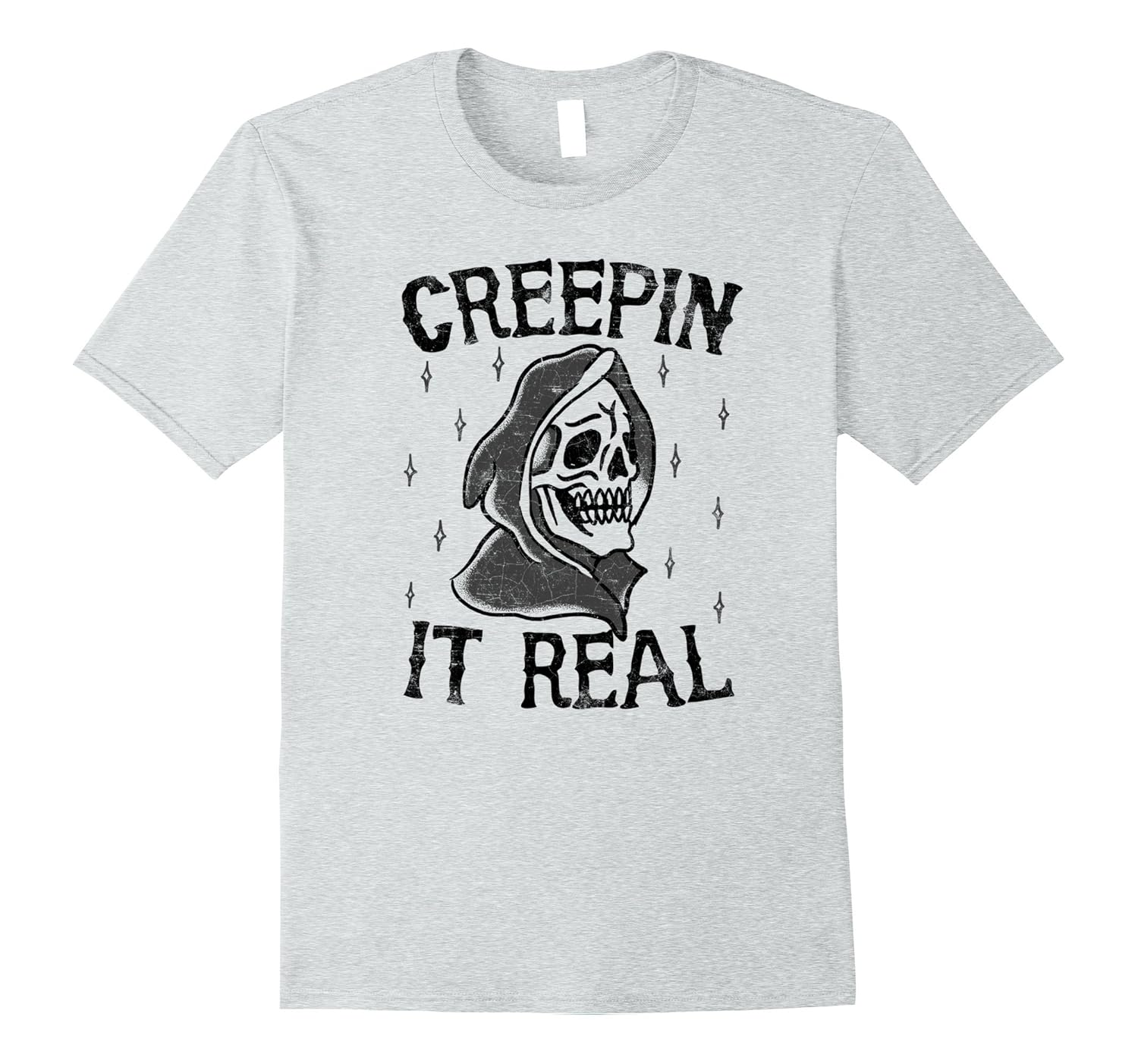 Solid colors: 100% Cotton; Heather Grey: 90% Cotton, 10% Polyester; All Other Heathers: 50% Cotton, 50% Polyester; Imported; Machine wash cold with like colors, dry low heat; Spooky hand drawn distressed design Creepin It Real Vintage tattoo style graphic. Funny mens Halloween shirt.; See more great adult halloween shirts by clicking on our brand name.; Lightweight, Classic fit, Double-needle sleeve and bottom hem