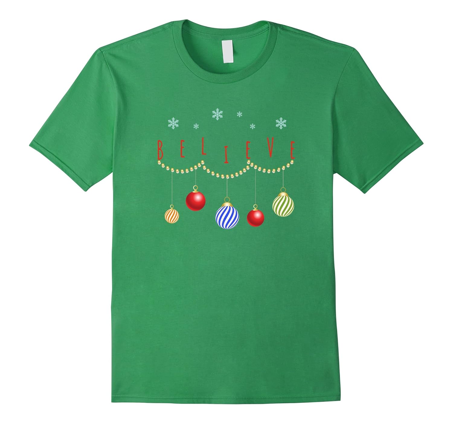 Solid colors: 100% Cotton; Heather Grey: 90% Cotton, 10% Polyester; All Other Heathers: 65% Cotton, 35% Polyester; Imported; Machine wash cold with like colors, dry low heat; This Cute tee features colorful retro ornaments, gold beads and snowflakes with the word BELIEVE. Perfect Christmas gift or Christmas eve pajama sleeping tee for kids and adults who BELIEVE Santa will bring them presents in the morning!; Believe in Santa and his reindeer, Christmas miracles and Christmas magic in this cheerful holiday tee.; Lightweight, Classic fit, Double-needle sleeve and bottom hem